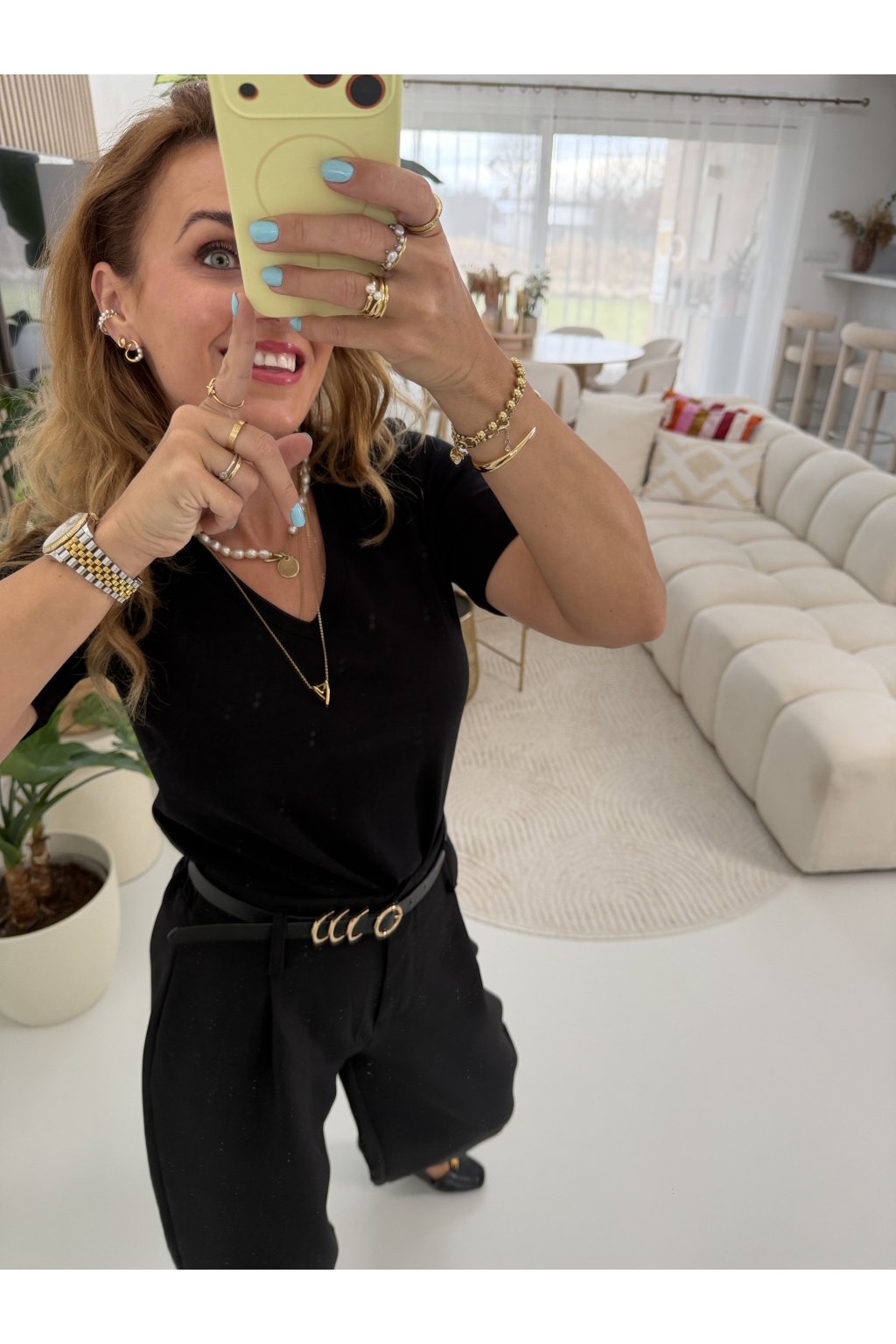 Nadčasové tričko VIBE V s výstřihem do V, které by nemělo chybět v žádném šatníku. Příjemný, měkký materiál krásně splývá, drží tvar a pohodlně se nosí celý den. Výstřih do Véčka opticky prodlužuje krk, zjemňuje dekolt a dodává ženský, elegantní vzhled i obyčejnému outfitu. Skvěle se kombinuje s džíny, kalhotami i kraťasami. Pro představu mám na sobě velikost S.