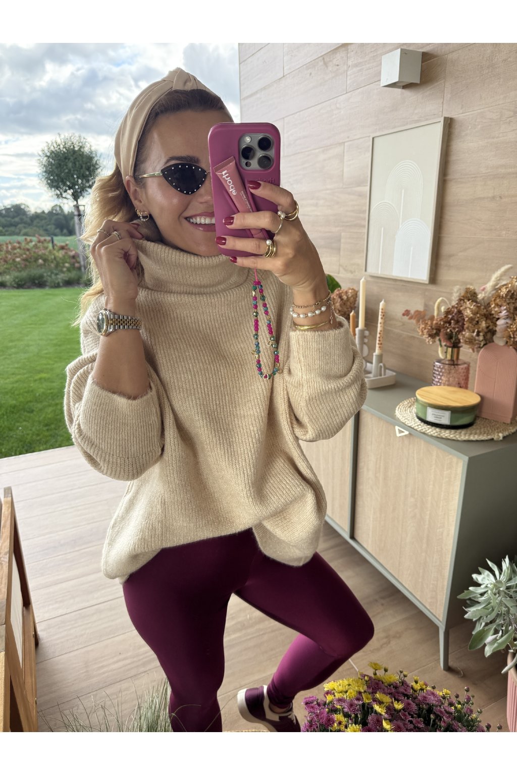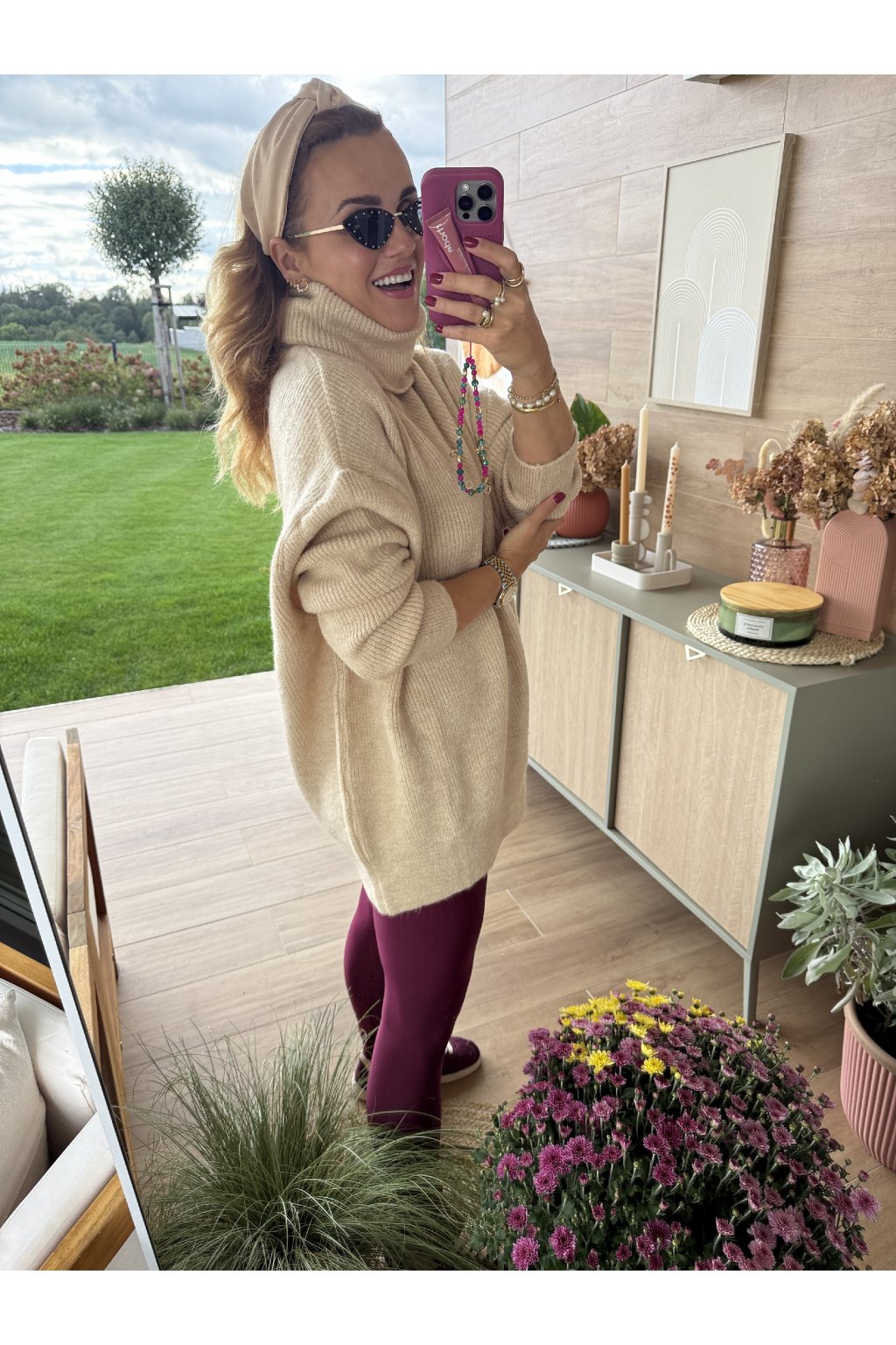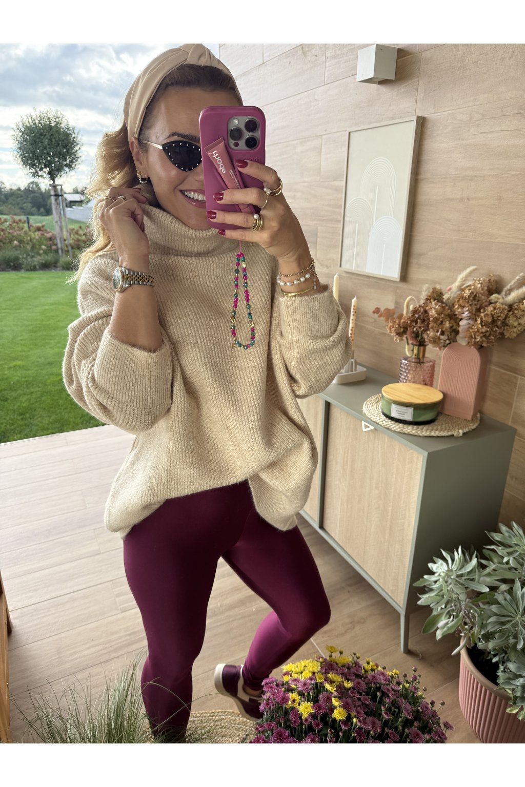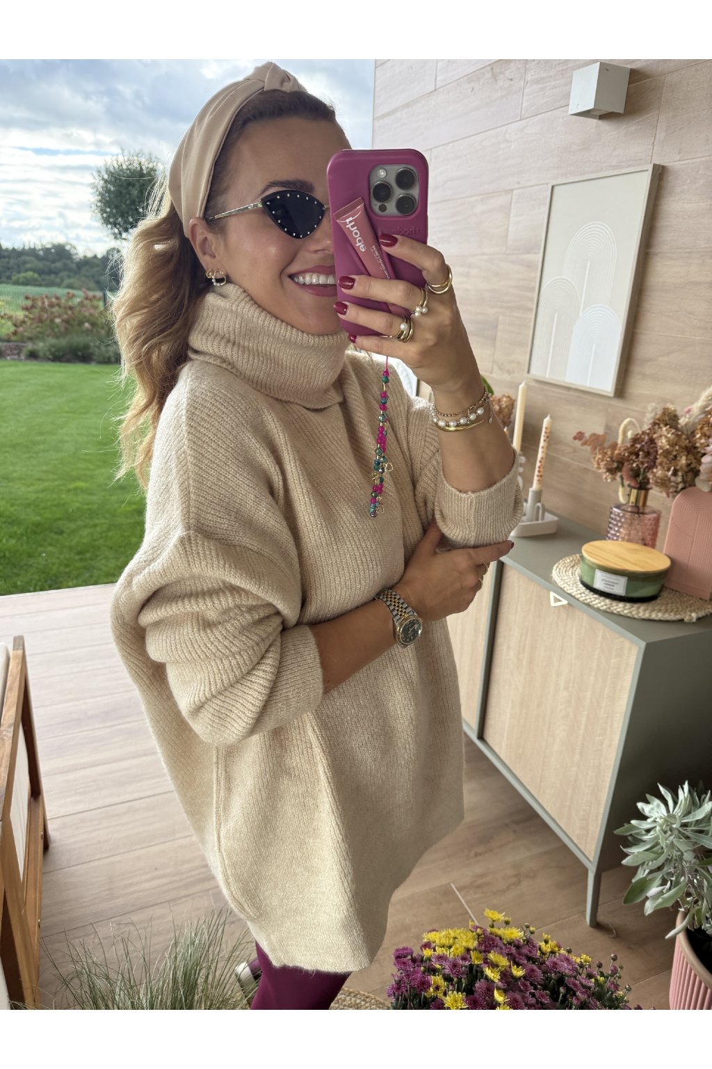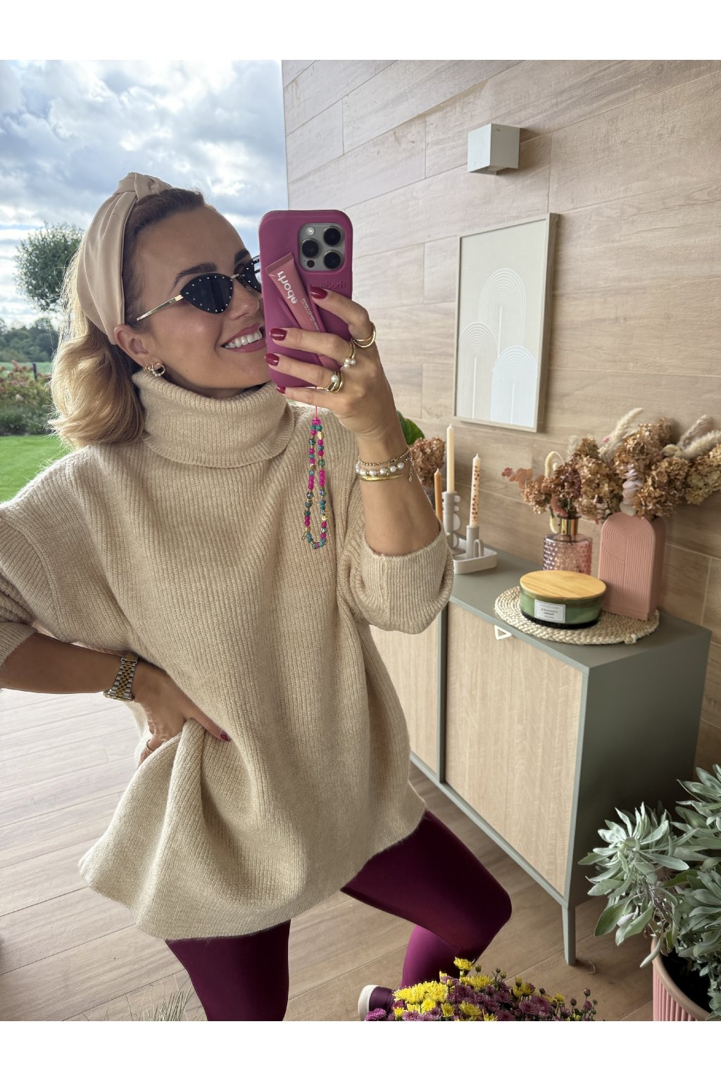 Zamilujte se do ležérní elegance! Tento měkoučký oversize svetr s rolákem je ideální volbou pro chladné dny – zahřeje, ale přitom vypadá stylově. Snadno ho zkombinujete s džínami, legínami i elegantními kalhotami. Sedne od S až do menší velikosti XL.