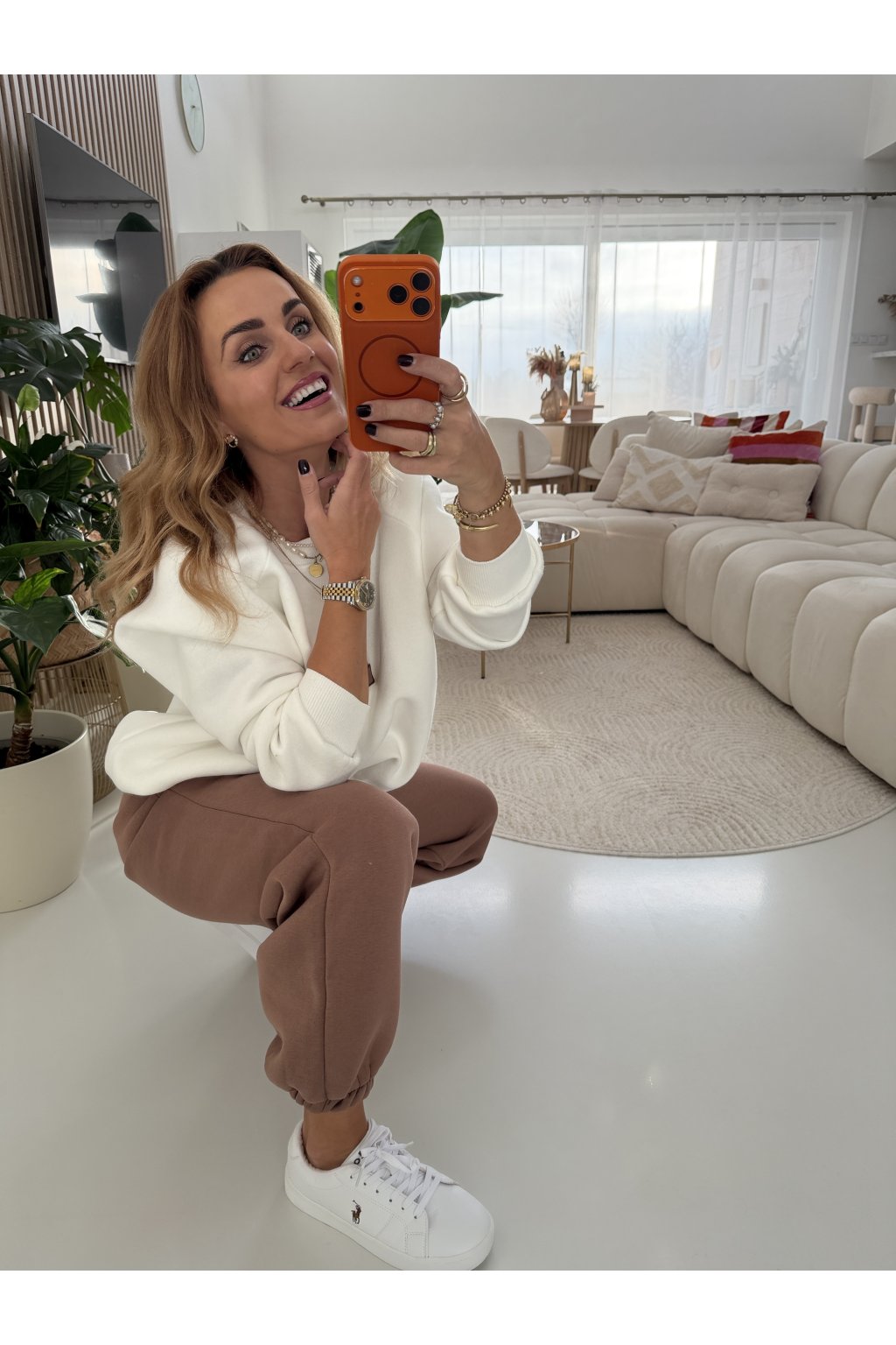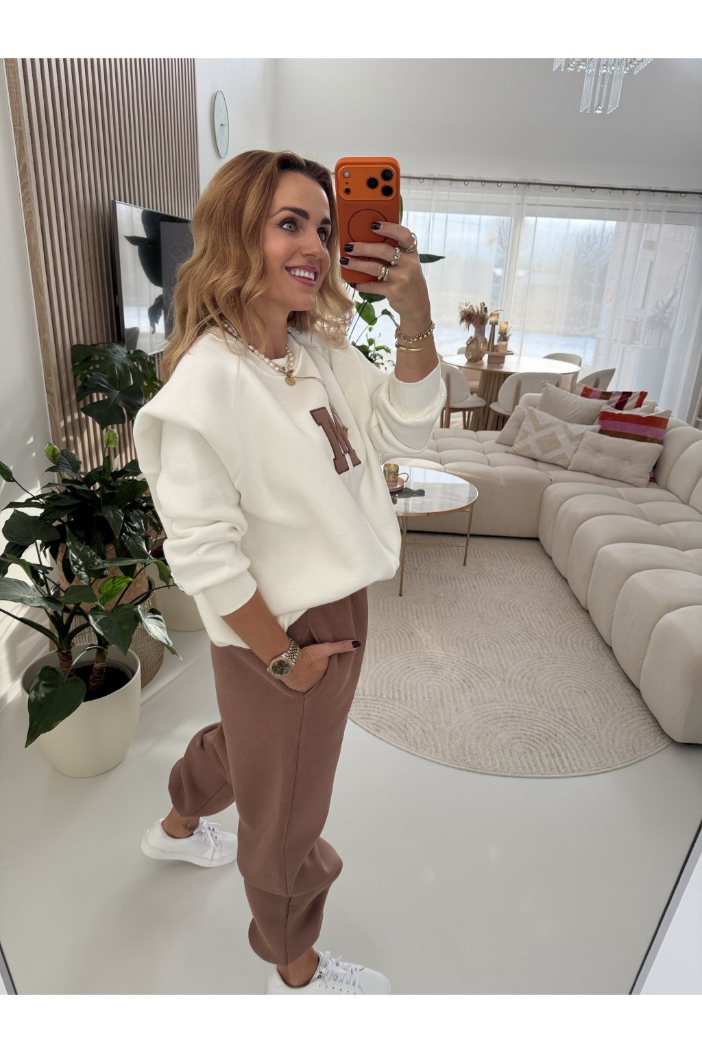 Teplákovka je zateplená jemným mikroplyšem, díky kterému je krásně hřejivá a maximálně pohodlná. Tepláky mají gumu v pase i kolem kotníků, takže se snadno přizpůsobí postavě a délku lze upravit. Na přední straně je výrazné písmeno M jako máma. Ideální na každodenní nošení, doma i venku. Samozřejmě se dá minima i tepláky nosit samostatně. Díky střihu sedne od velikosti S až do menší velikosti L. Pro představu měřím 163cm a vážím 59kg.