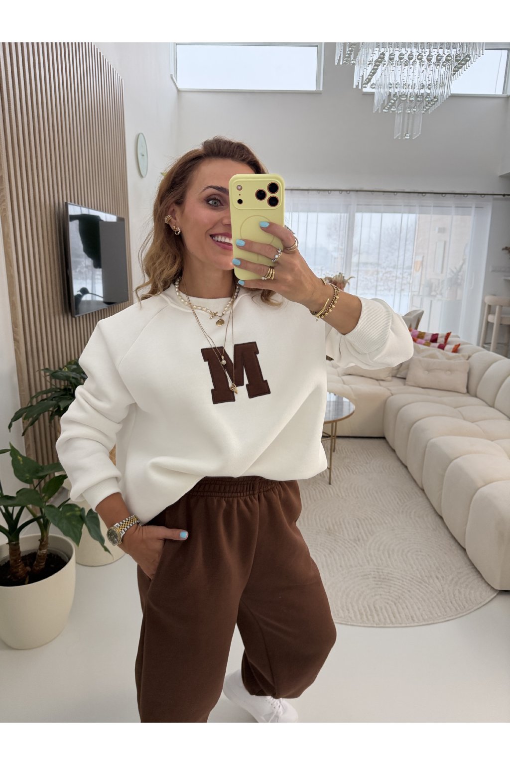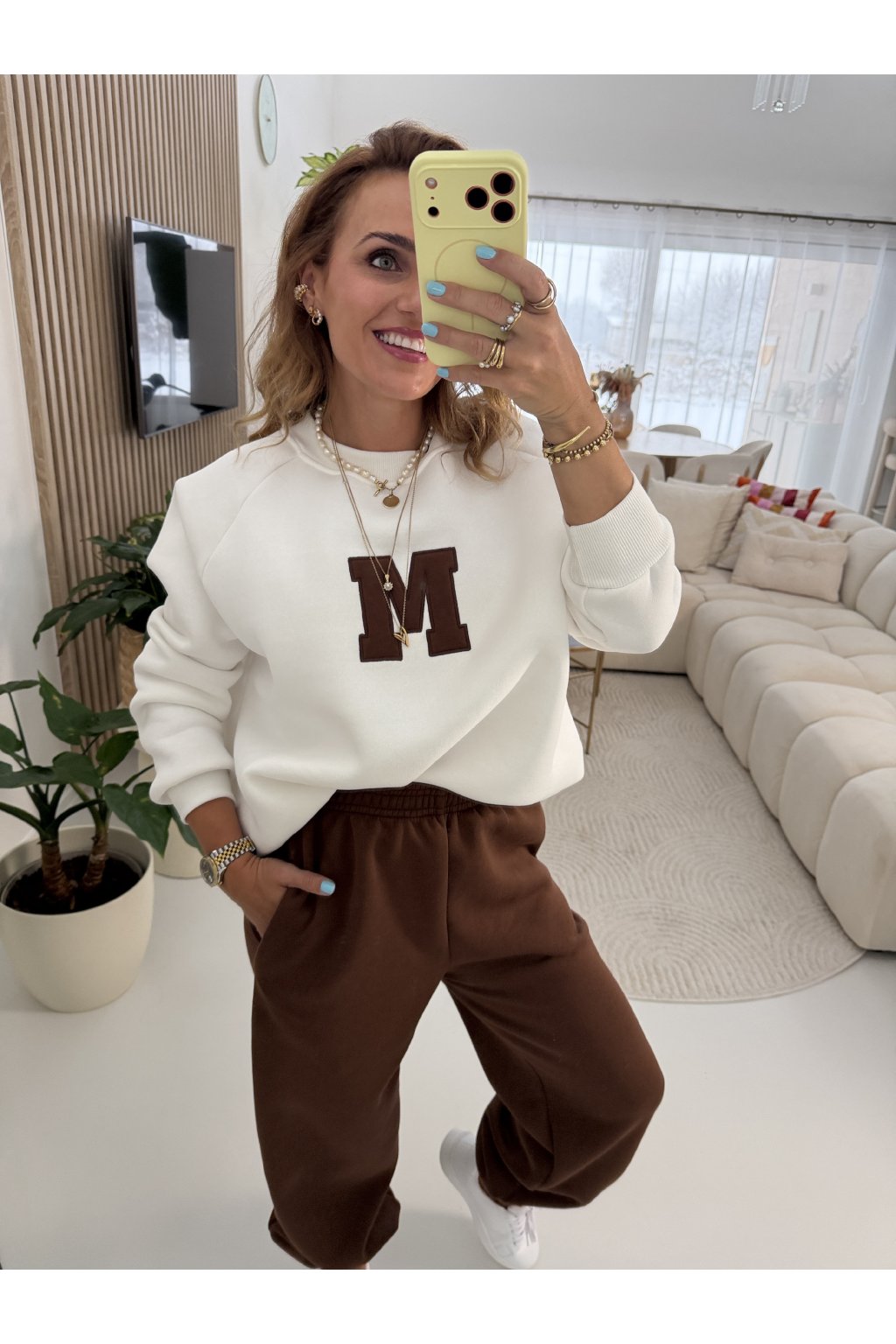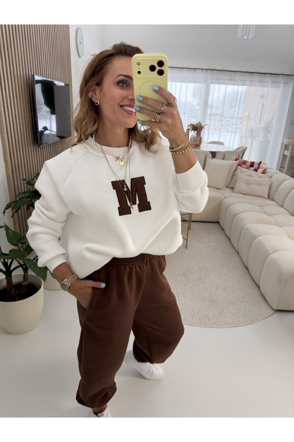 Teplákovka je zateplená jemným mikroplyšem, díky kterému je krásně hřejivá a maximálně pohodlná. Tepláky mají gumu v pase i kolem kotníků, takže se snadno přizpůsobí postavě a délku lze upravit. Na přední straně je výrazné písmeno M jako máma. Ideální na každodenní nošení, doma i venku. Samozřejmě se dá minima i tepláky nosit samostatně. Díky střihu sedne od velikosti S až do menší velikosti L. Pro představu měřím 163cm a vážím 59kg.