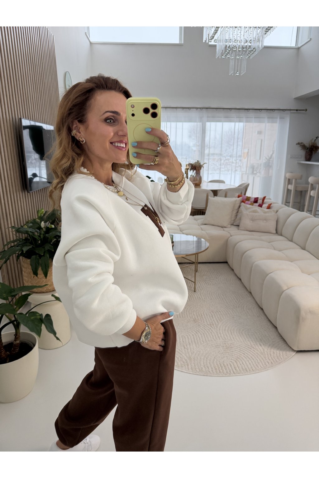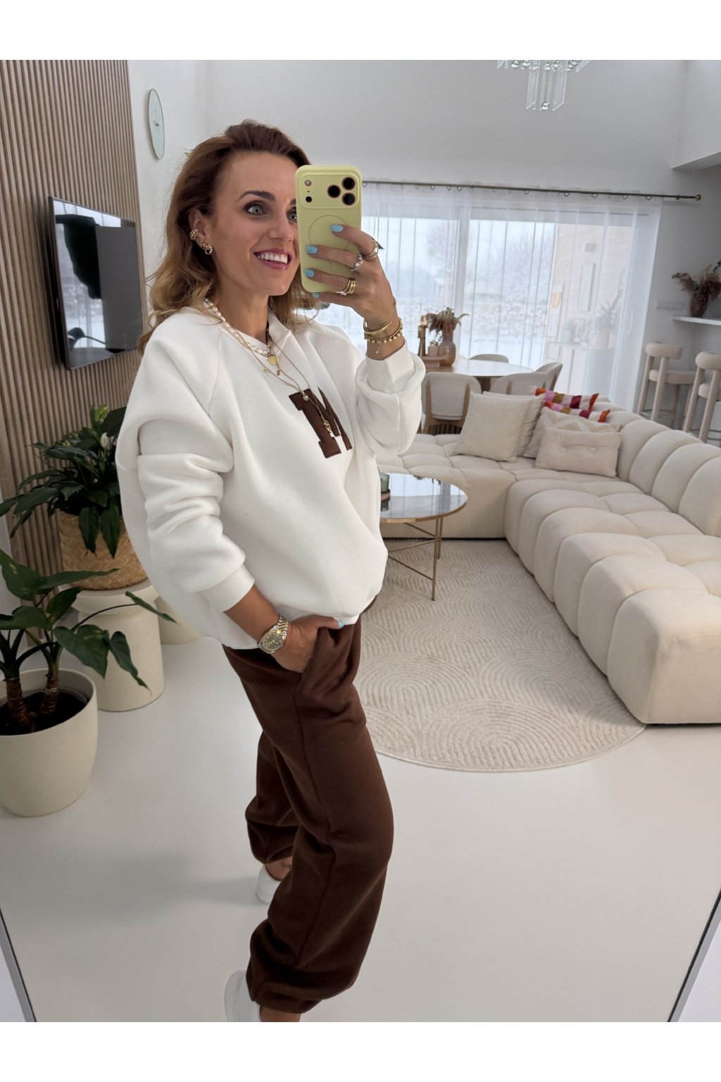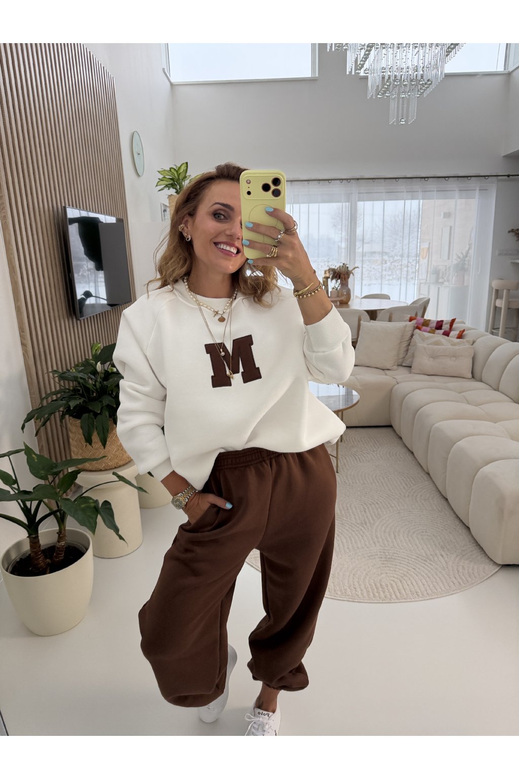 Teplákovka je zateplená jemným mikroplyšem, díky kterému je krásně hřejivá a maximálně pohodlná. Tepláky mají gumu v pase i kolem kotníků, takže se snadno přizpůsobí postavě a délku lze upravit. Na přední straně je výrazné písmeno M jako máma. Ideální na každodenní nošení, doma i venku. Samozřejmě se dá minima i tepláky nosit samostatně. Díky střihu sedne od velikosti S až do menší velikosti L. Pro představu měřím 163cm a vážím 59kg.