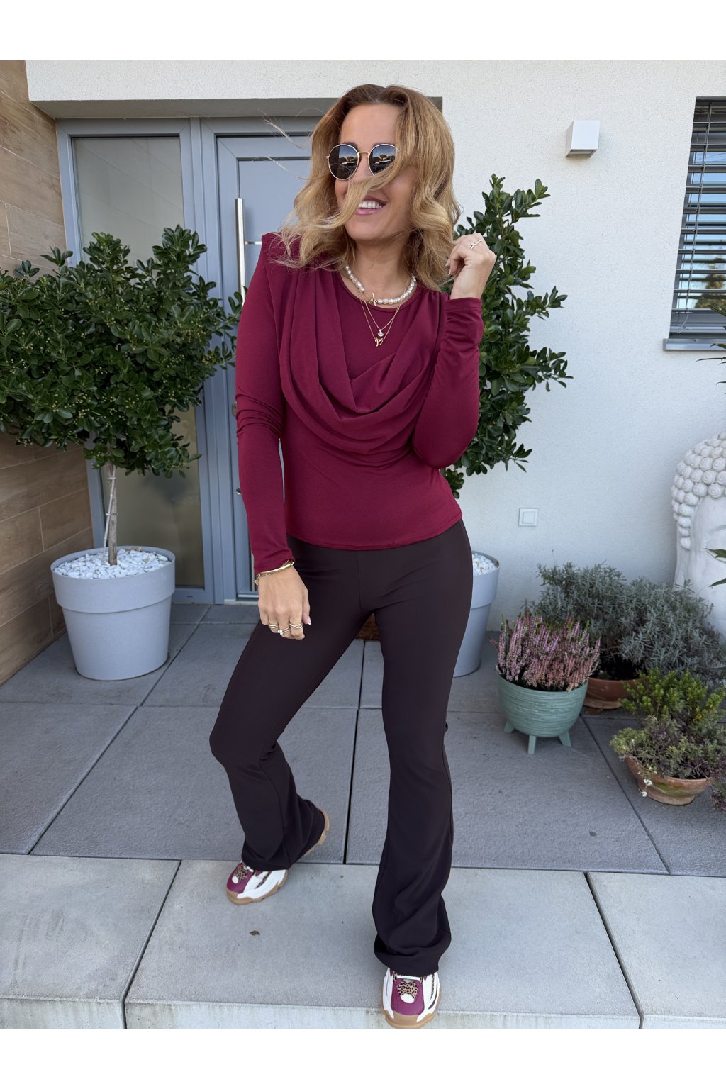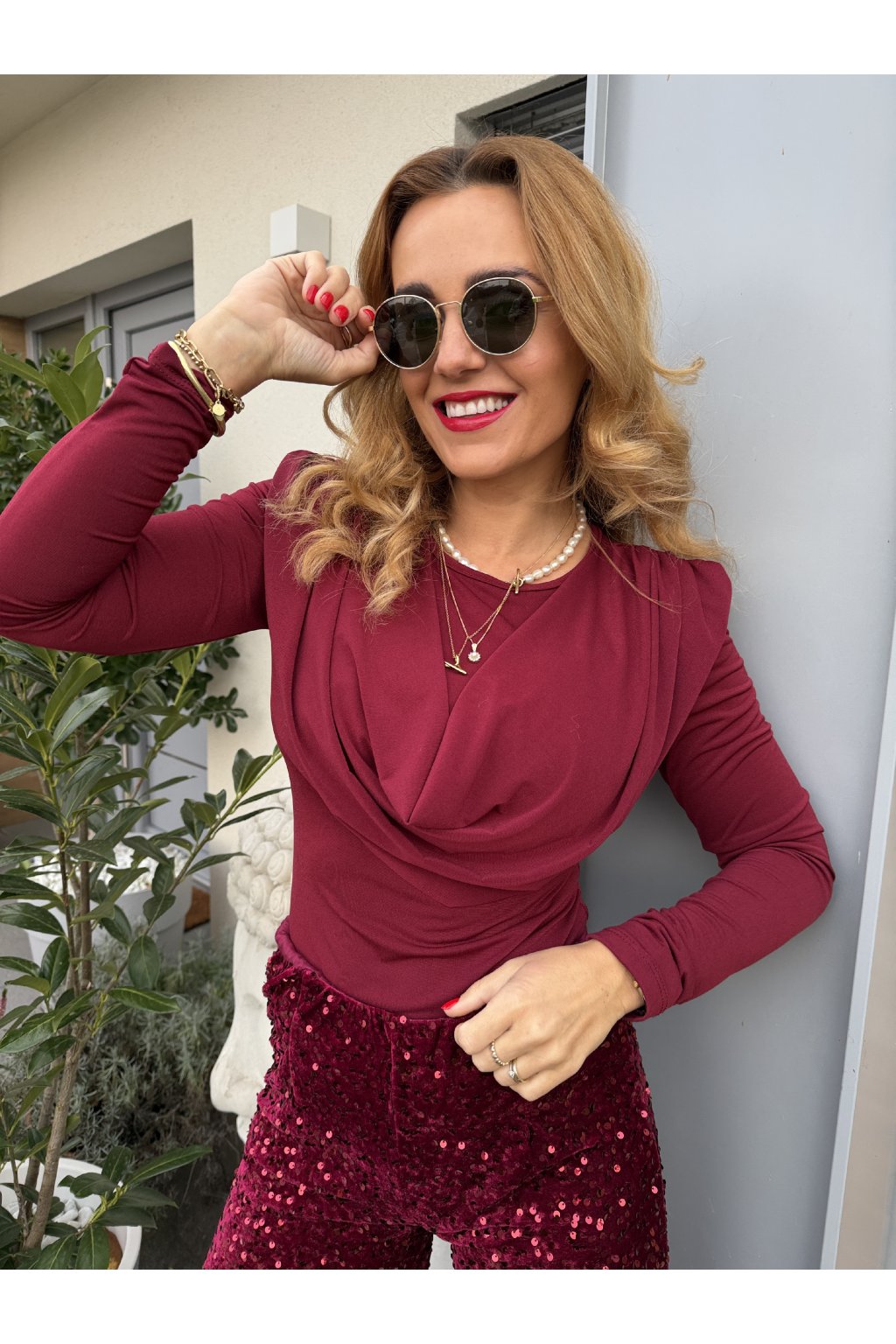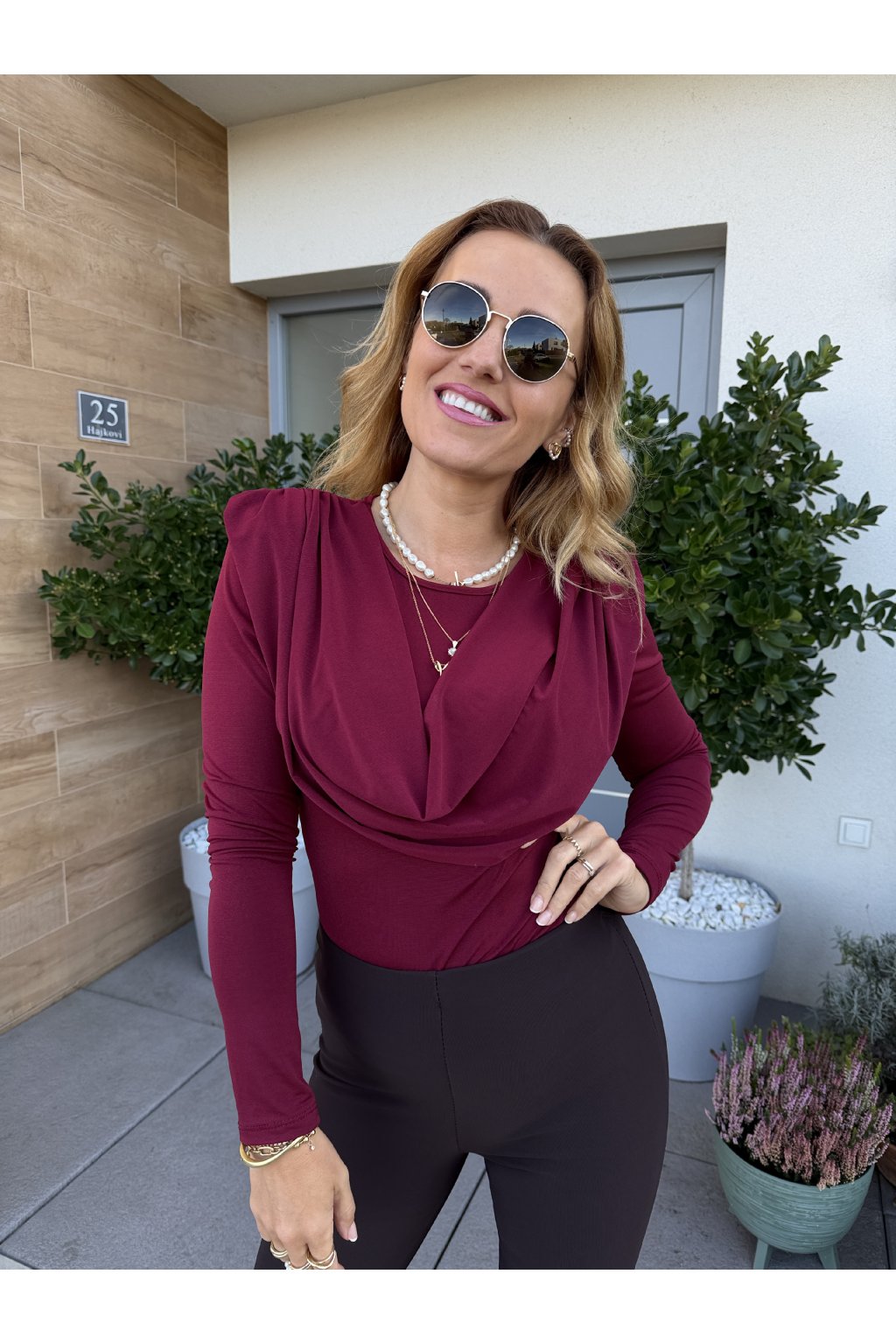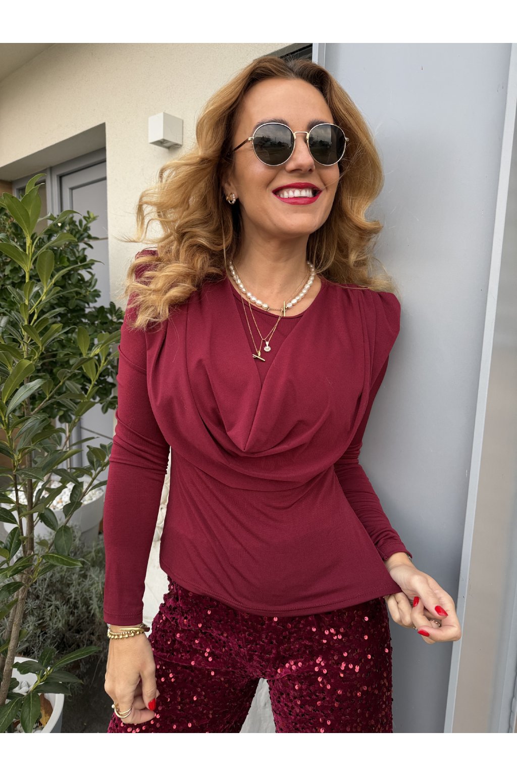 Stylový a ženský top z příjemného pružného materiálu, který se krásně přizpůsobí postavě a perfektně sedí až do velikosti M. Hladká látka je pohodlná na nošení, nekrabatí se a elegantní vodopádový výstřih dodává outfitu šmrnc.