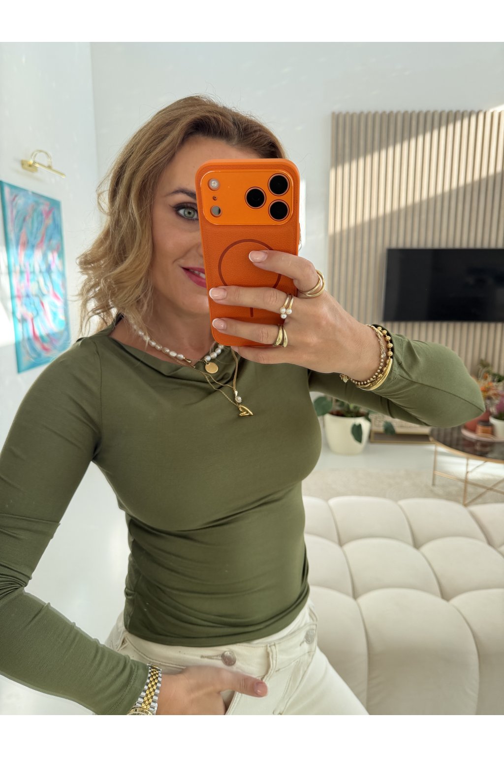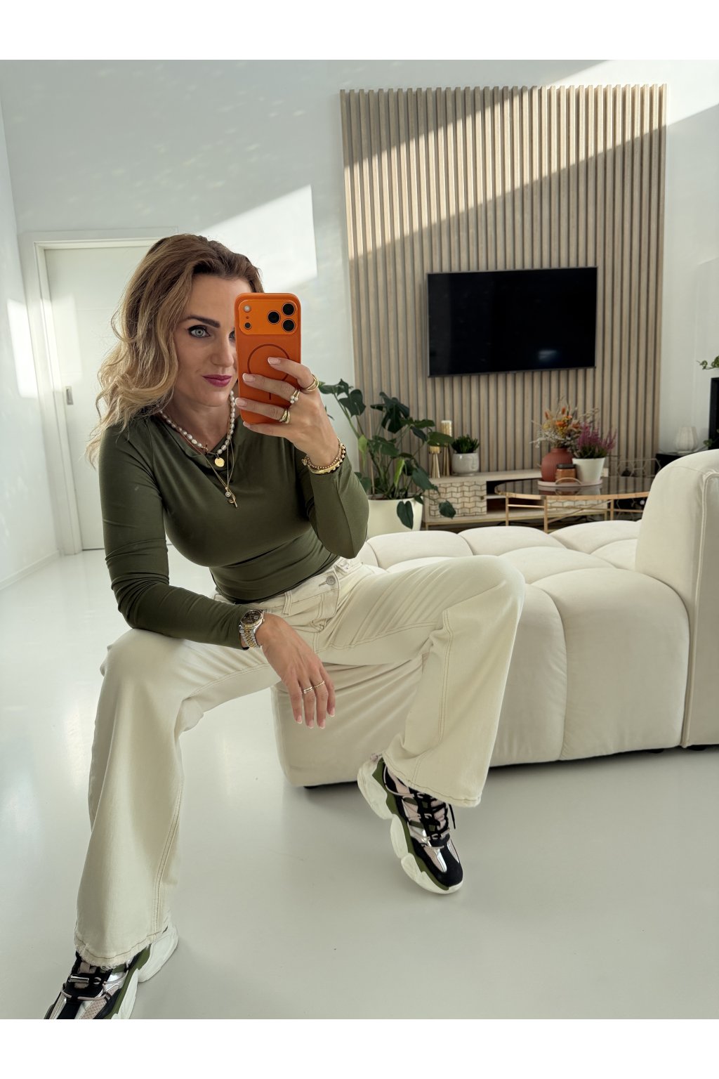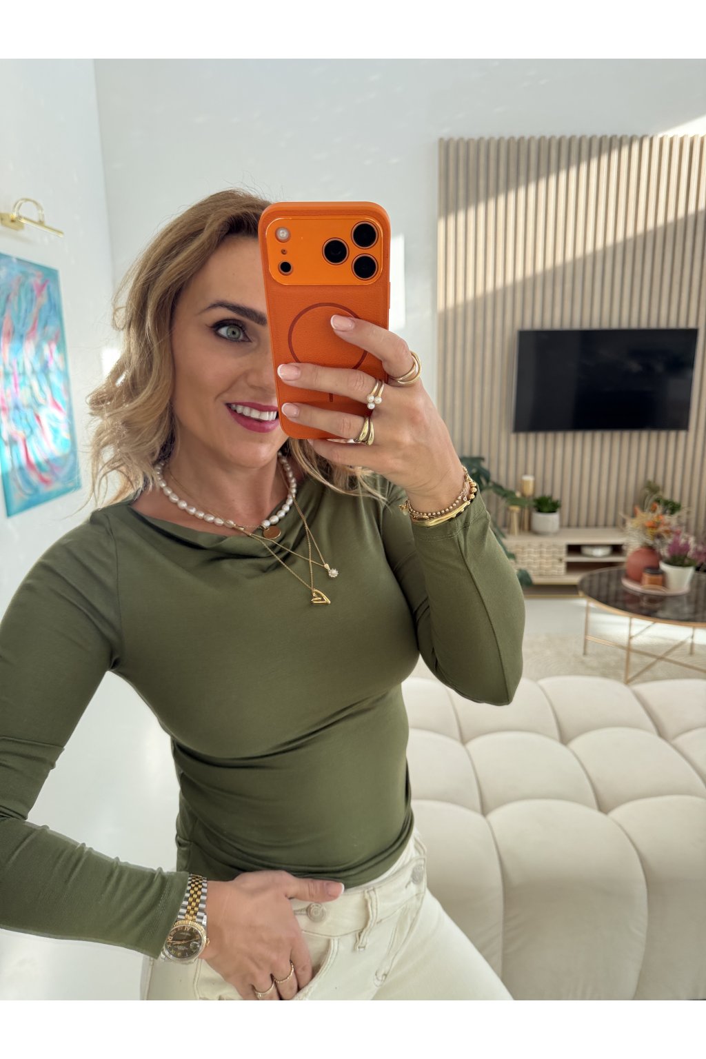 Díky řasení v oblasti bříška jemně maskuje nedokonalosti a zároveň lichotí siluetě. Skvěle se hodí k džínám, sukni i pod sako – zkrátka univerzální kousek, který unosíš celý rok.