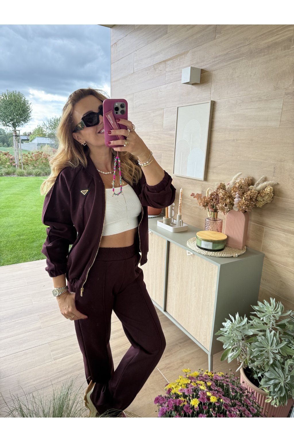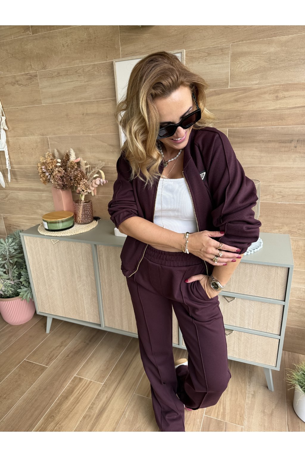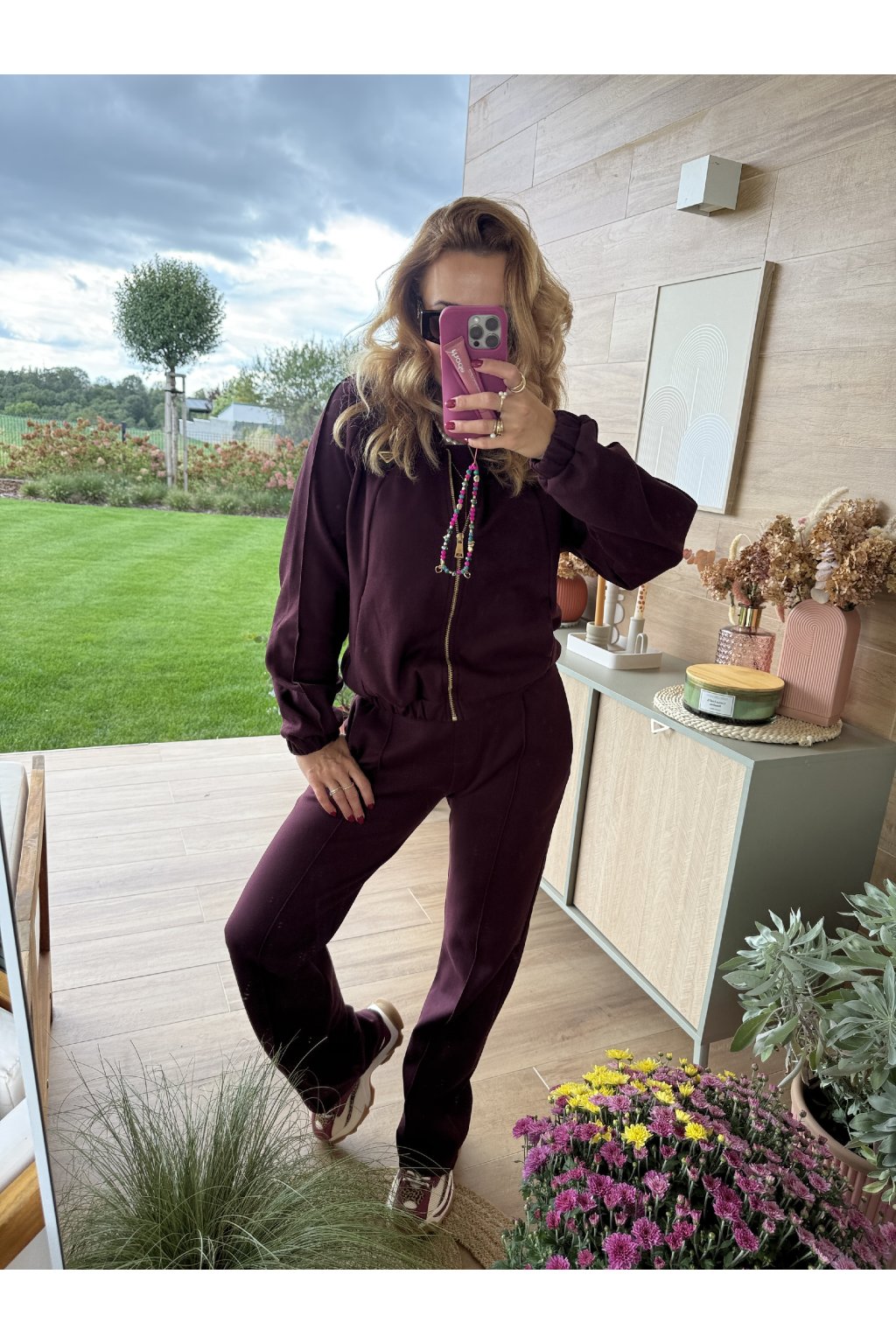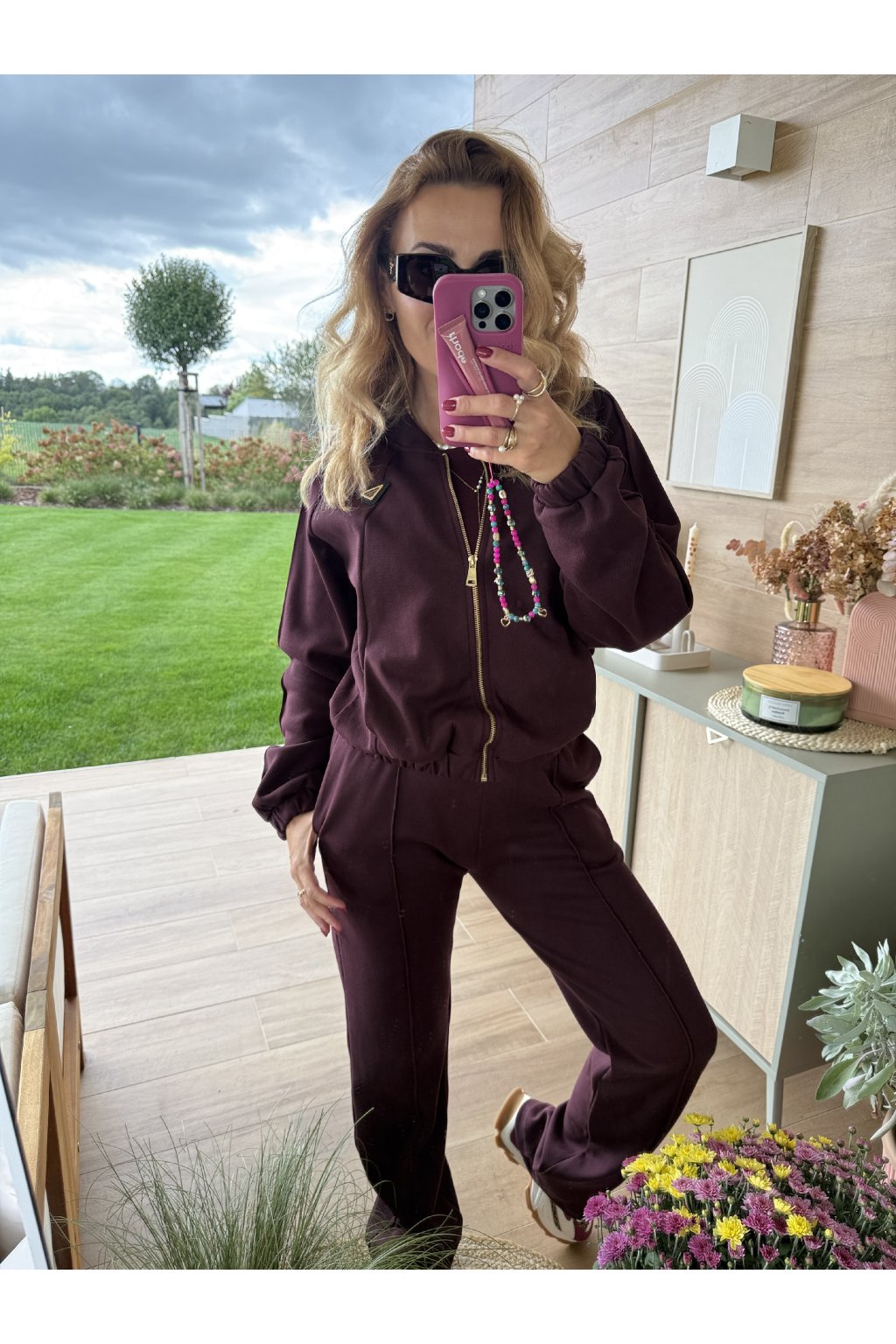 Stylová tepláková souprava v krásném Burundi odstínu, která spojuje pohodlí a eleganci. Mikina na zip s elastickým pasem a zlato černou plackou s nápisem Quality má puky na rukávech a kalhoty s rovnými nohavicemi, mají na přední straně puky, po bocích praktické kapsy a velmi pružný pas. Vytvářejí moderní a zároveň nadčasový look.