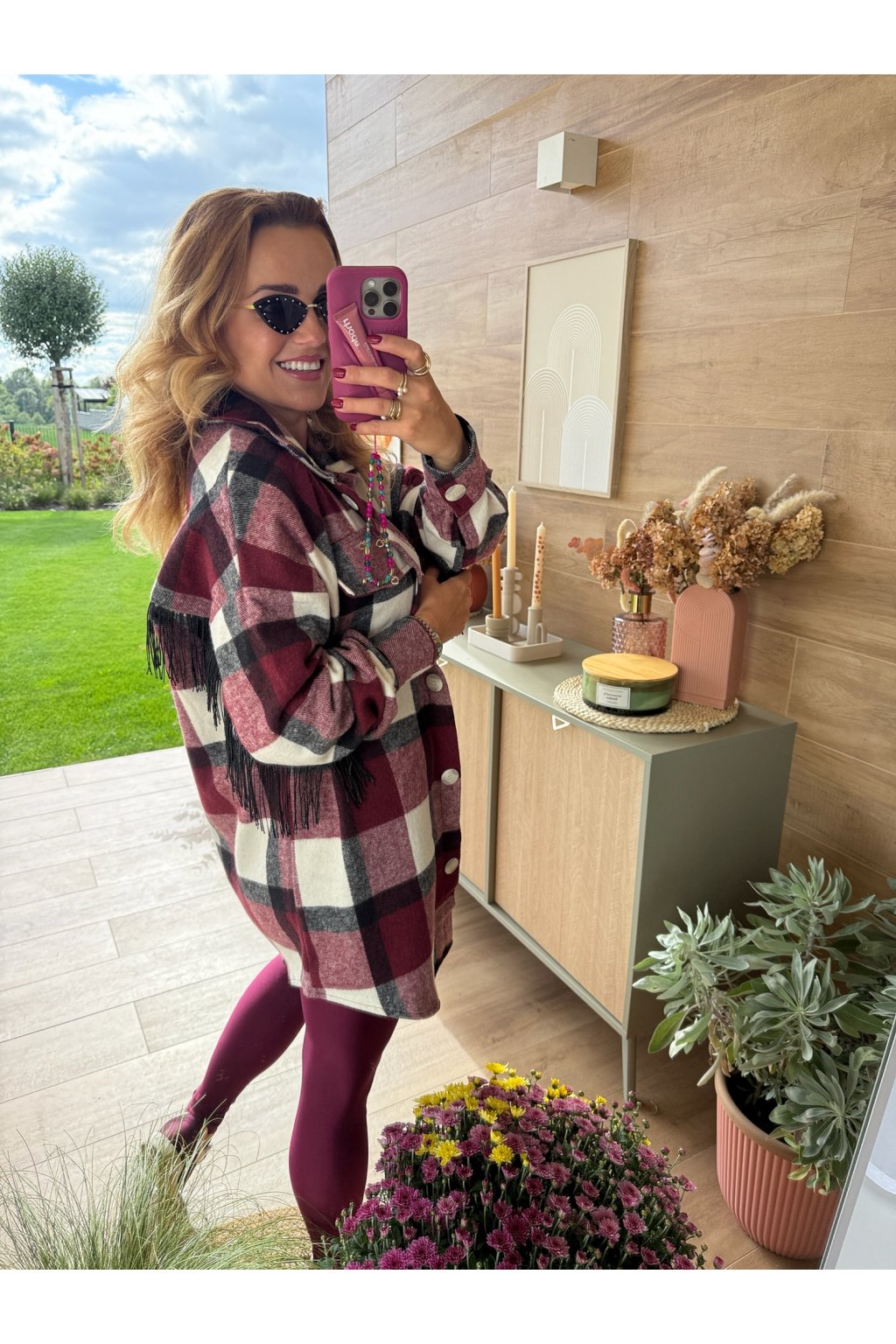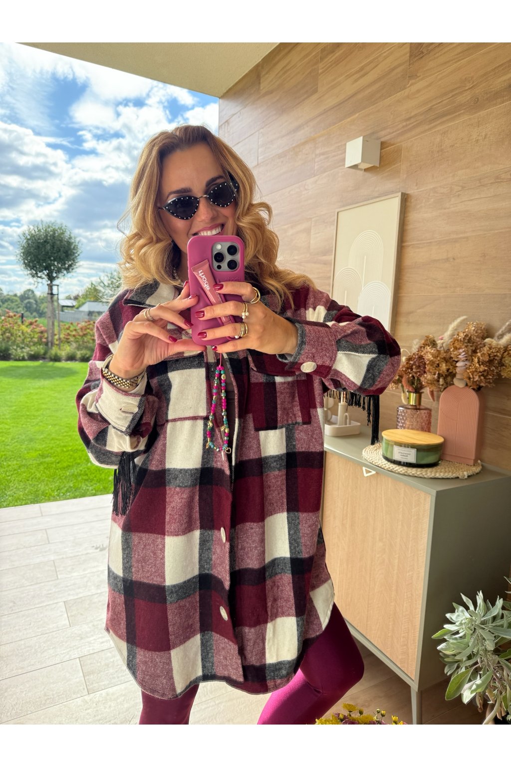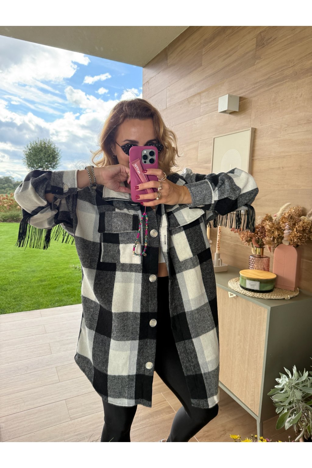 Stylový kousek, který spojuje pohodlí flanelové košile a ležérní eleganci kabátku. Kostkovaný vzor je nestárnoucí klasika, ale to, co tento model dělá opravdu trendy, jsou třásně na zádech a rukávech – detail, který teď letí a dodává outfitu šmrnc i lehký western nádech.