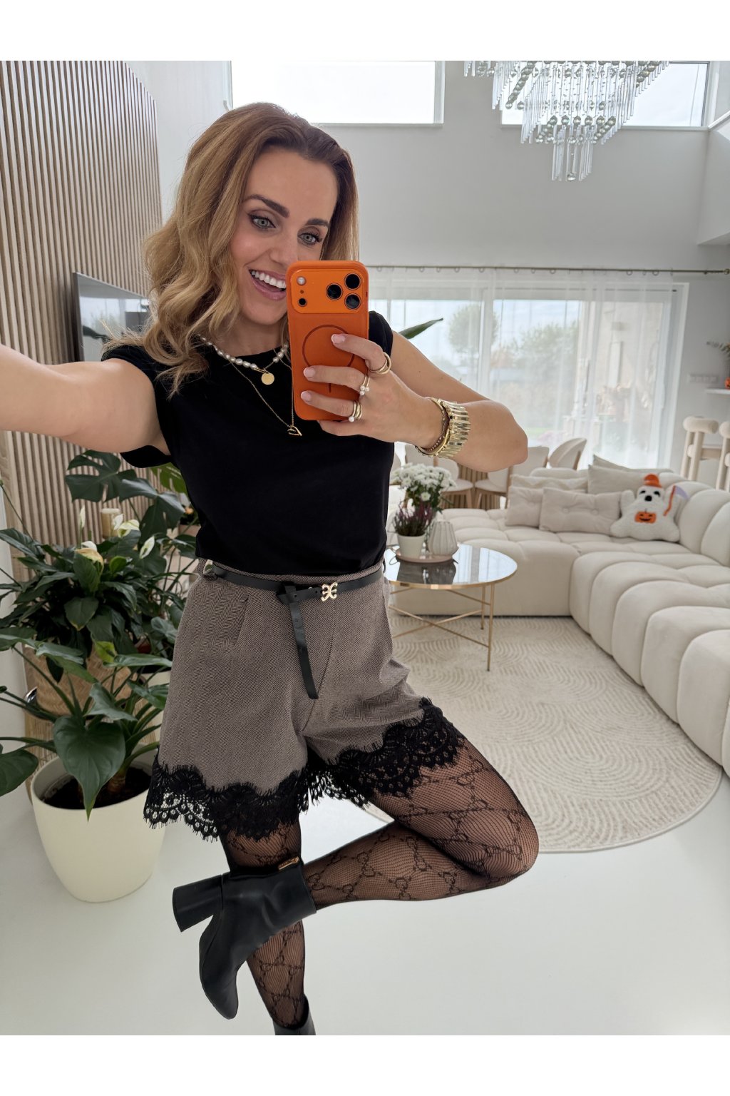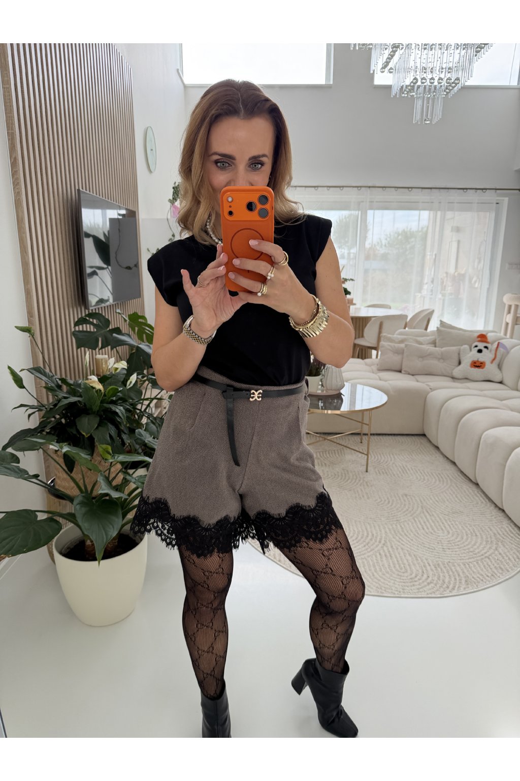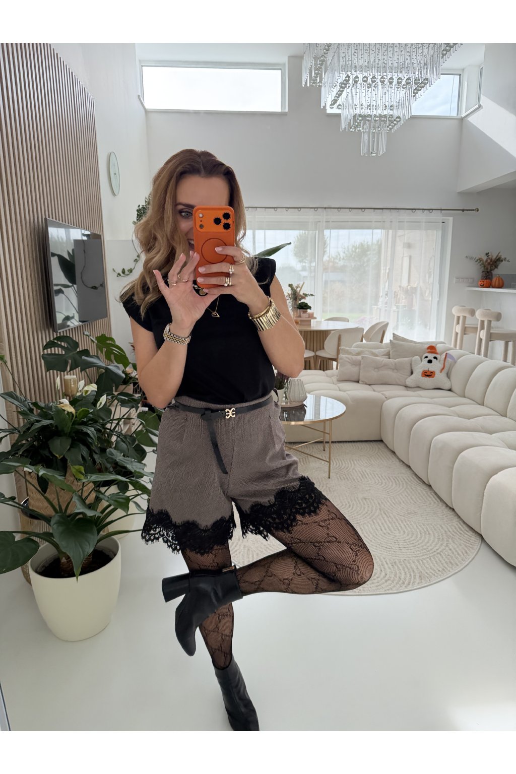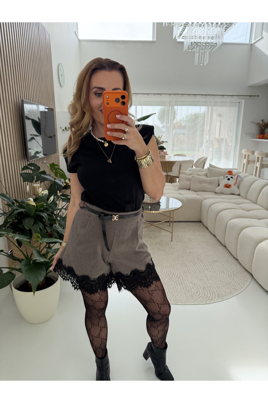 Stylové kraťasy z teplého, příjemného materiálu, ideální pro chladnější dny. Mají rovný volnější střih, který neobepínájí stehna, a proto krásně sedí na každé postavě. Dolní lem zdobí elegantní krajka, která dodává celému outfitu ženský a sofistikovaný nádech.