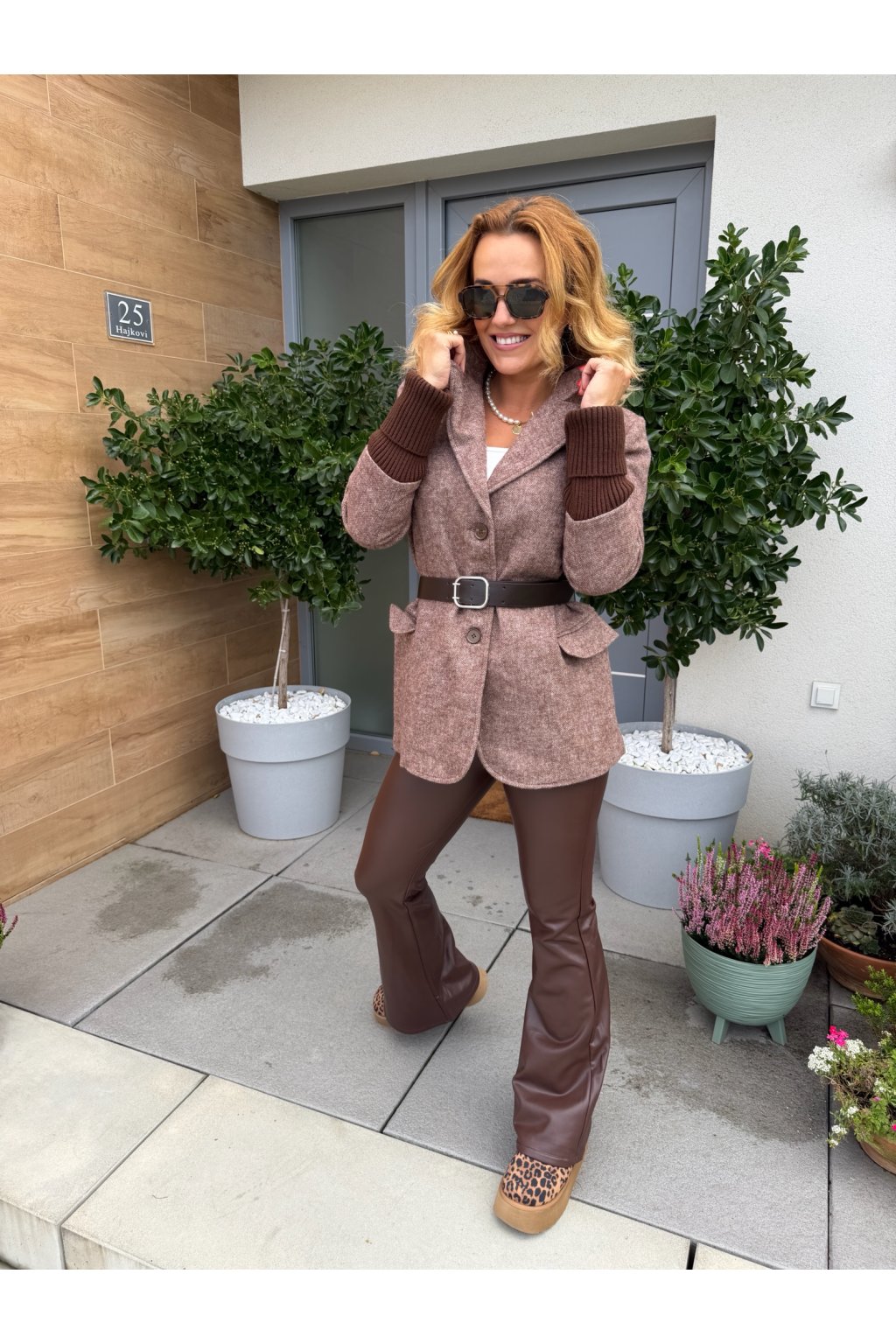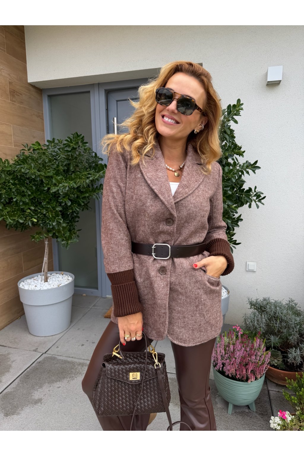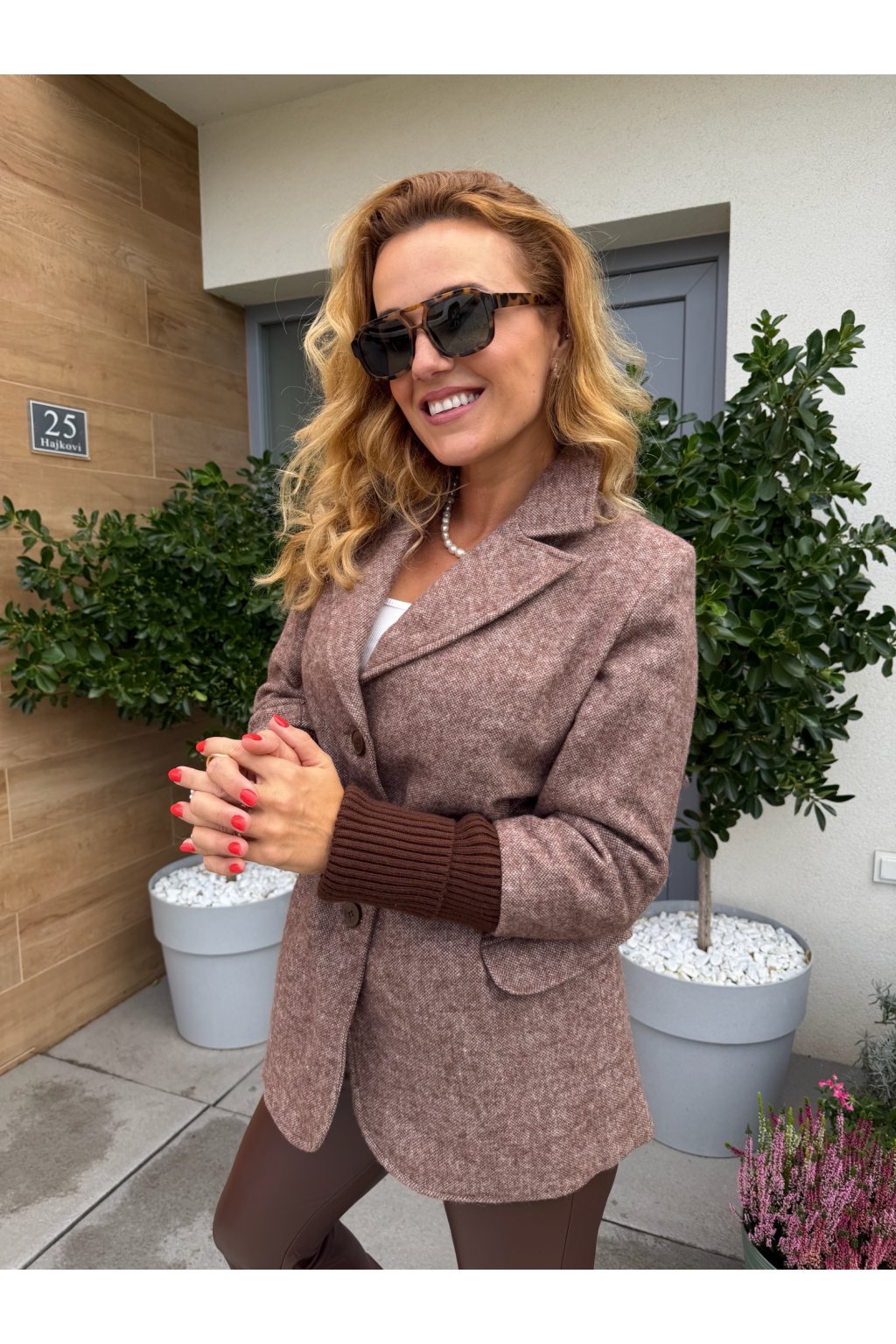 HNĚDÝ KABÁTEK S ÚPLETOVÝMI RUKÁVY TWEEDY