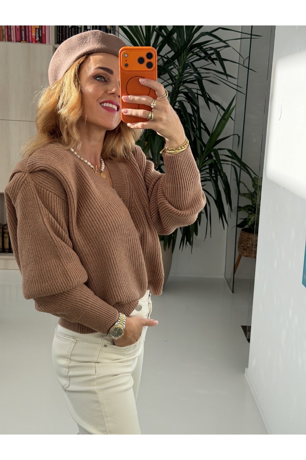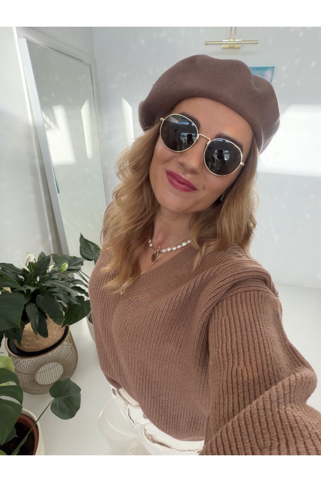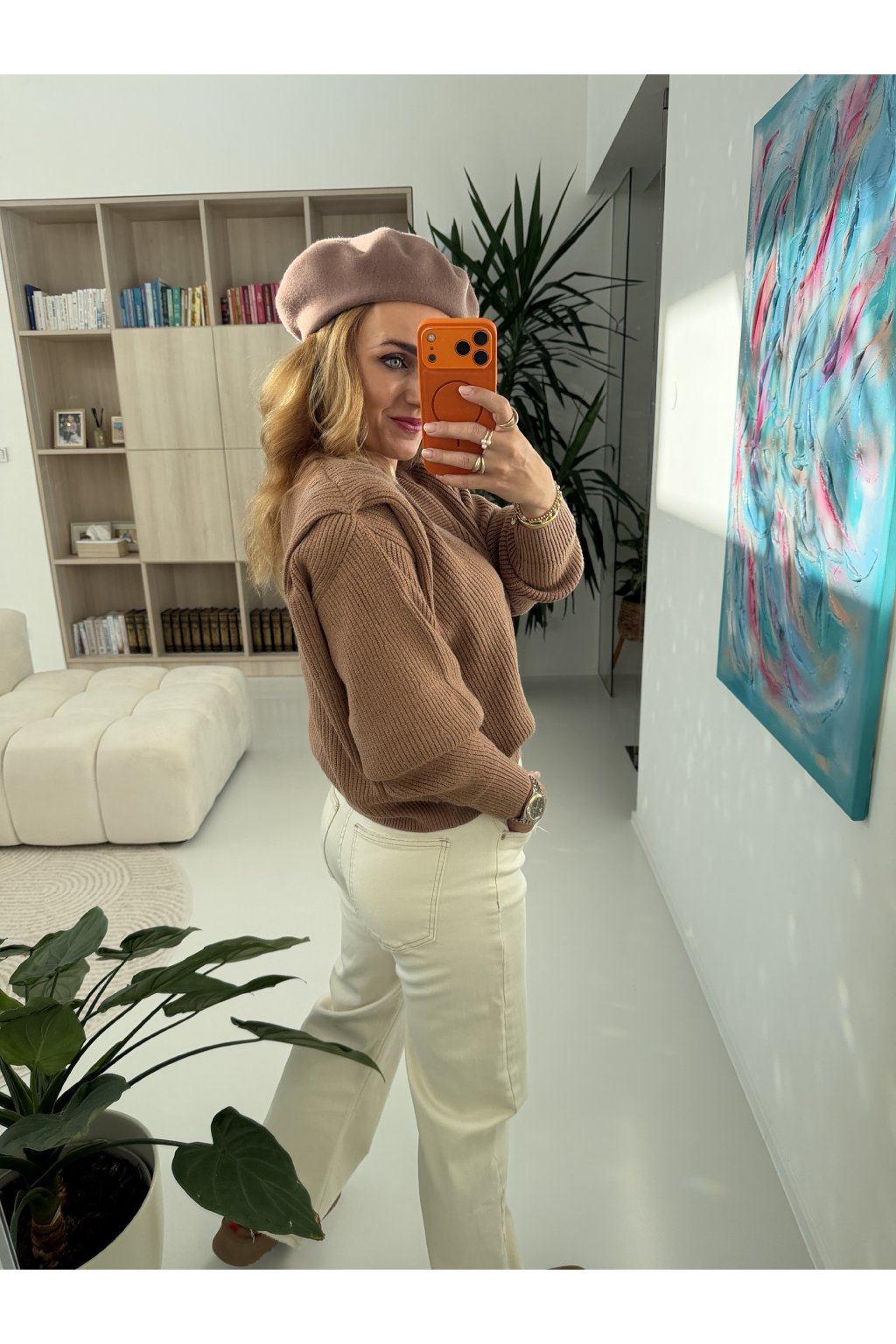 Trendy kávo-karamelová barva se hodí ke všemu – od světlých džínů až po kožené kalhoty. Materiál je příjemný, měkký a ideální na celodenní nošení.