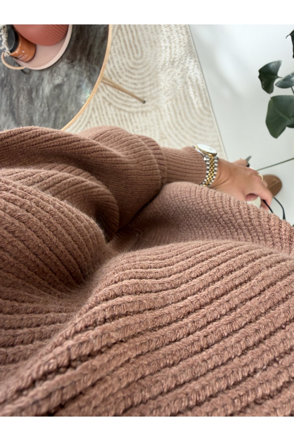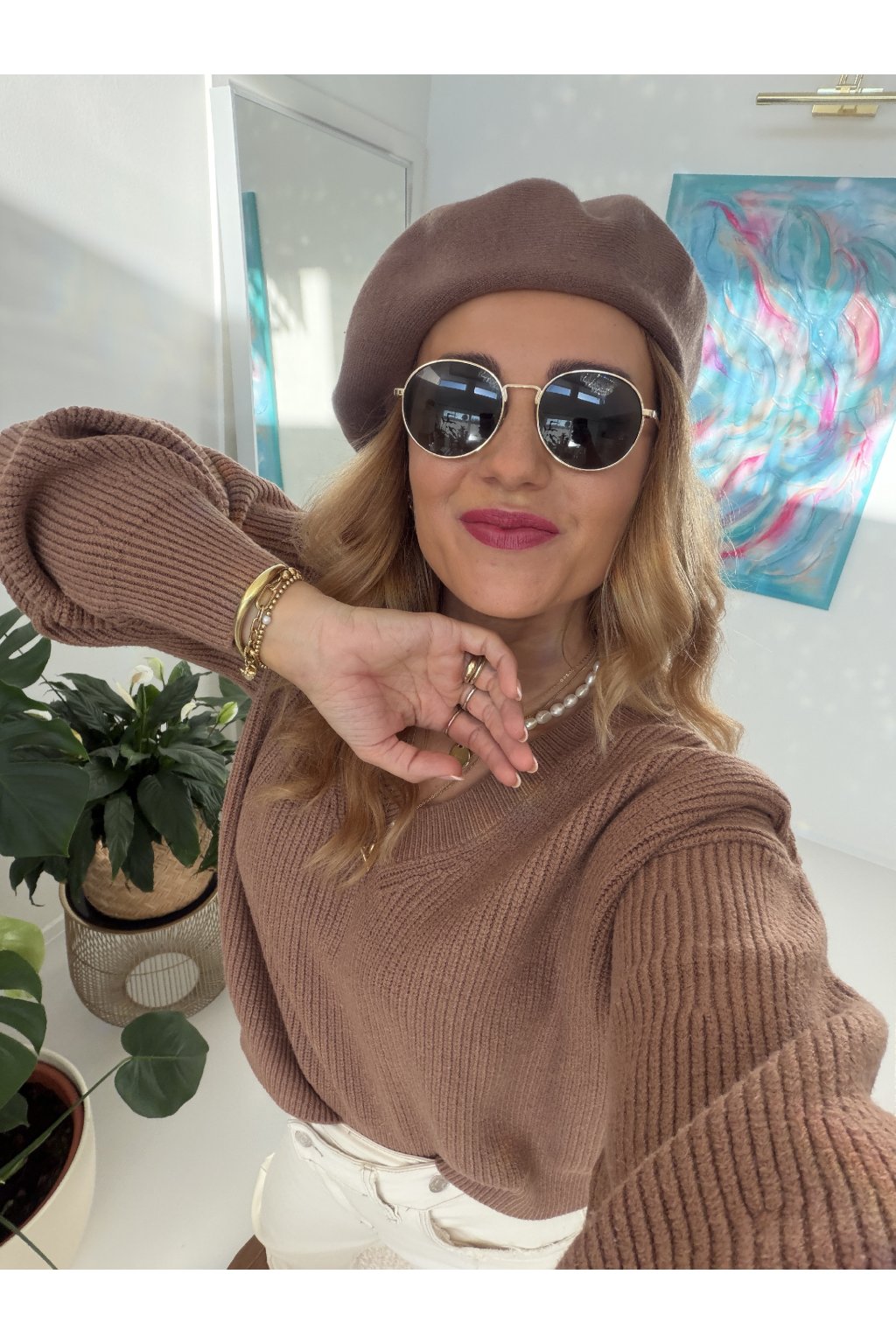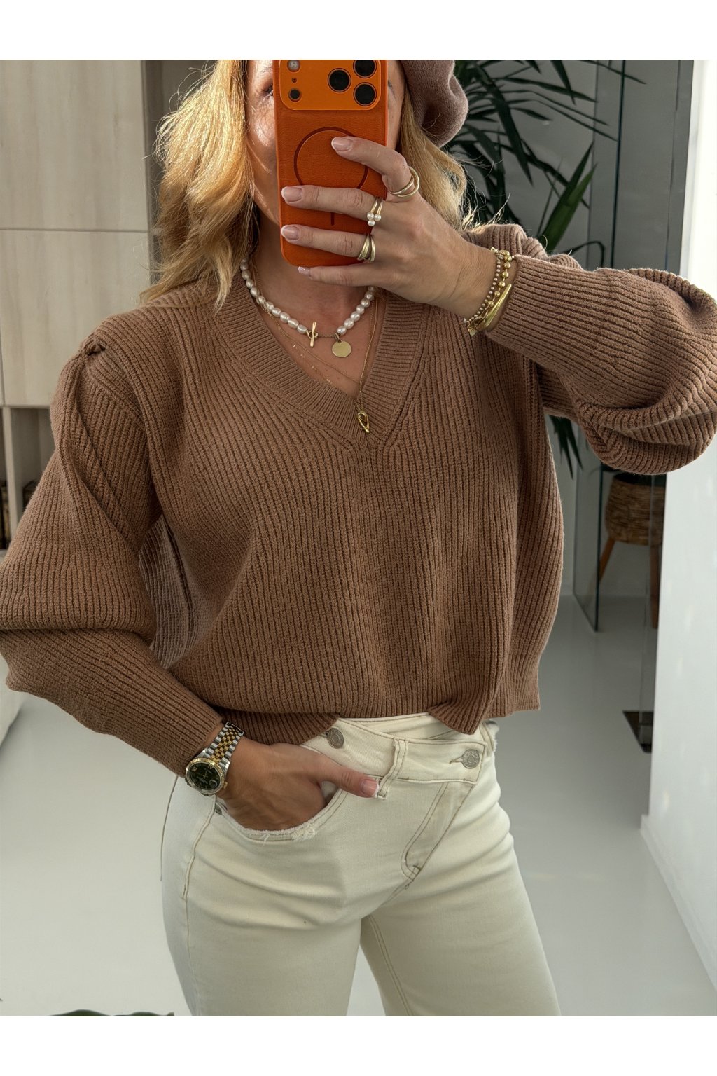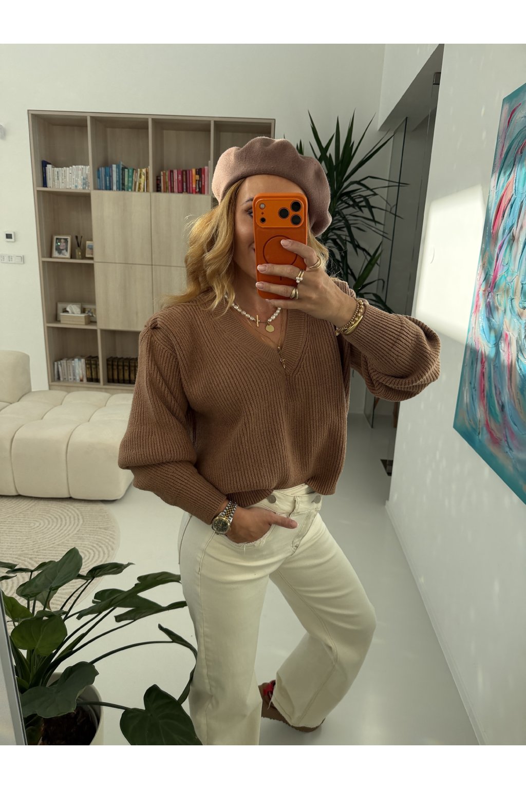 Trendy kávo-karamelová barva se hodí ke všemu – od světlých džínů až po kožené kalhoty. Materiál je příjemný, měkký a ideální na celodenní nošení.
