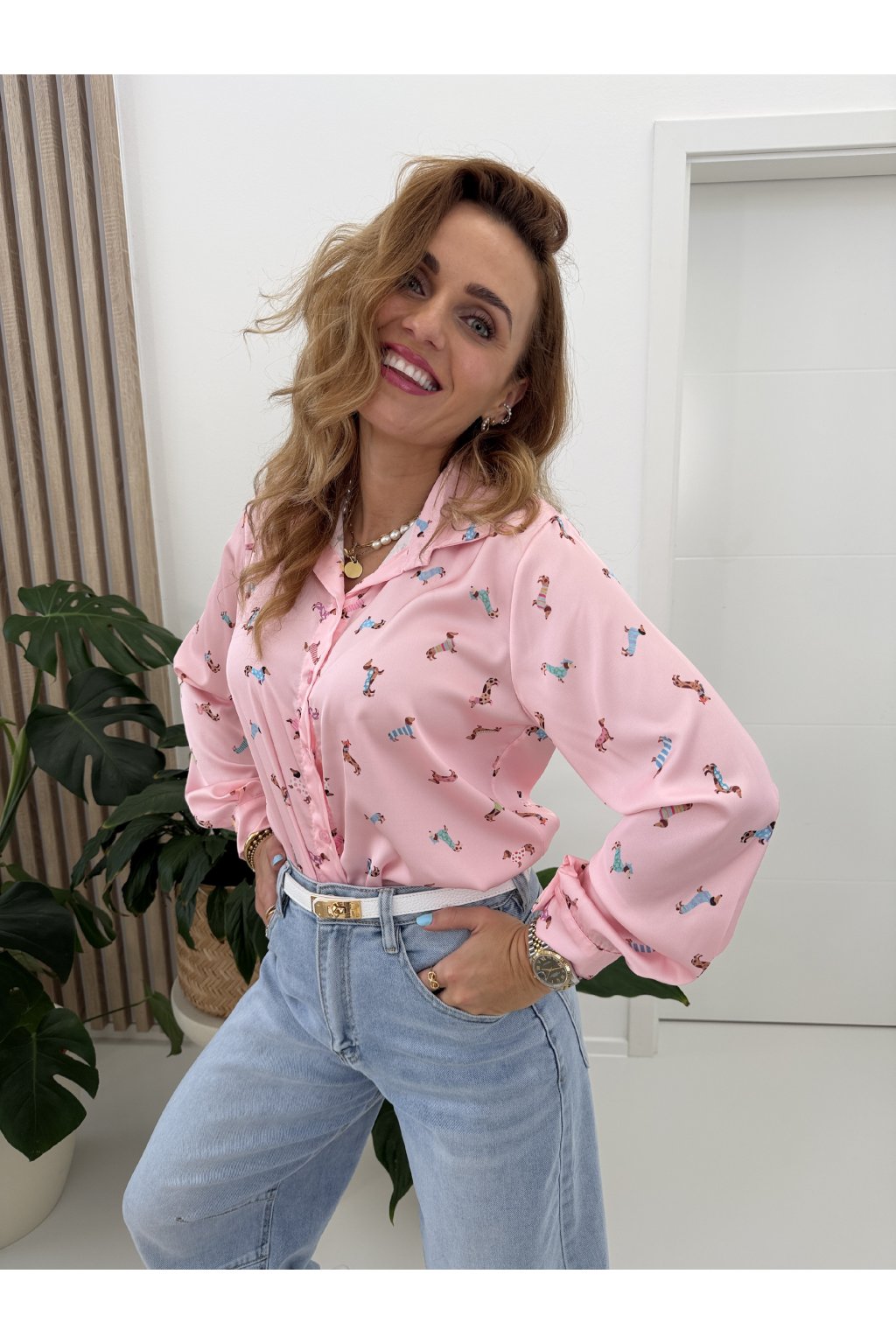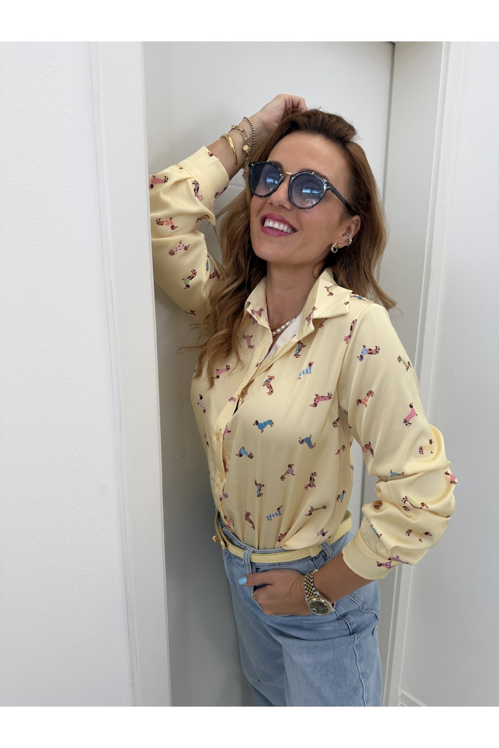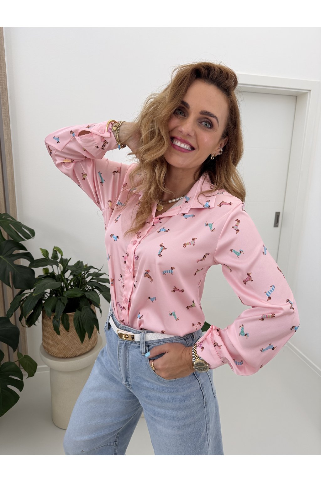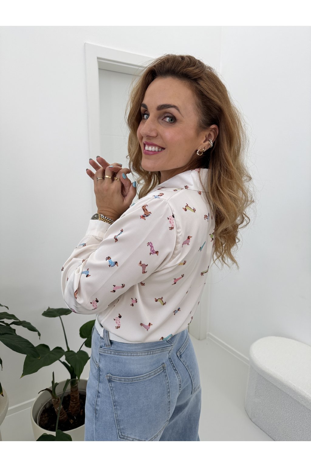 Košile s jemným potiskem jezevčíků dodá outfitu šmrnc a hravost, aniž by působila přehnaně. Skvěle se kombinuje s denimem, kalhotami i sukní a unosíte ji do práce i na volný čas.