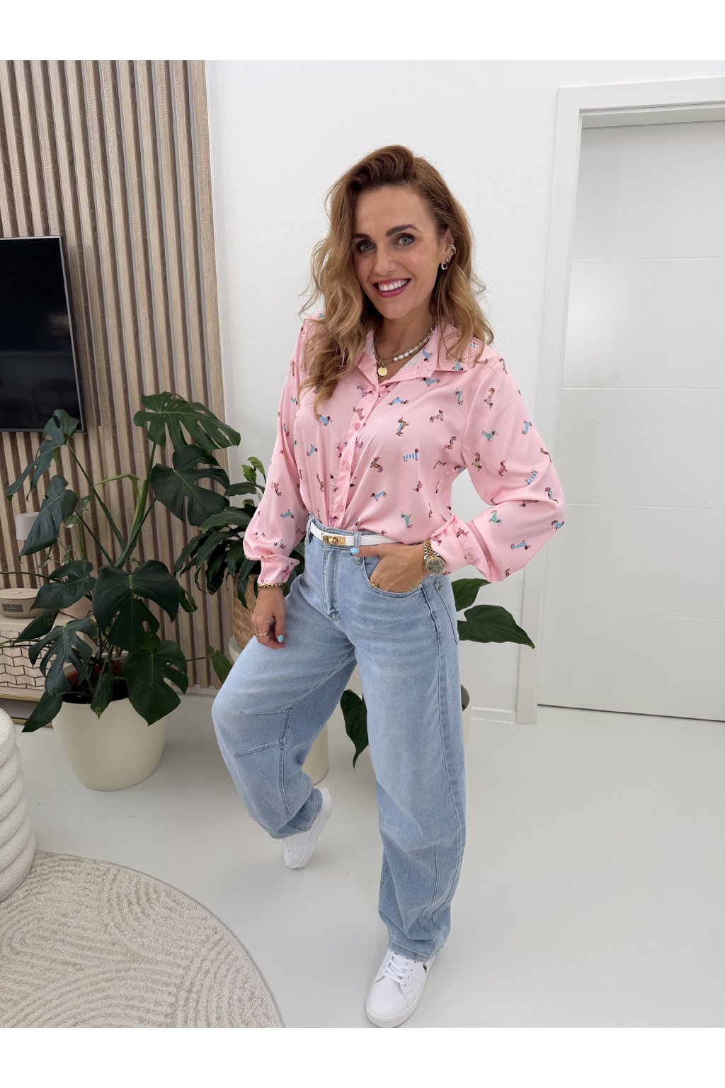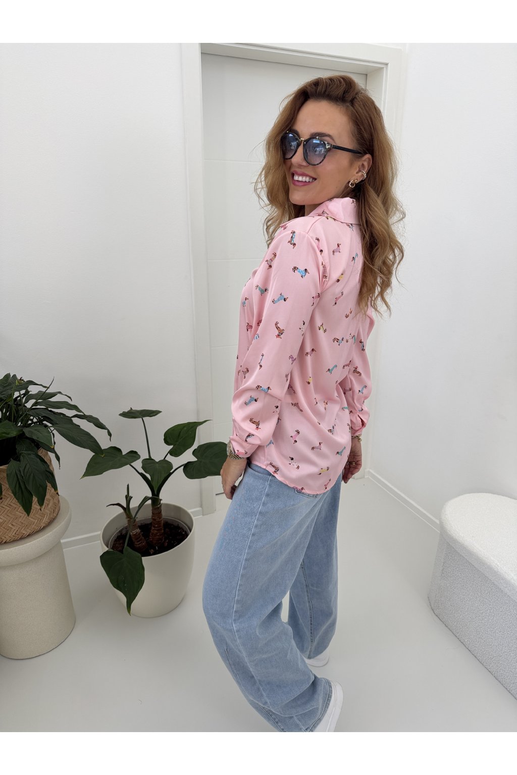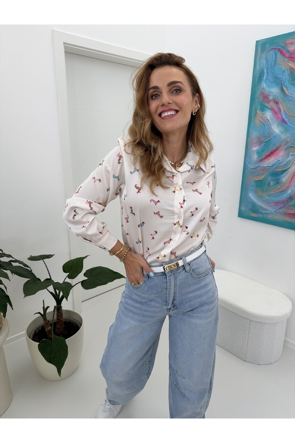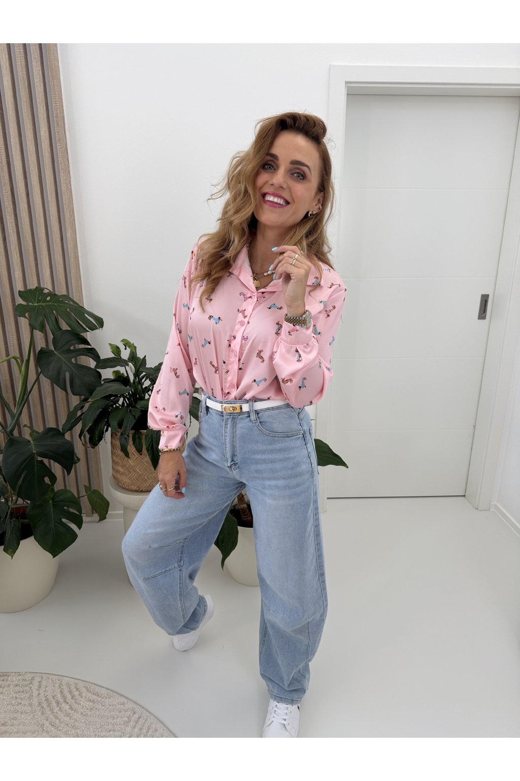 Košile s jemným potiskem jezevčíků dodá outfitu šmrnc a hravost, aniž by působila přehnaně. Skvěle se kombinuje s denimem, kalhotami i sukní a unosíte ji do práce i na volný čas.