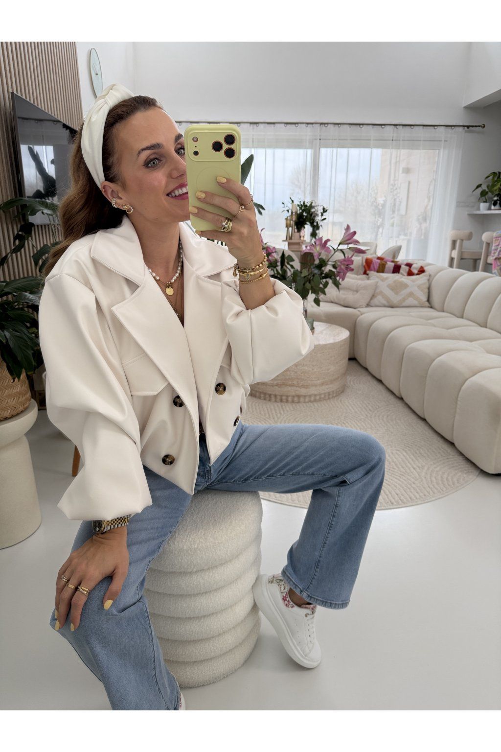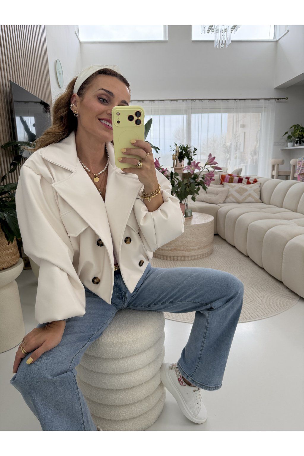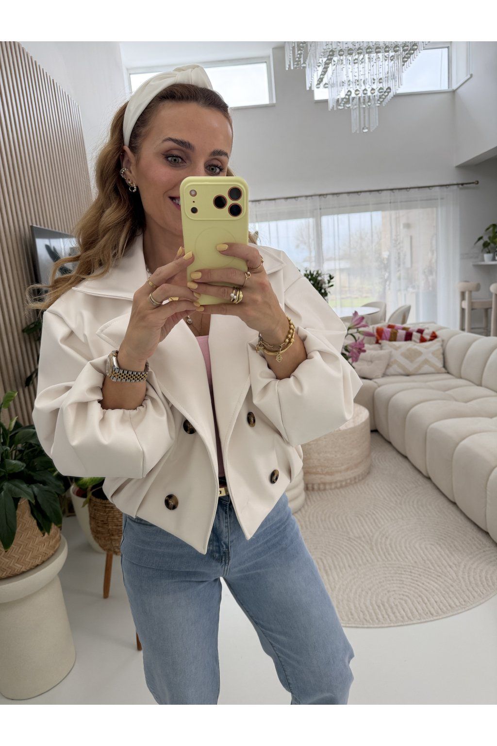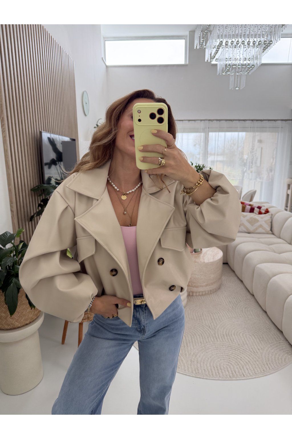 Zkrácená délka krásně zvýrazní pas a skvěle se kombinuje s džíny i šaty. Balónové rukávy a výrazné knoflíky dodávají celému kousku jedinečný charakter. Neprofoukne, nepromokne. Ideální na jaro.
