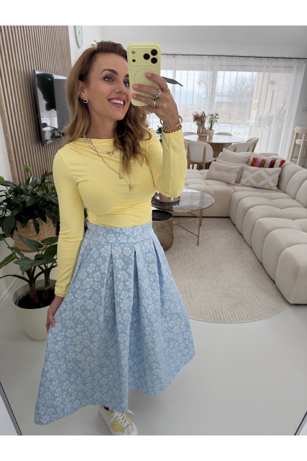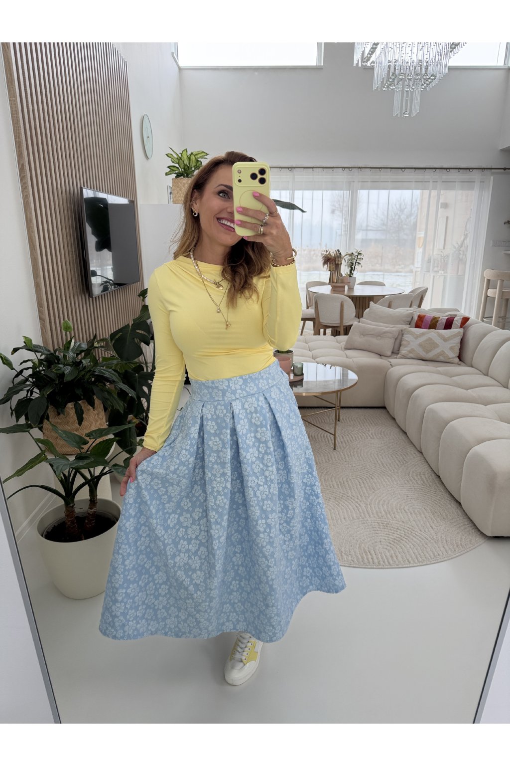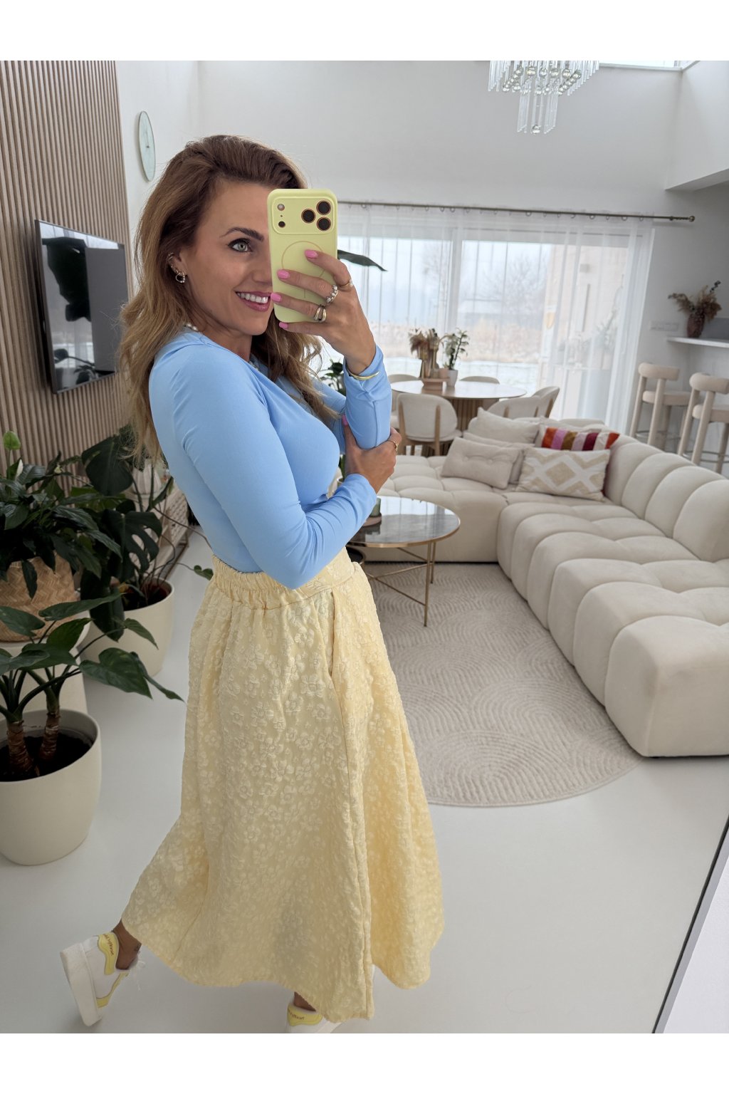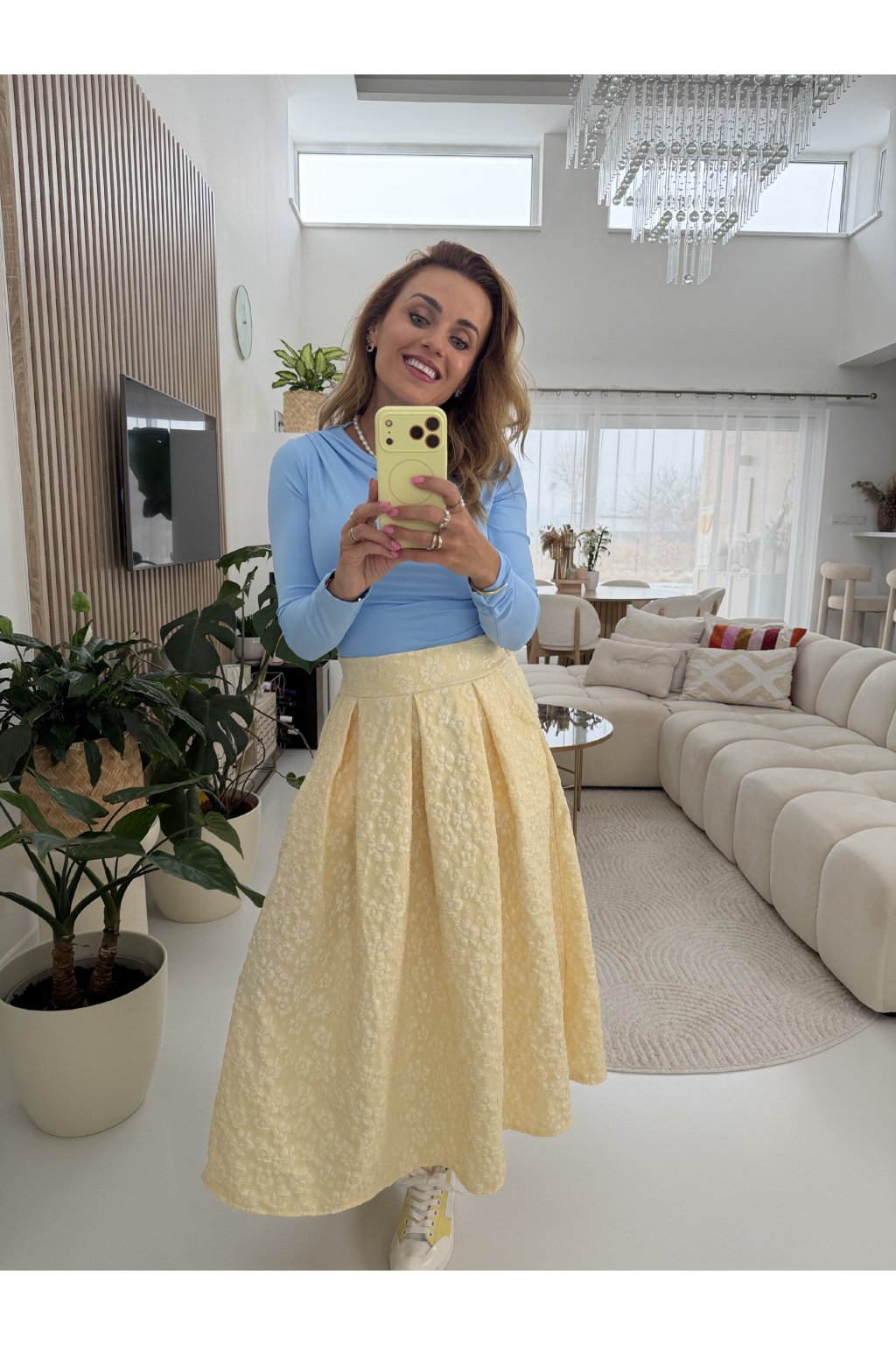 Elegantní, ale pohodlná. Pružný pas vzadu se přizpůsobí postavě, sukně má praktické kapsy a díky vlisovanému vzoru na látce krásně drží tvar po celý den. Ideální na běžné nošení i slavnostnější outfit. Díky gumě v pase sedne od S až do menší velikosti L. Pro představu měřím 163cm a vážím 59kg,