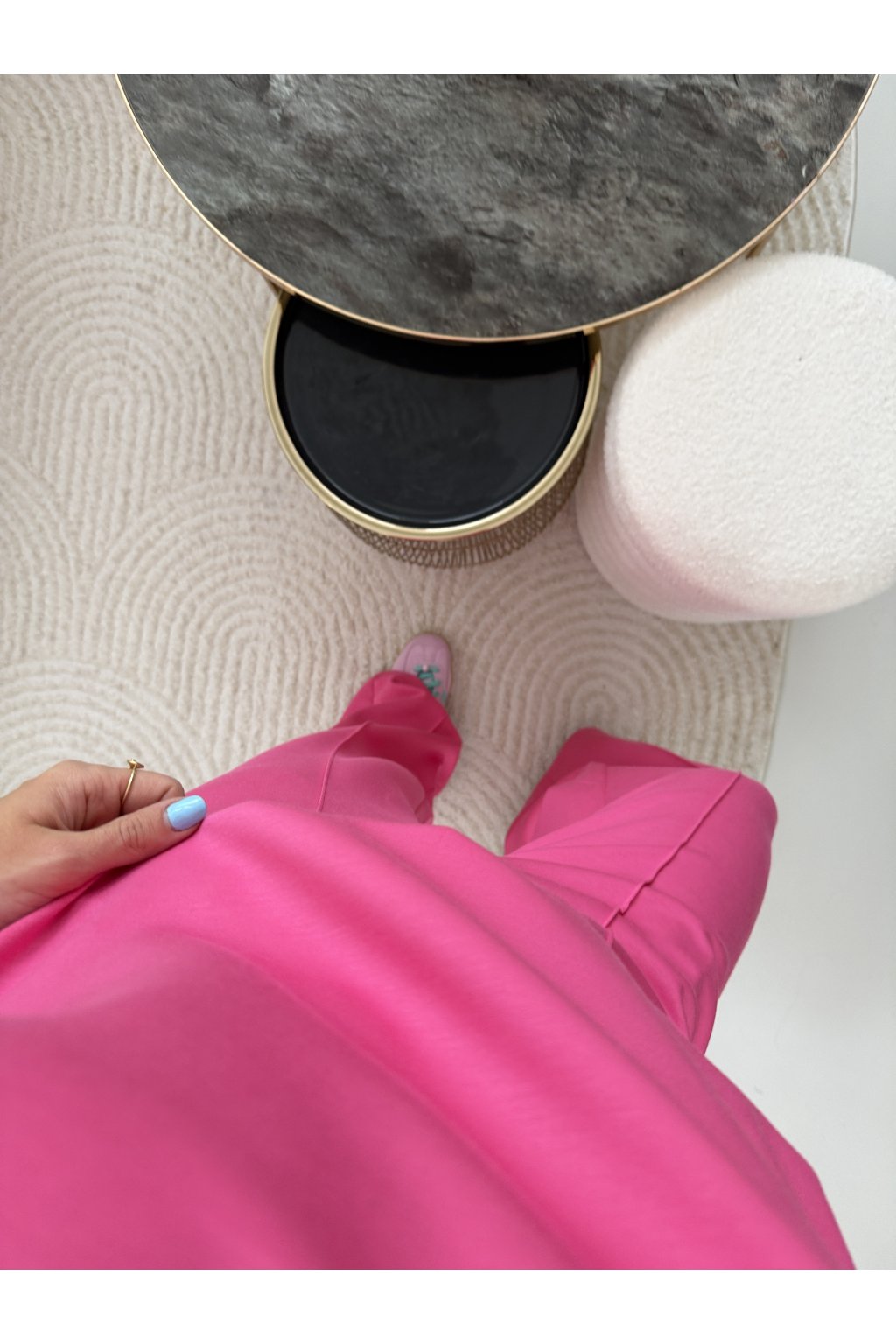 Kalhoty mají pohodlnou gumu v pase a elegantní puky na přední straně, které opticky prodlužují nohy.