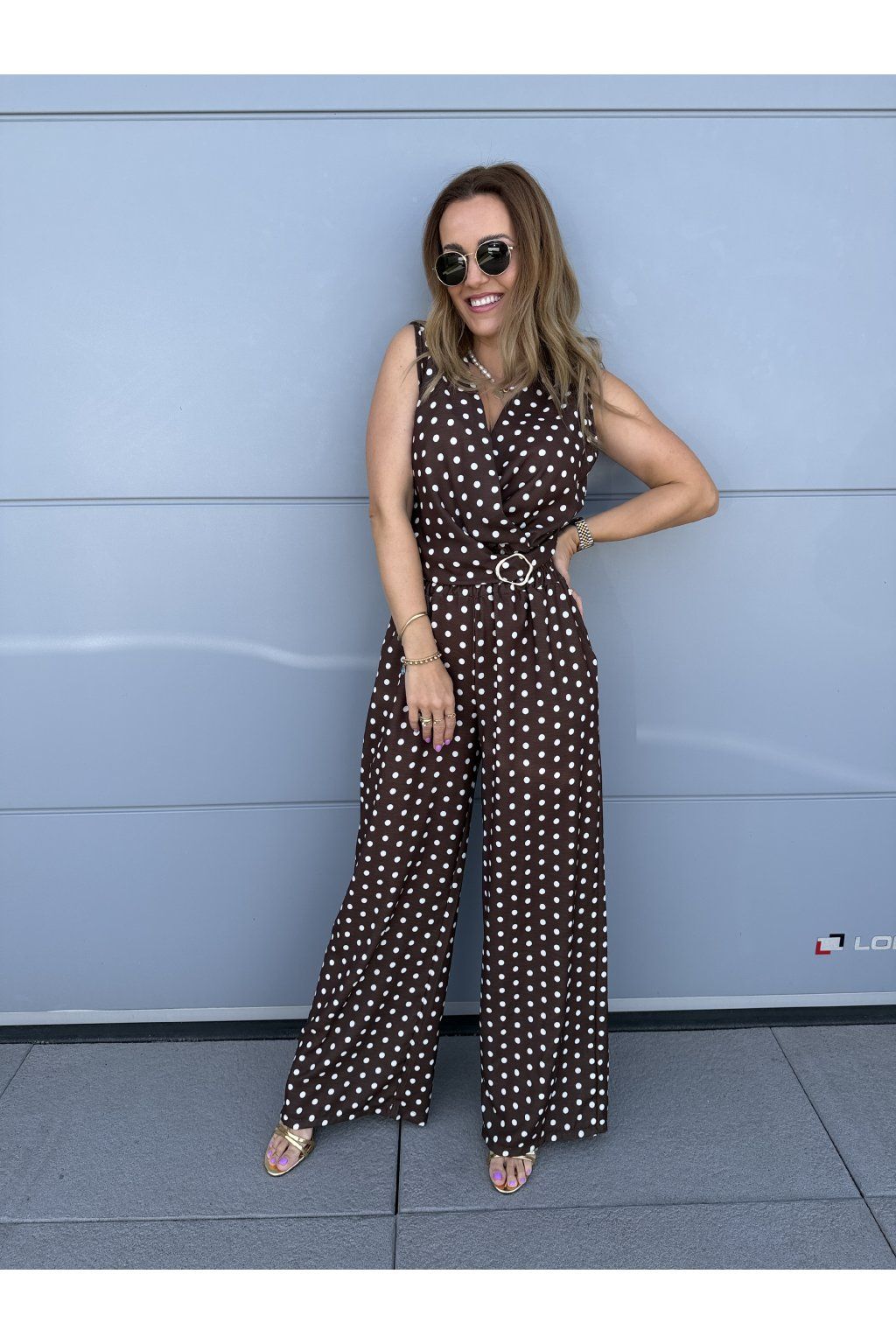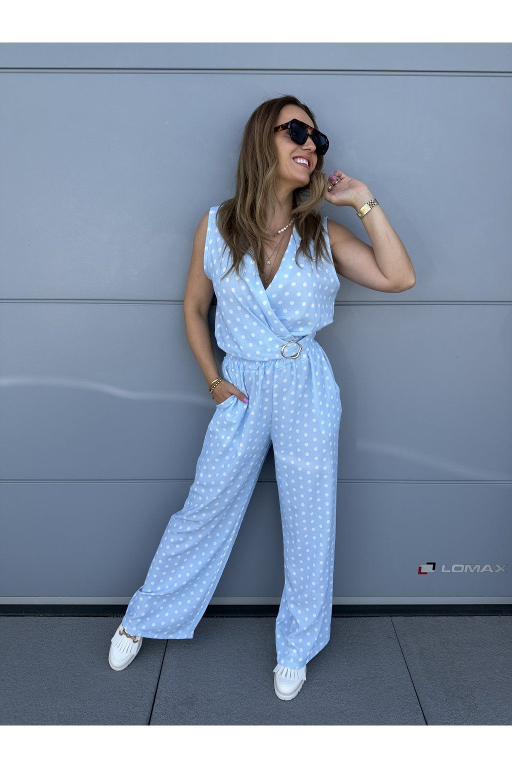 Díky promyšlenému střihu krásně sedí od velikosti S až po L. Kalhoty mají v pase pružnou gumu pro komfortní nošení a halenka ji má také, takže perfektně drží tvar. Vrchní díl zaujme ženským výstřihem do véčka a stylovou zlatou sponou, která dodává celému outfitu šmrnc.