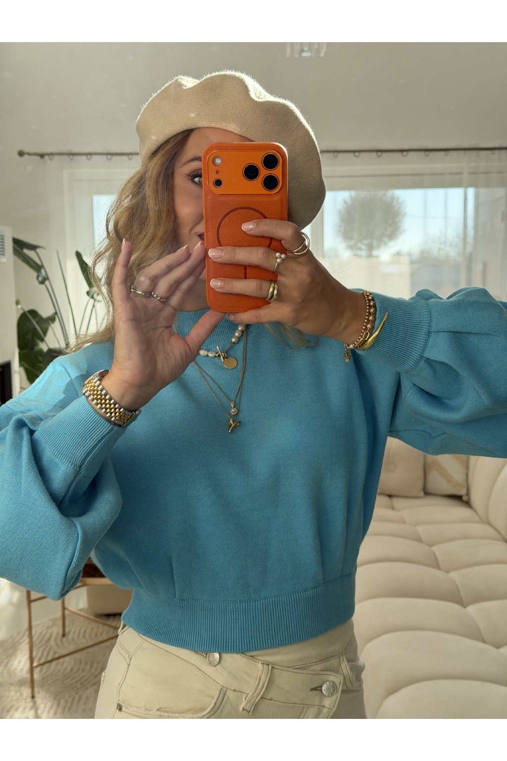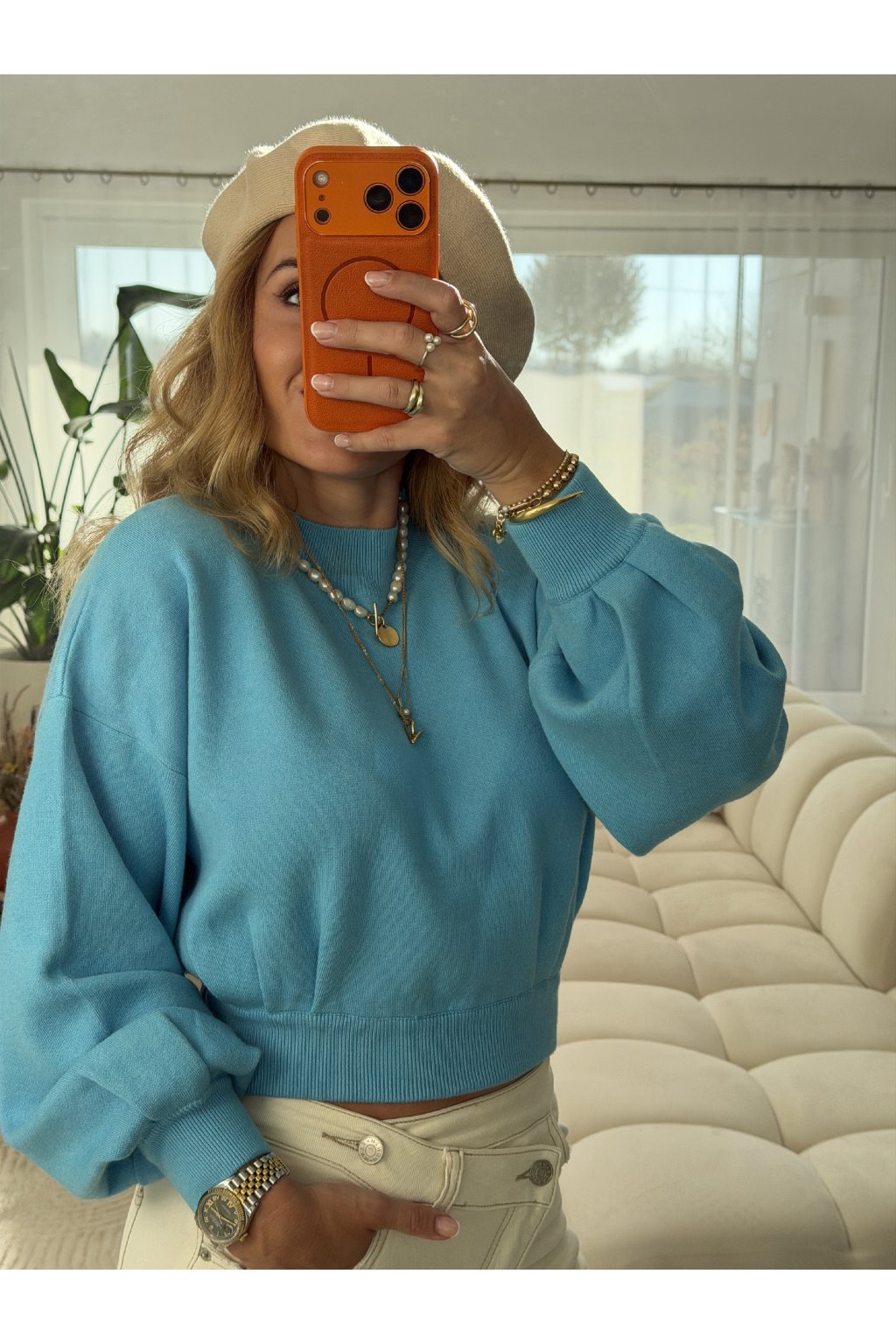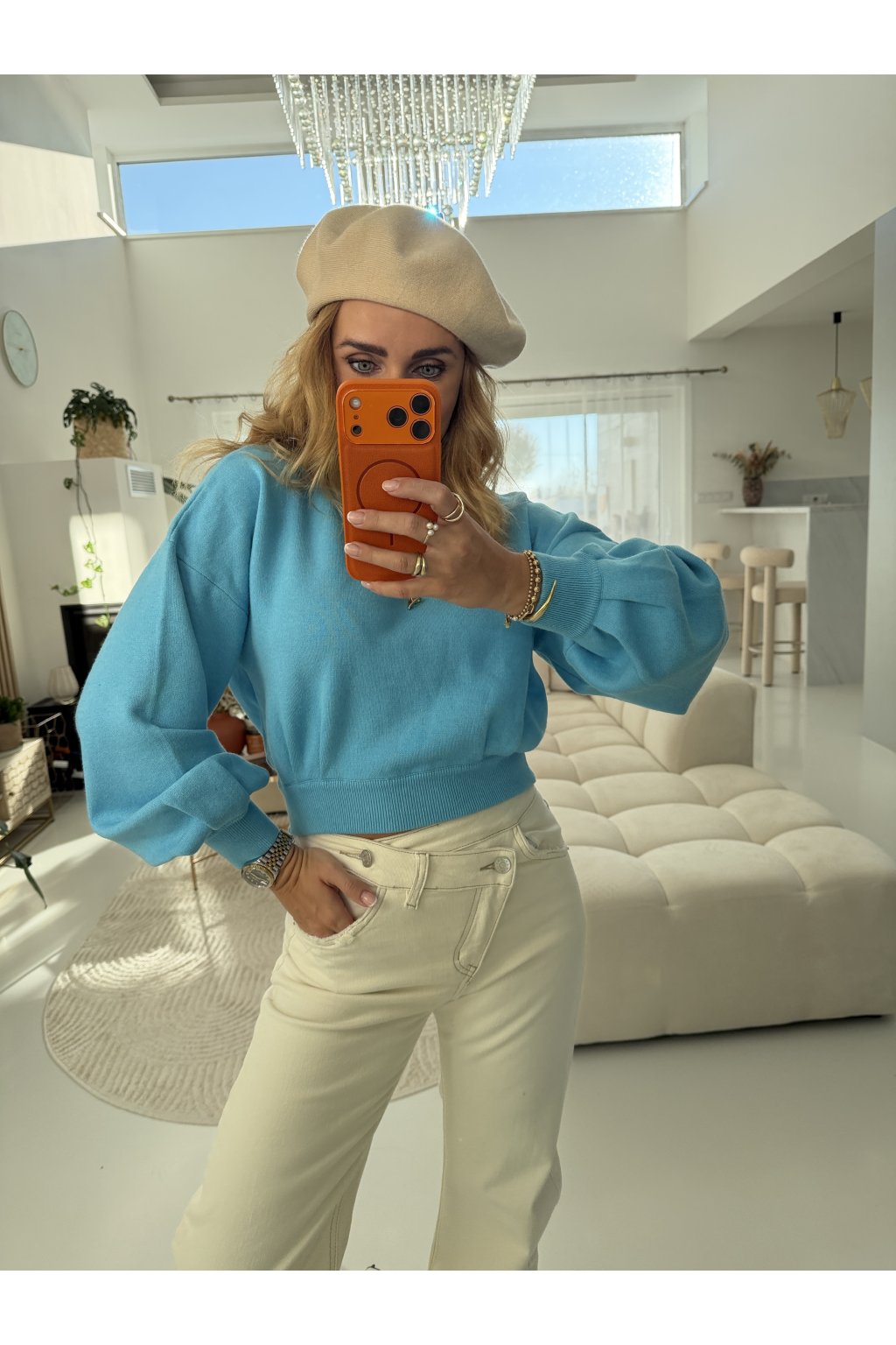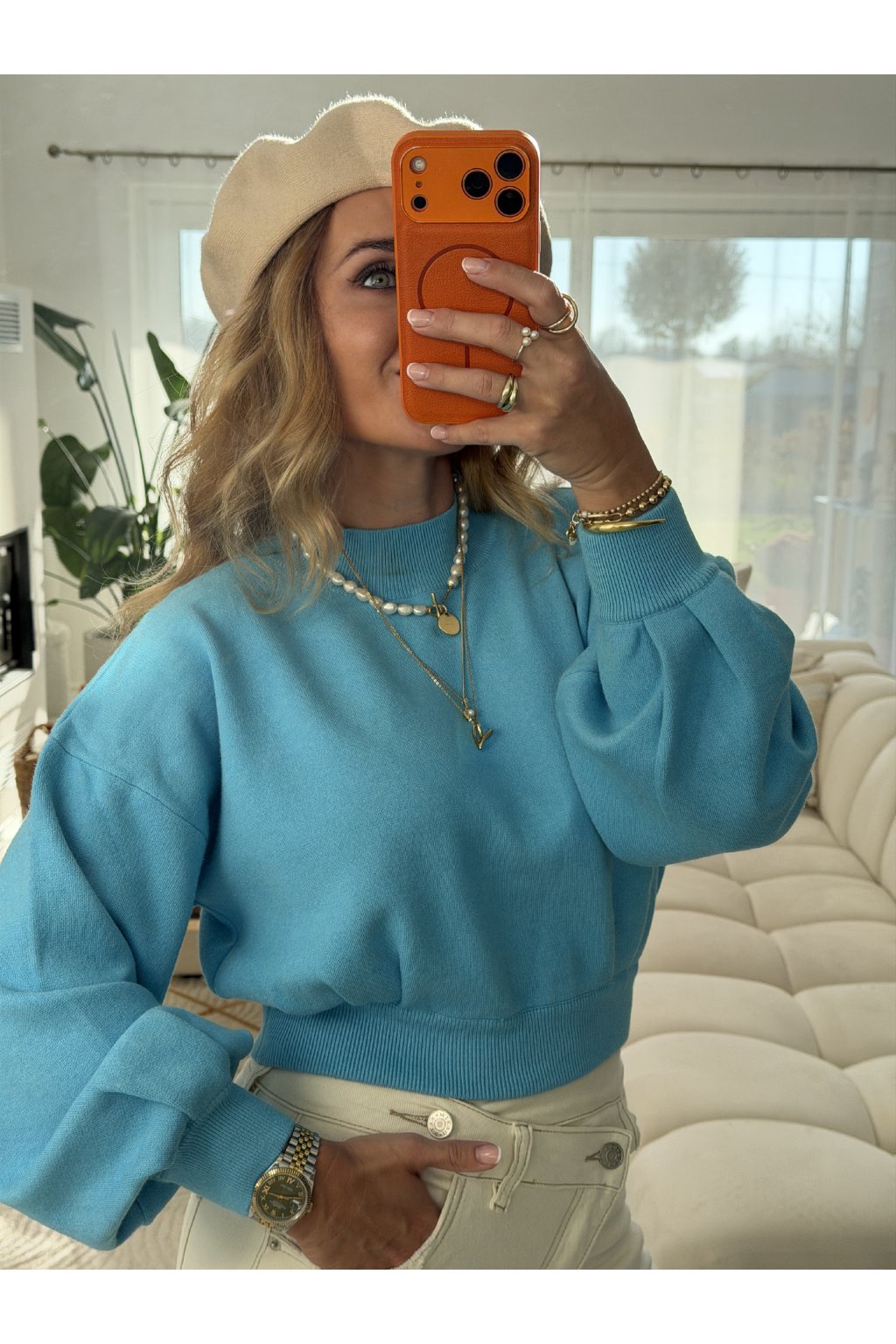 Svetr CASUAL v nádherné nebesky modré barvě je přesně ten kousek, po kterém sáhneš, když chceš být pohodlně, ale stále chic. Má volnější střih s jemně nabíranými rukávy, které dodávají outfitu ženskost, a širší pružný lem v pase, který krásně vytvaruje siluetu. Sedne nejlépe na S a M.