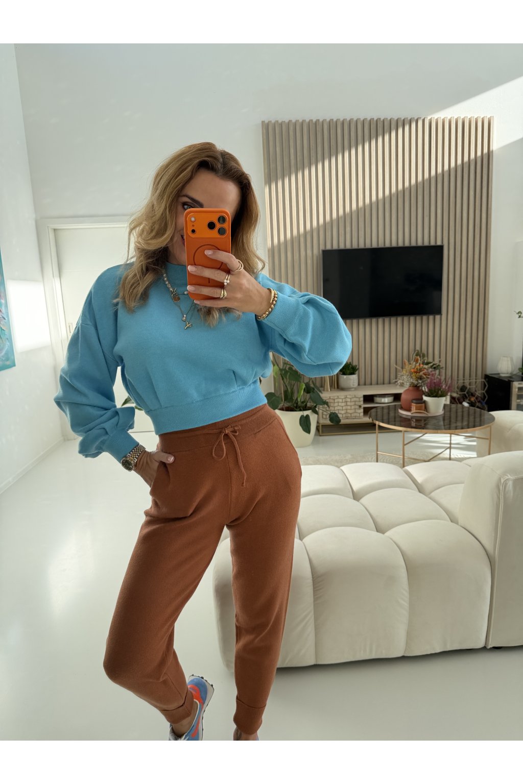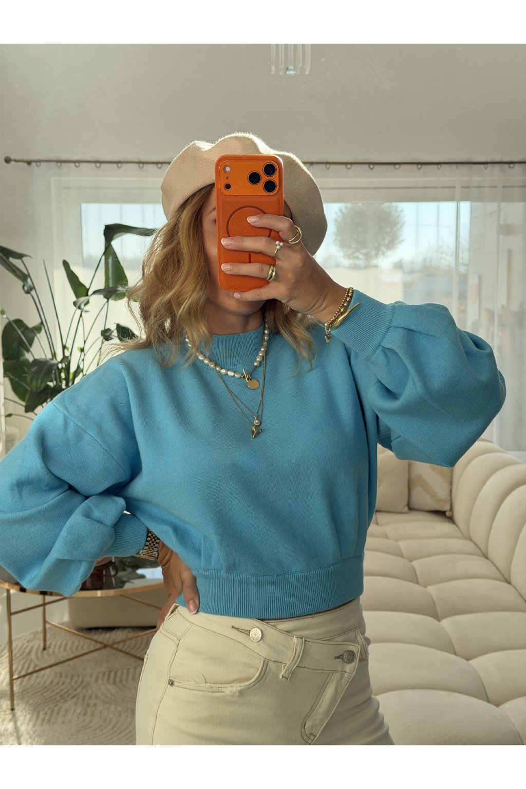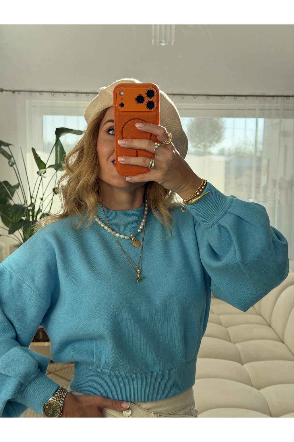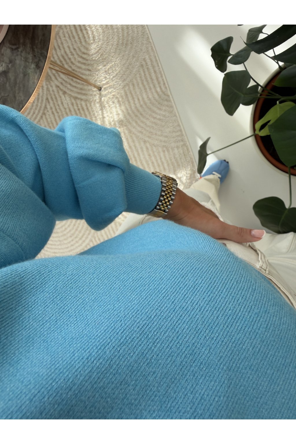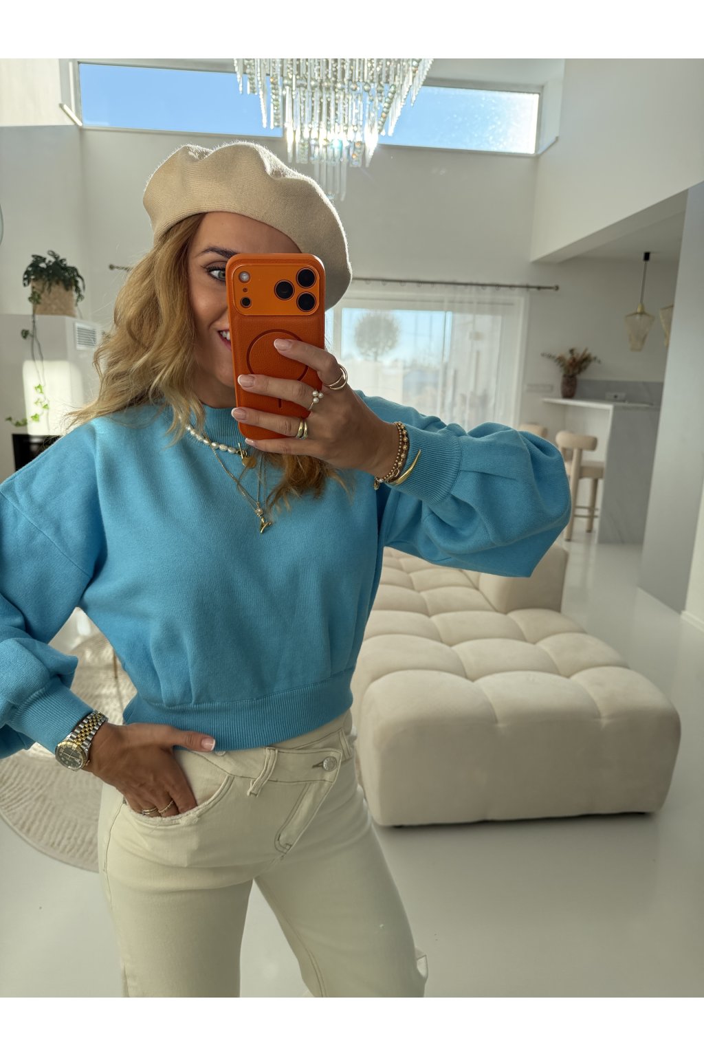 Svetr CASUAL v nádherné nebesky modré barvě je přesně ten kousek, po kterém sáhneš, když chceš být pohodlně, ale stále chic. Má volnější střih s jemně nabíranými rukávy, které dodávají outfitu ženskost, a širší pružný lem v pase, který krásně vytvaruje siluetu. Sedne nejlépe na S a M.