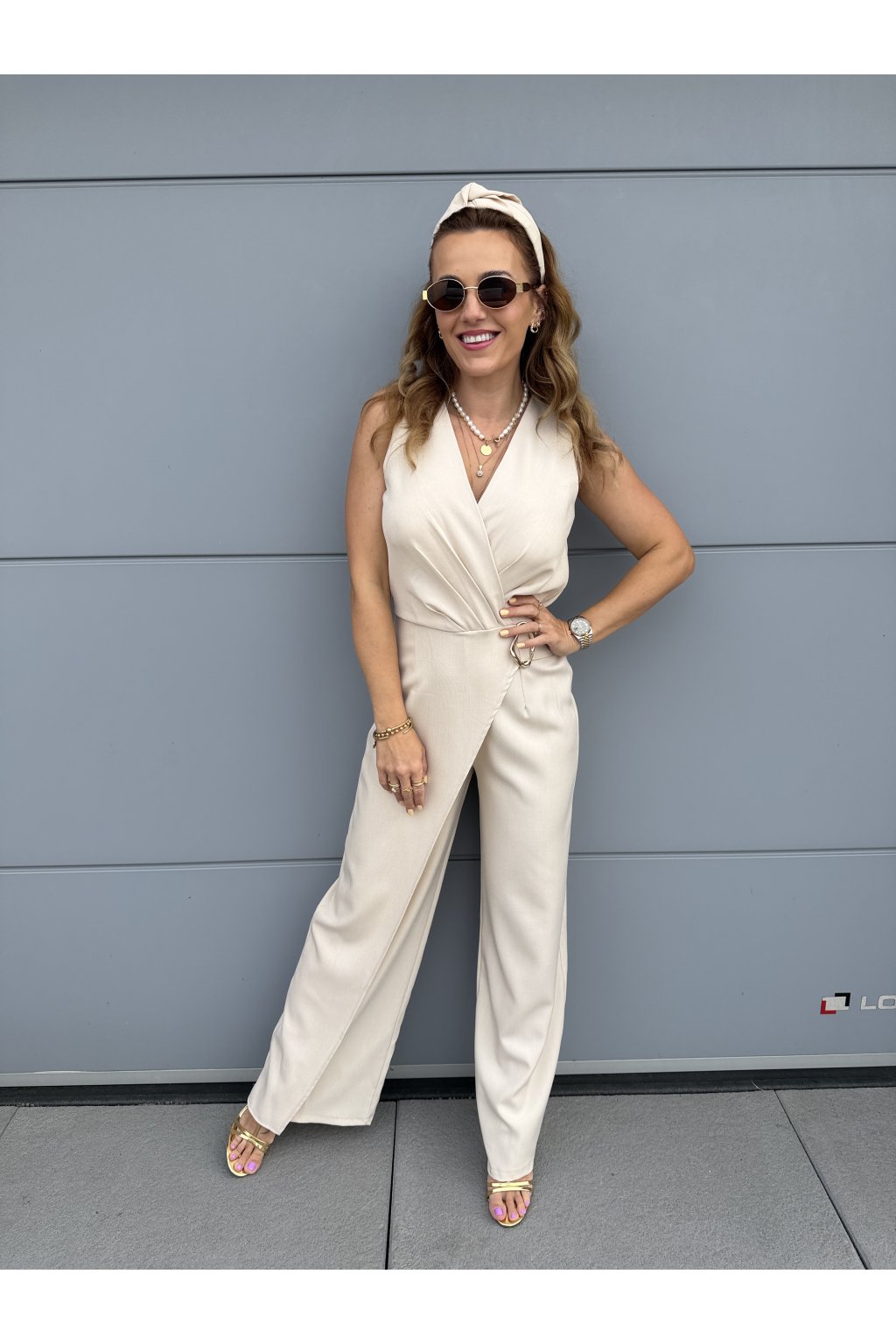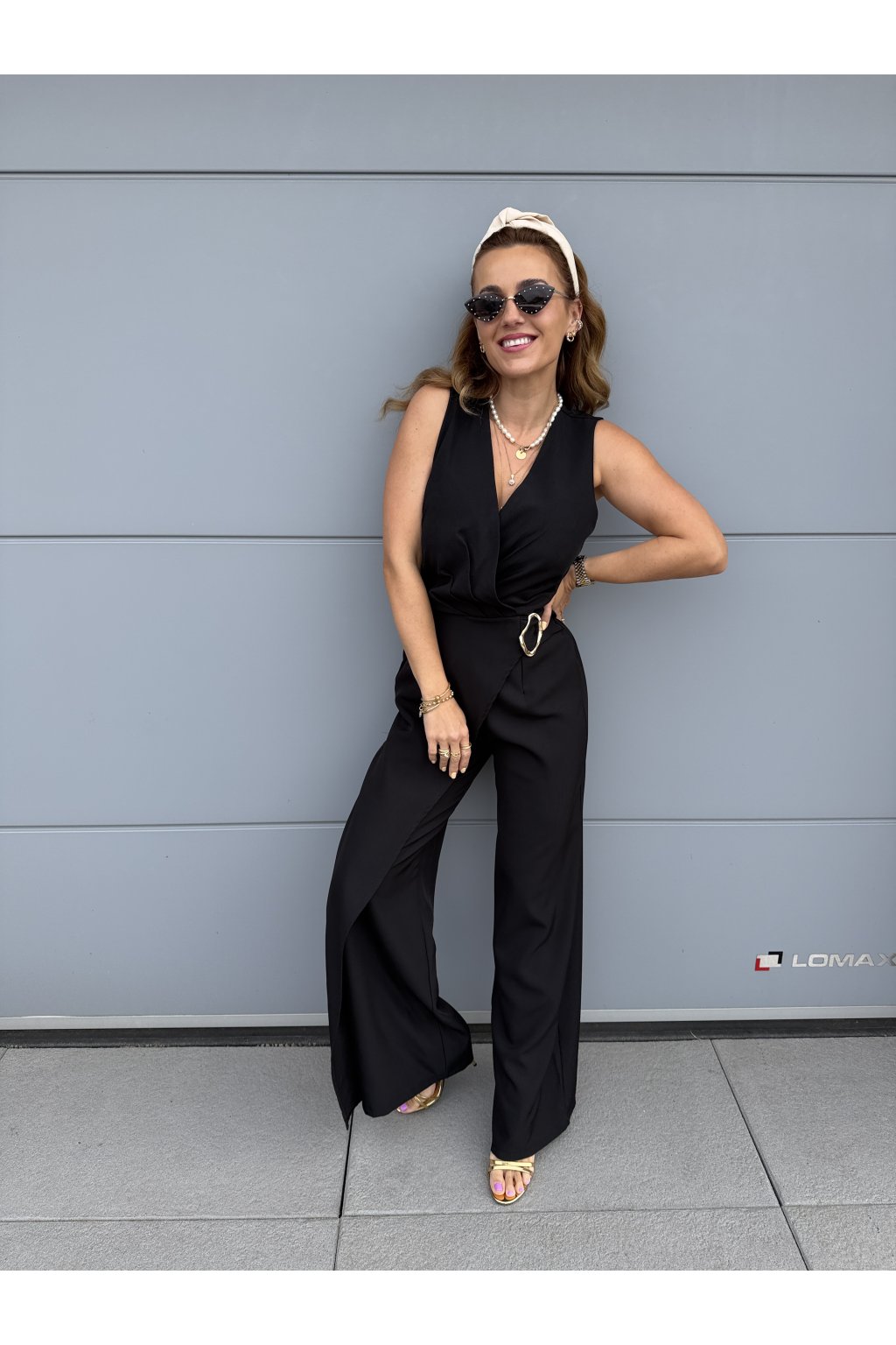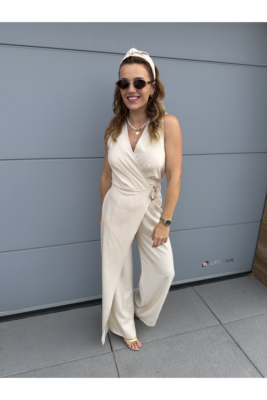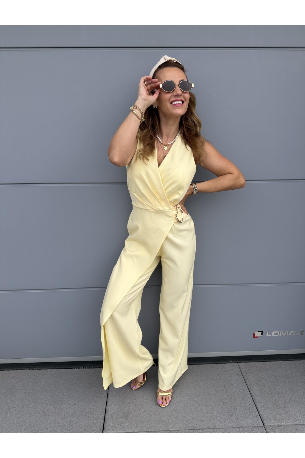 Elegantní overal GOLDEN s krásně splývavým střihem, který zaujme na první pohled. Přední část zdobí pruh látky s organickou zlatou sponou, která dodává luxusní detail. Vzadu má pružný pas pro pohodlné nošení a zapínání na jeden knoflík.