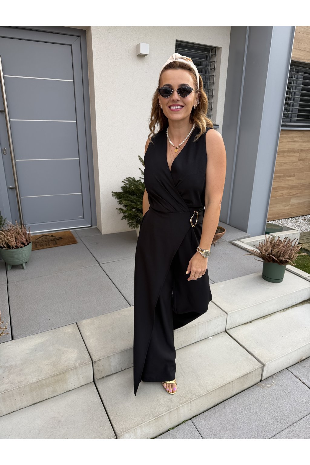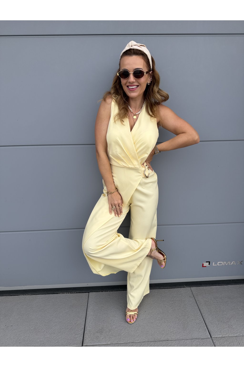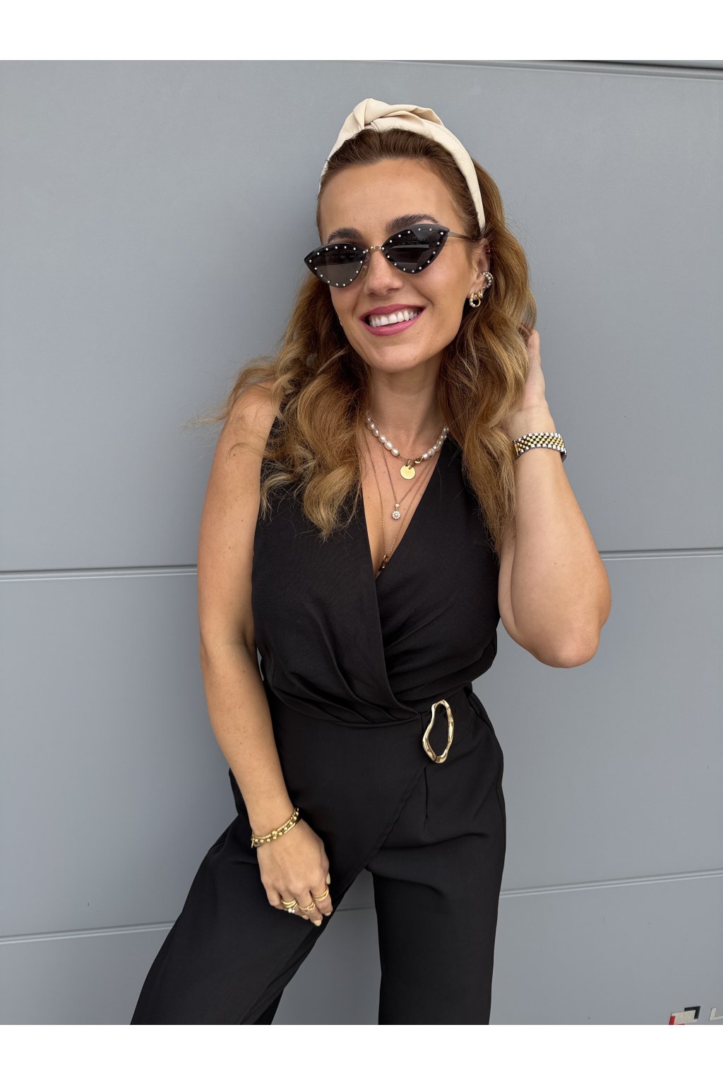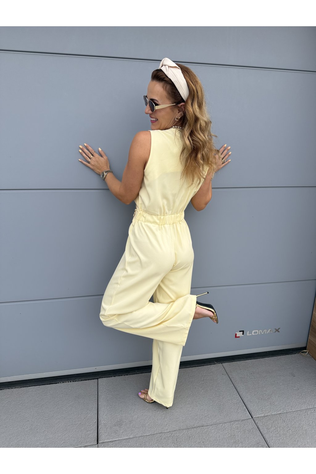 Elegantní overal GOLDEN s krásně splývavým střihem, který zaujme na první pohled. Přední část zdobí pruh látky s organickou zlatou sponou, která dodává luxusní detail. Vzadu má pružný pas pro pohodlné nošení a zapínání na jeden knoflík.