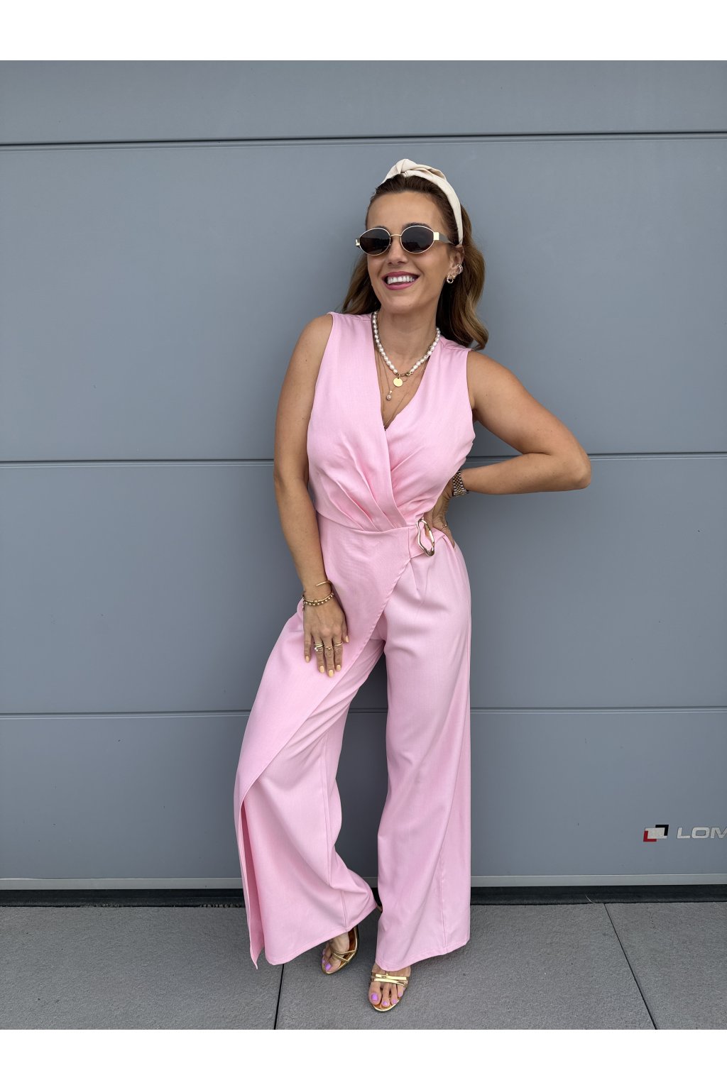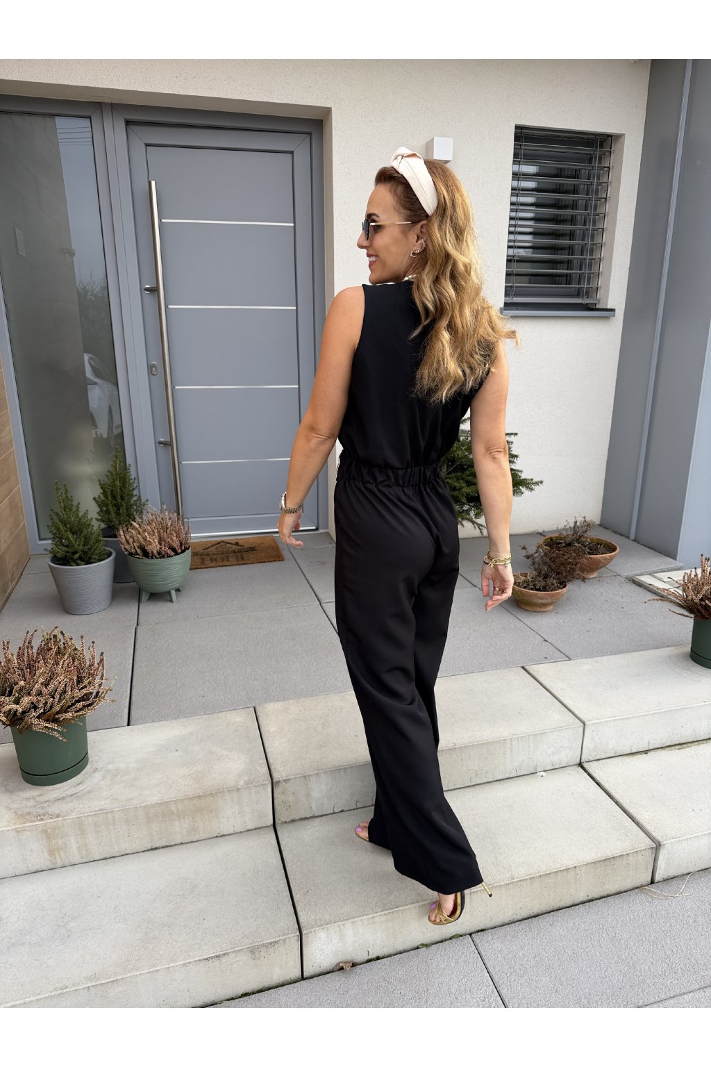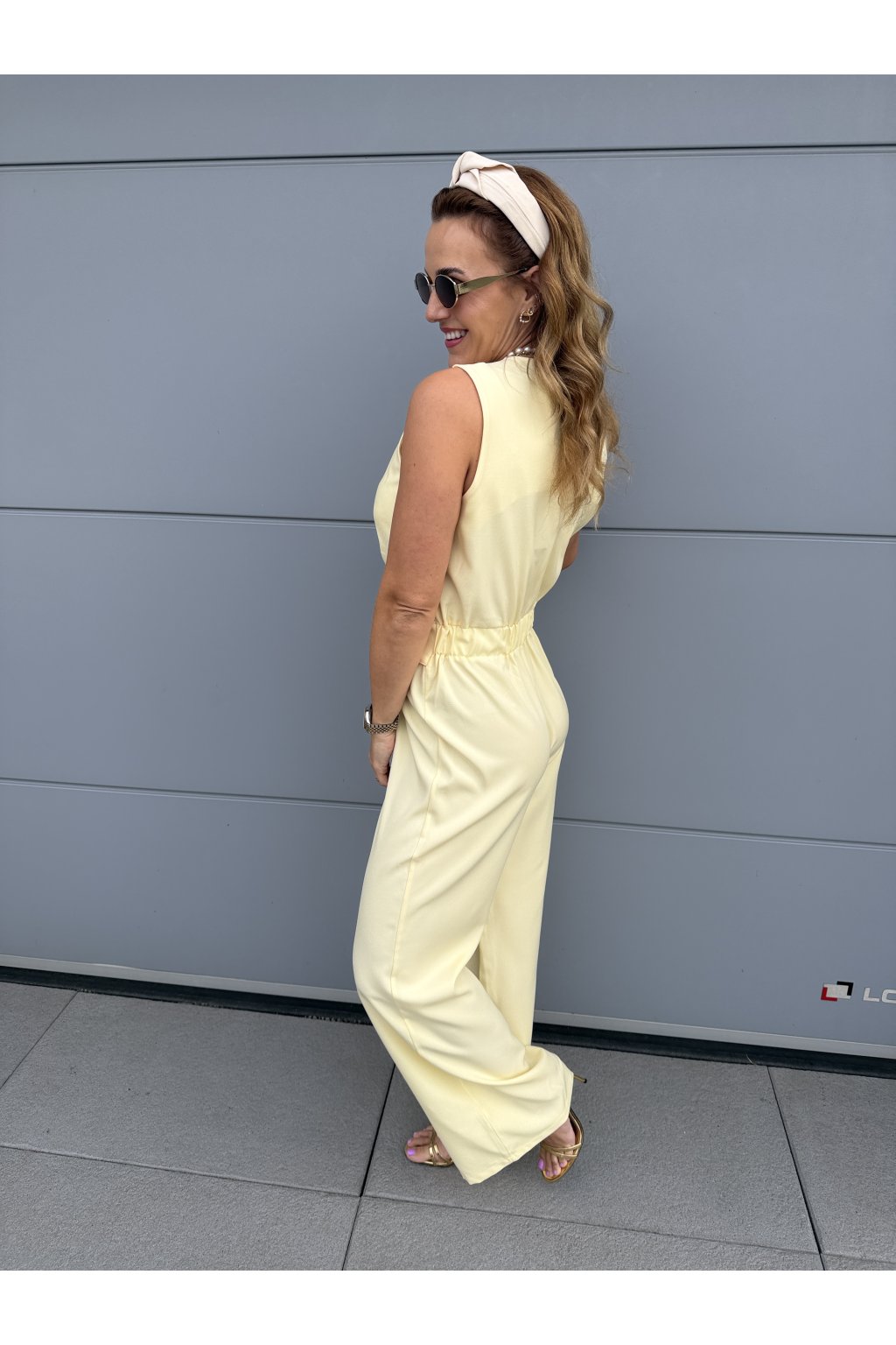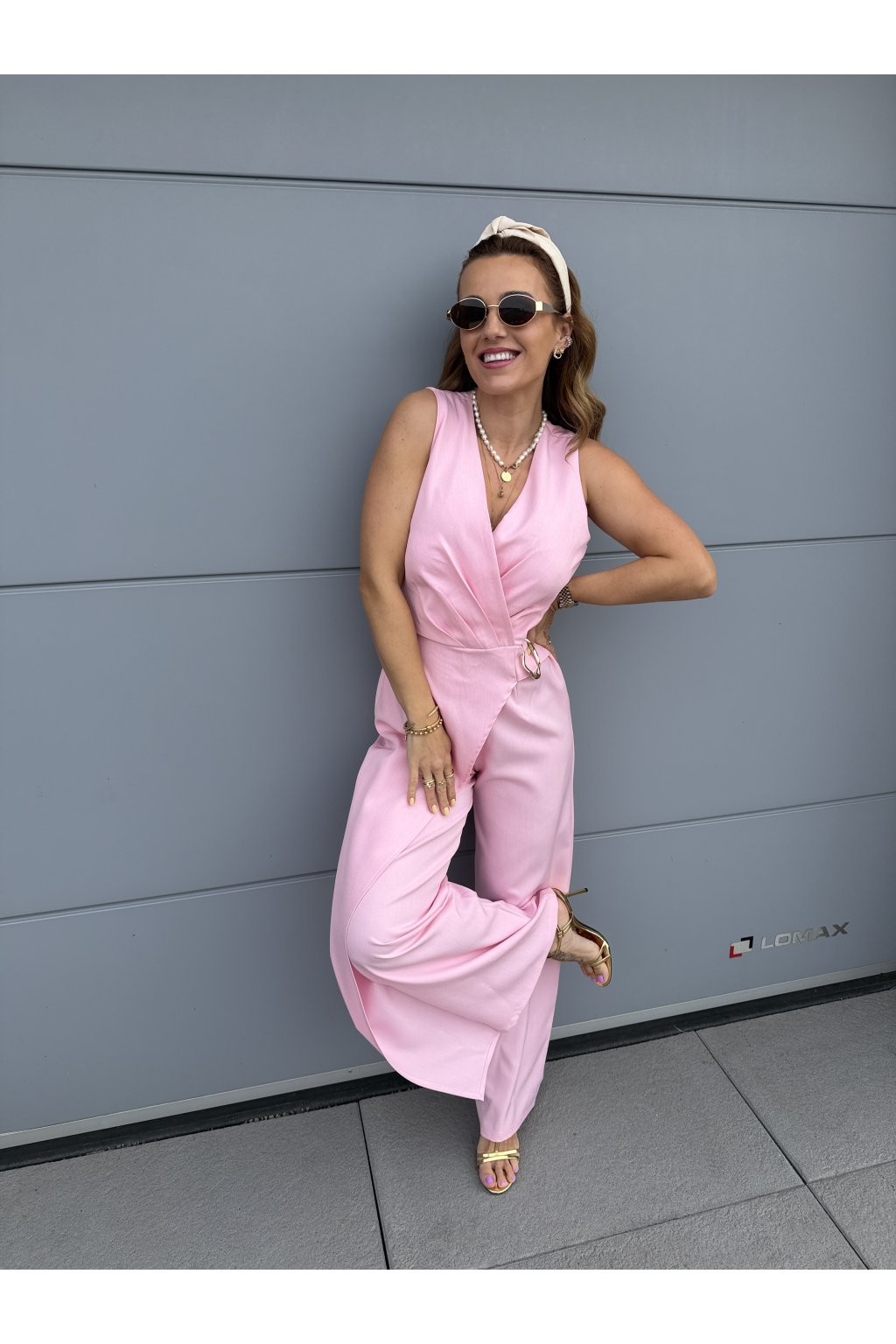 Elegantní overal GOLDEN s krásně splývavým střihem, který zaujme na první pohled. Přední část zdobí pruh látky s organickou zlatou sponou, která dodává luxusní detail. Vzadu má pružný pas pro pohodlné nošení a zapínání na jeden knoflík.