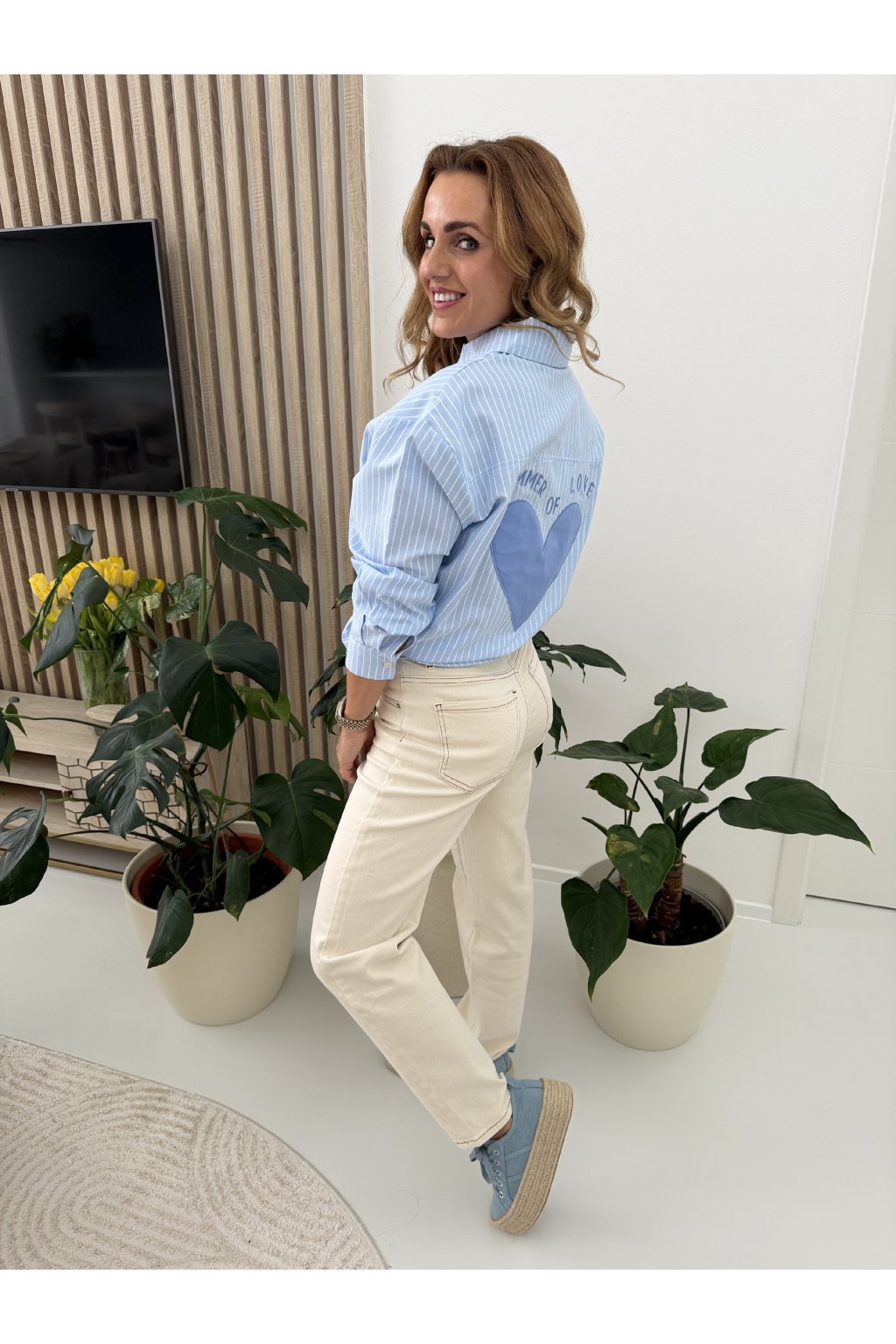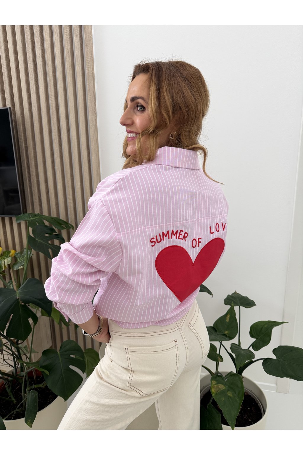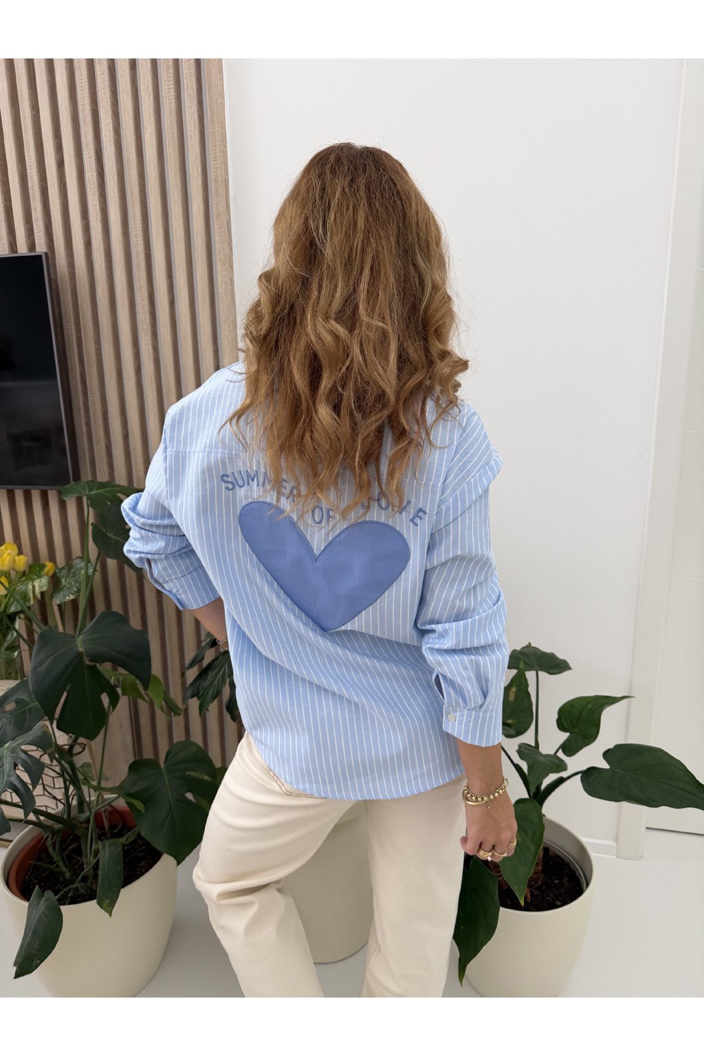 Stylová proužkovaná košile OF LOVE z příjemné bavlny, která spojuje klasiku s hravým detailem. Nadčasový střih s límečkem a zapínáním na knoflíky doplňuje jemná výšivka srdíčka na přední kapse. Zadní část zdobí výrazný nápis s velkým srdcem, který dodává košili originální a nepřehlédnutelný vzhled. Skvěle se hodí k džínům i elegantním kalhotám. Díky oversize střihu sedne od S až do velikosti L. Pro představu měřím 163cm a vážím 59kg.