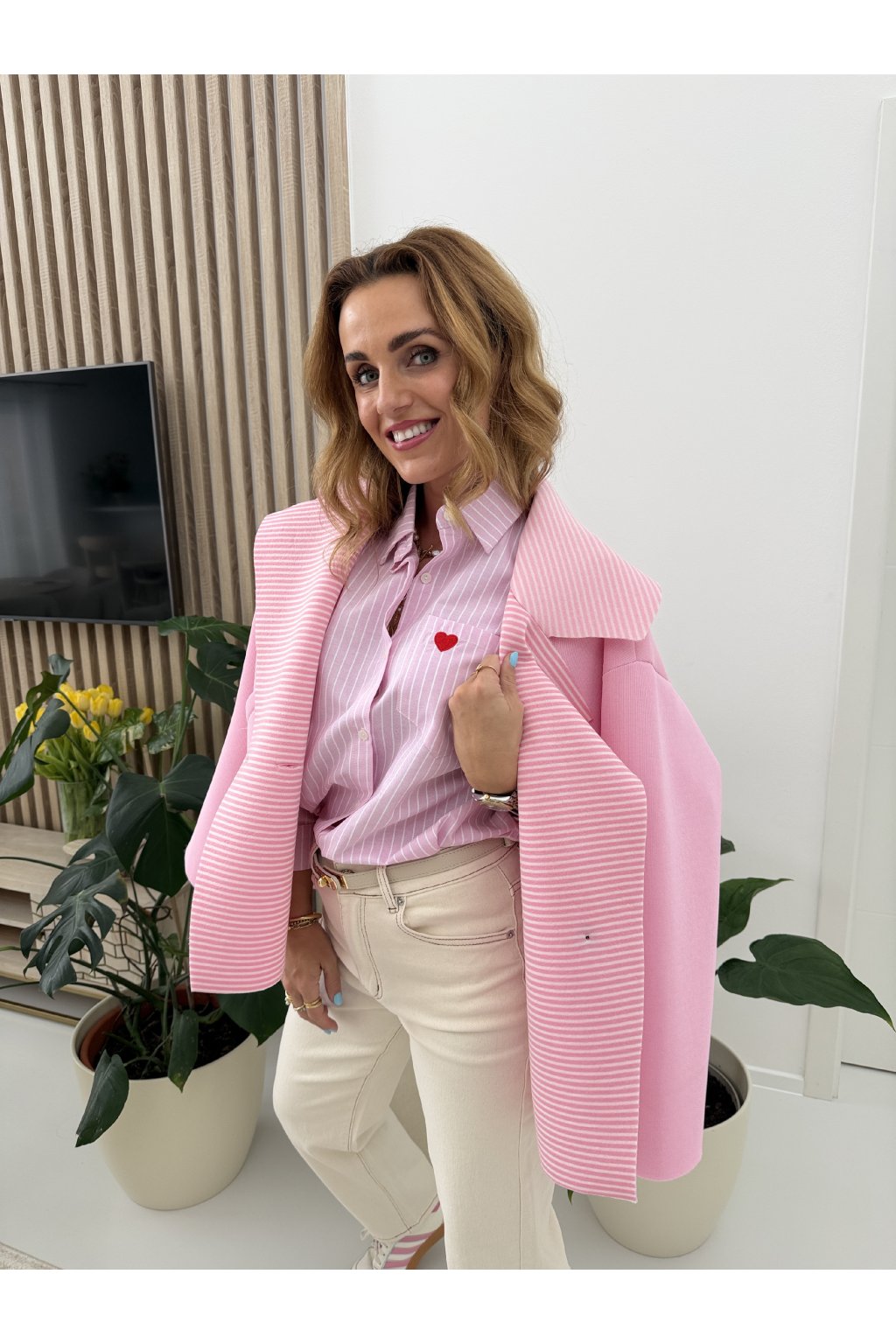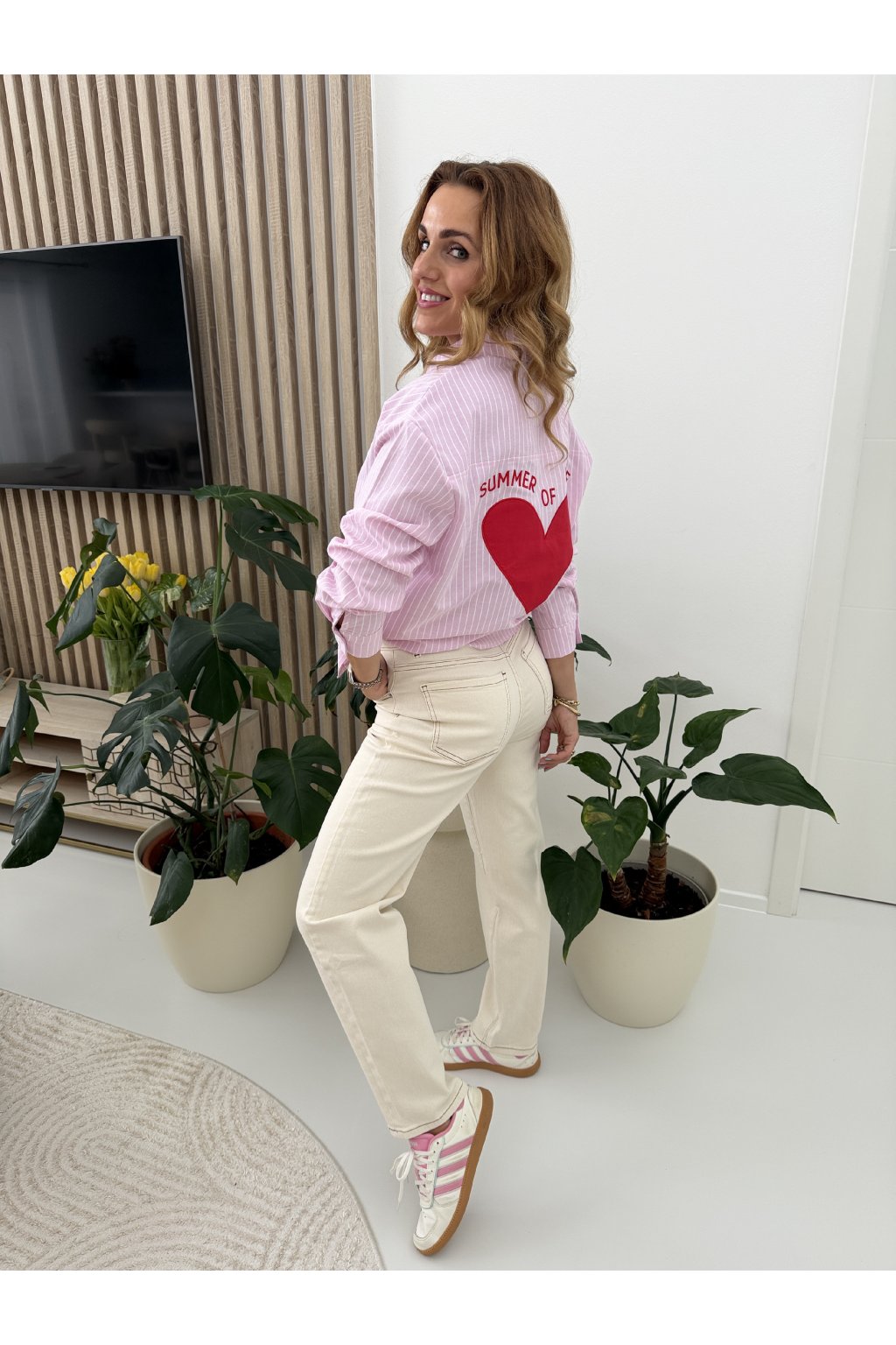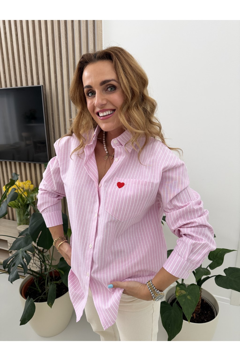 Stylová proužkovaná košile OF LOVE z příjemné bavlny, která spojuje klasiku s hravým detailem. Nadčasový střih s límečkem a zapínáním na knoflíky doplňuje jemná výšivka srdíčka na přední kapse. Zadní část zdobí výrazný nápis s velkým srdcem, který dodává košili originální a nepřehlédnutelný vzhled. Skvěle se hodí k džínům i elegantním kalhotám. Díky oversize střihu sedne od S až do velikosti L. Pro představu měřím 163cm a vážím 59kg.