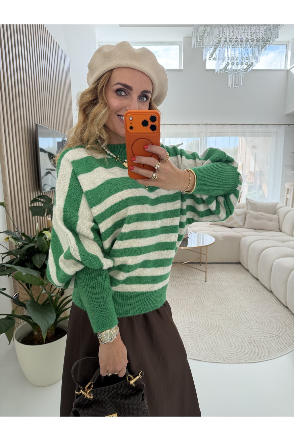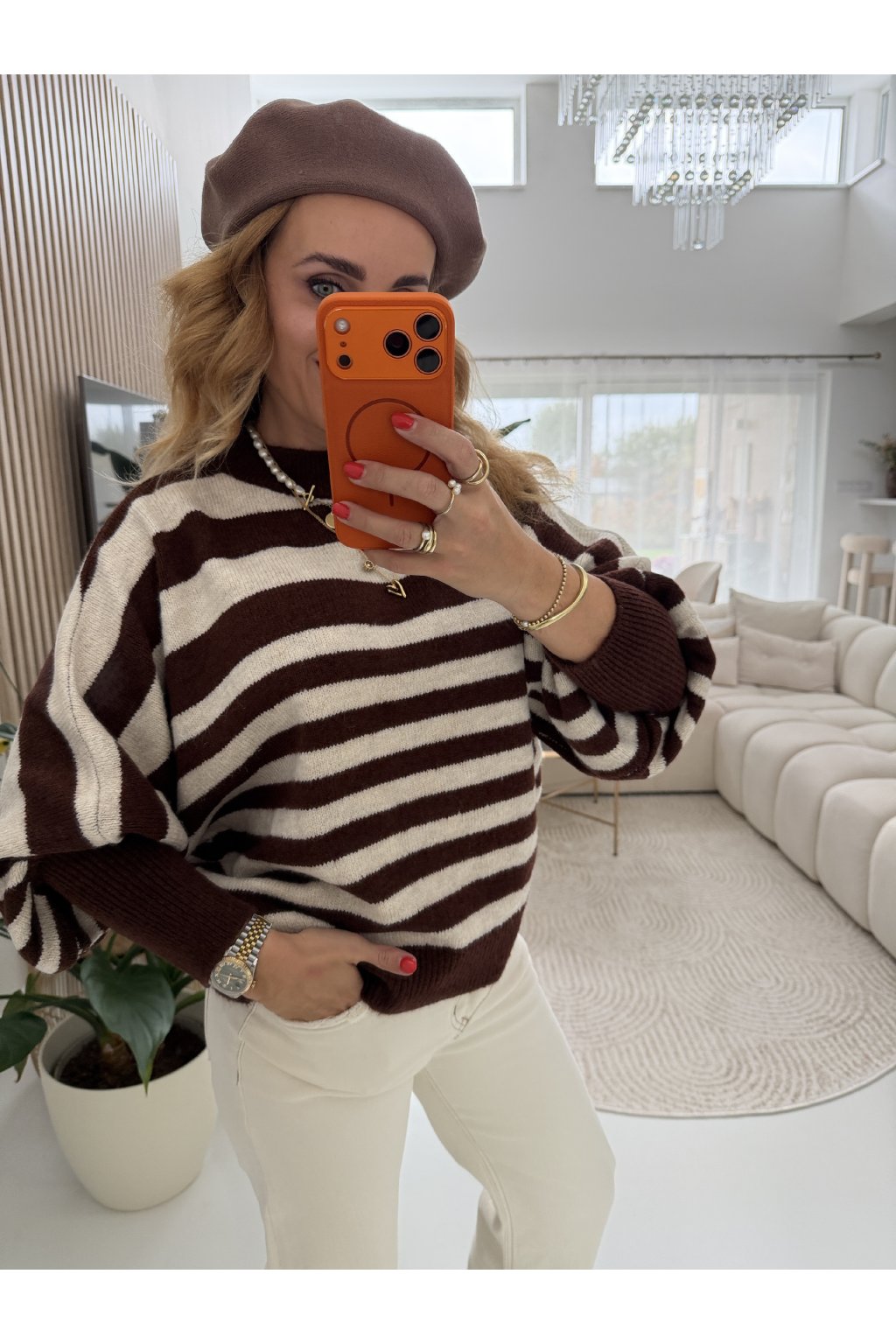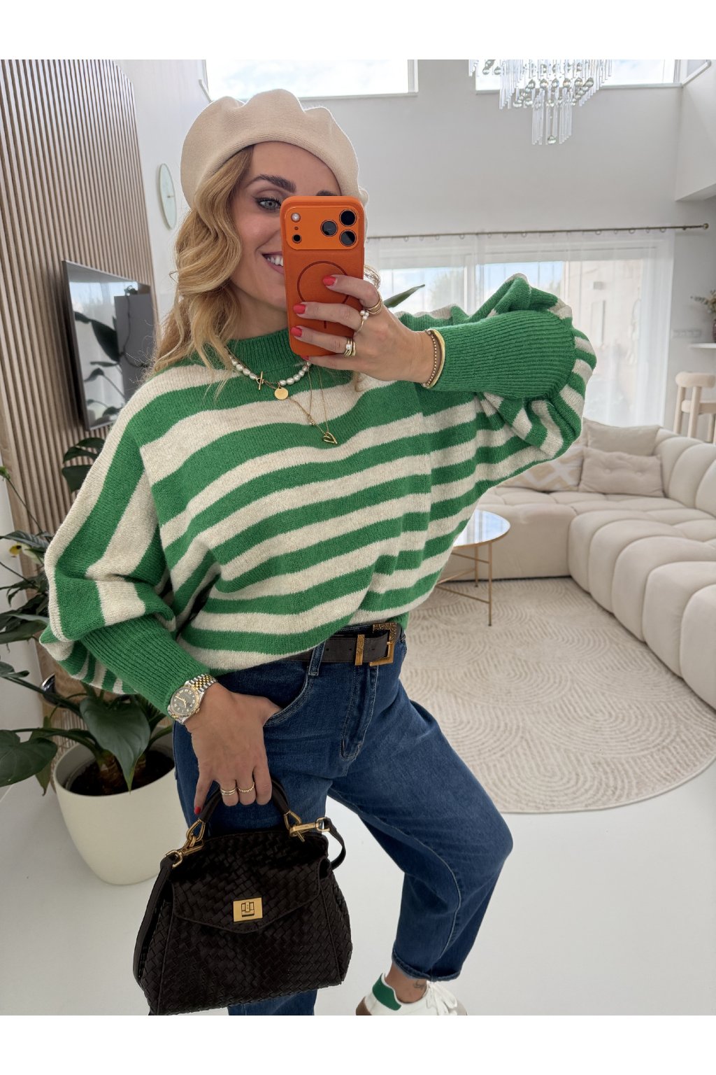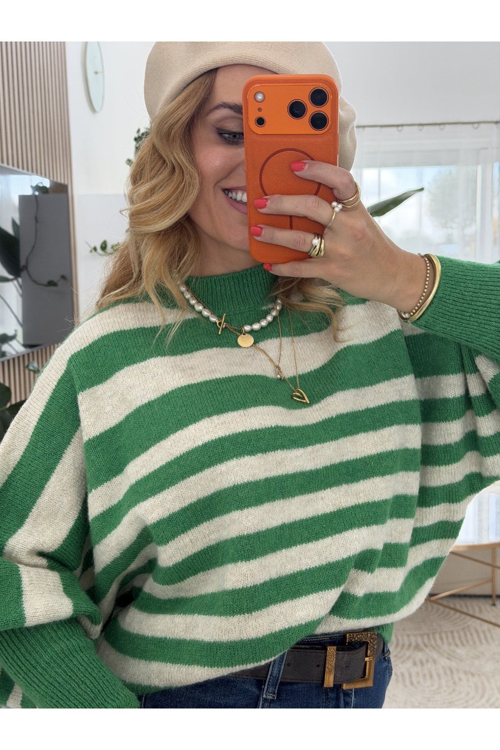 Stylový pruhovaný svetr s netopýřími rukávy, které mu dodávají ležérní a elegantní vzhled. Díky zúženým manžetám skvěle drží tvar a působí žensky i pohodlně zároveň.