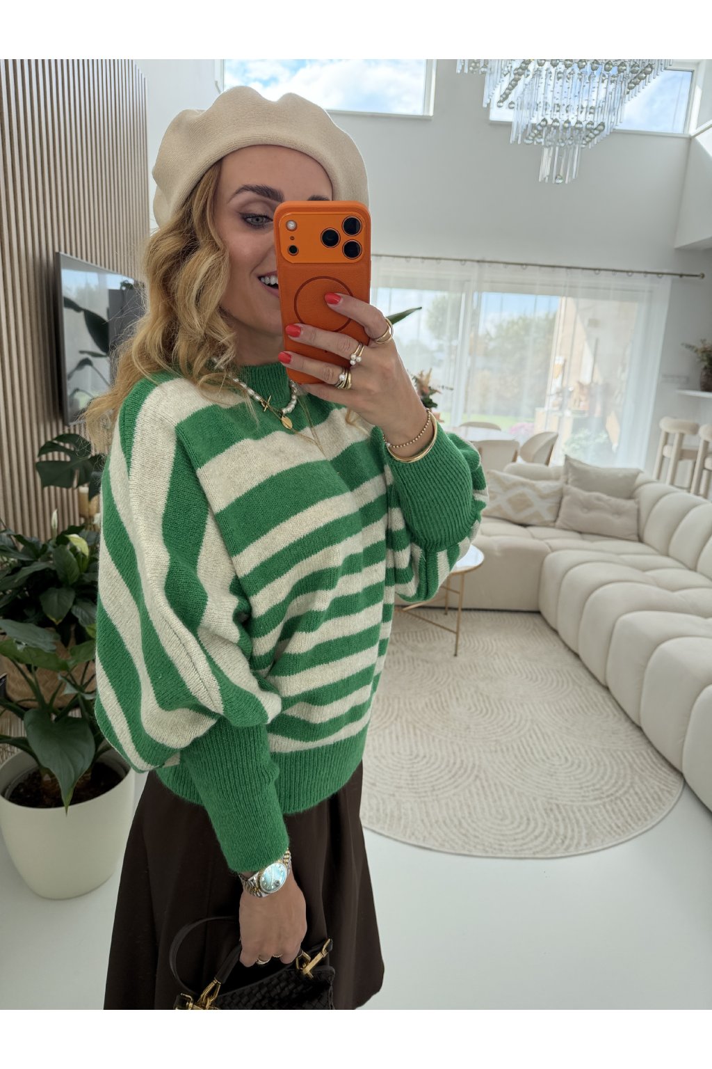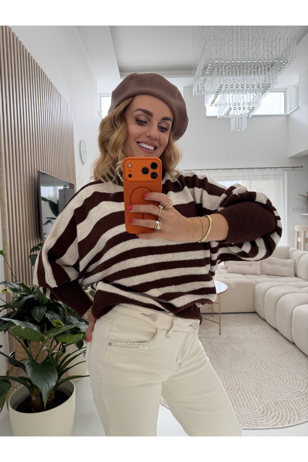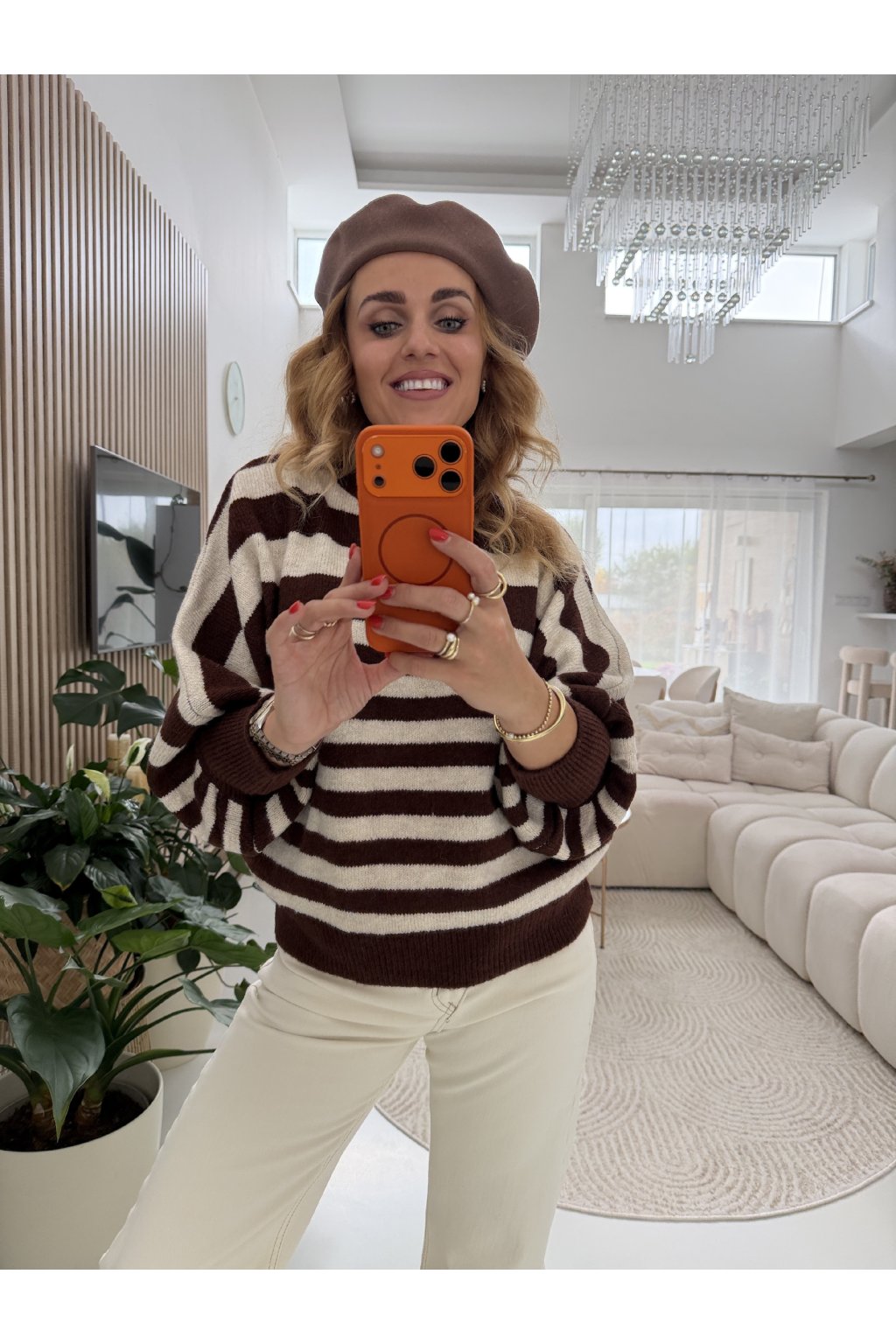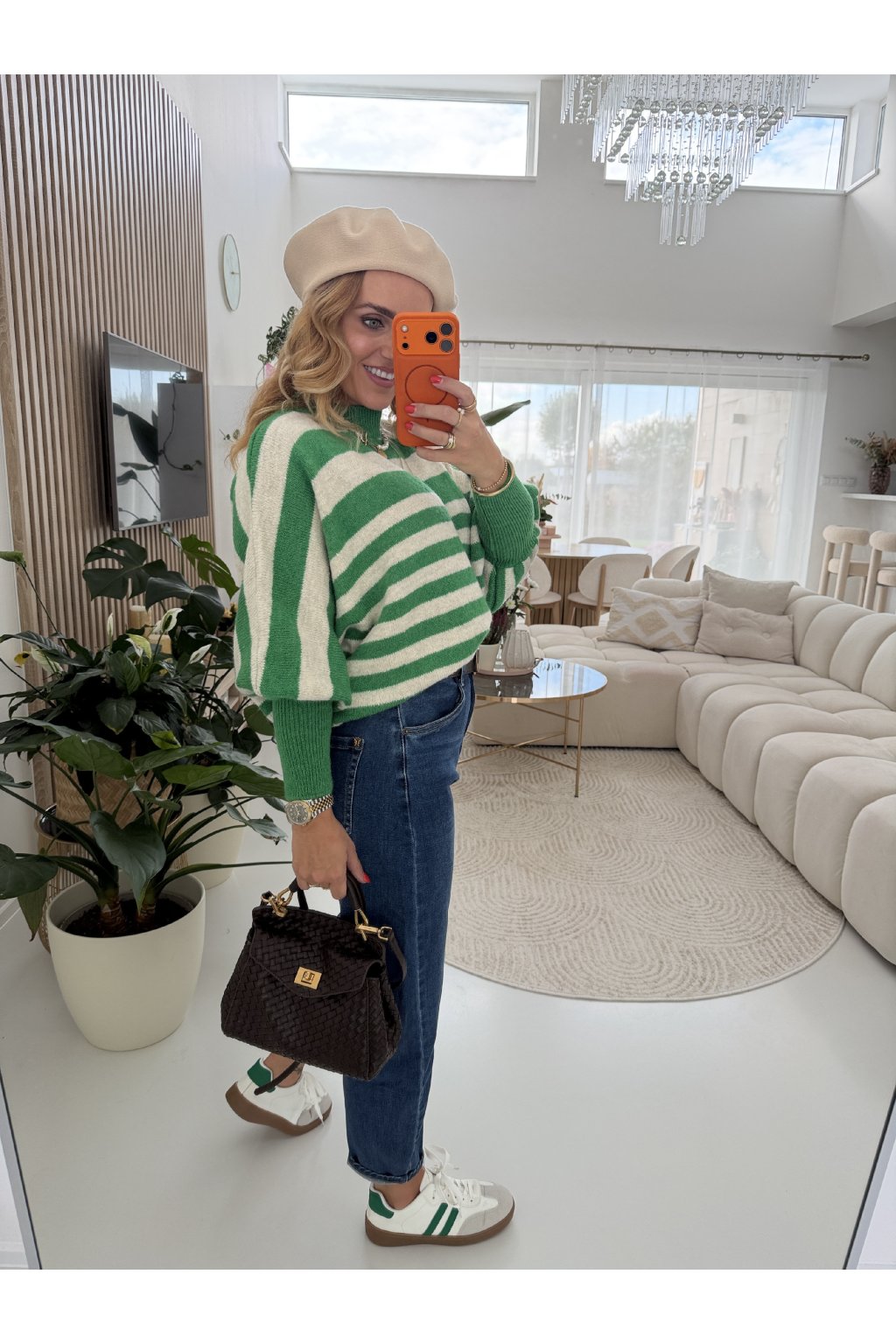 Stylový pruhovaný svetr s netopýřími rukávy, které mu dodávají ležérní a elegantní vzhled. Díky zúženým manžetám skvěle drží tvar a působí žensky i pohodlně zároveň.