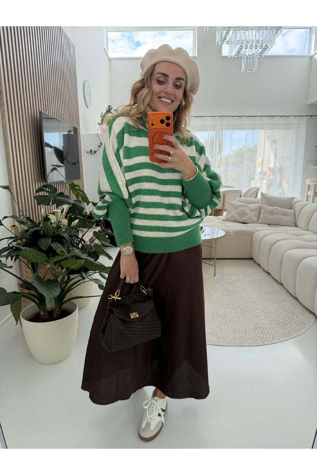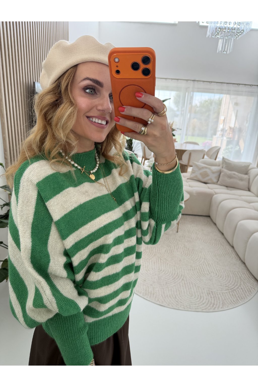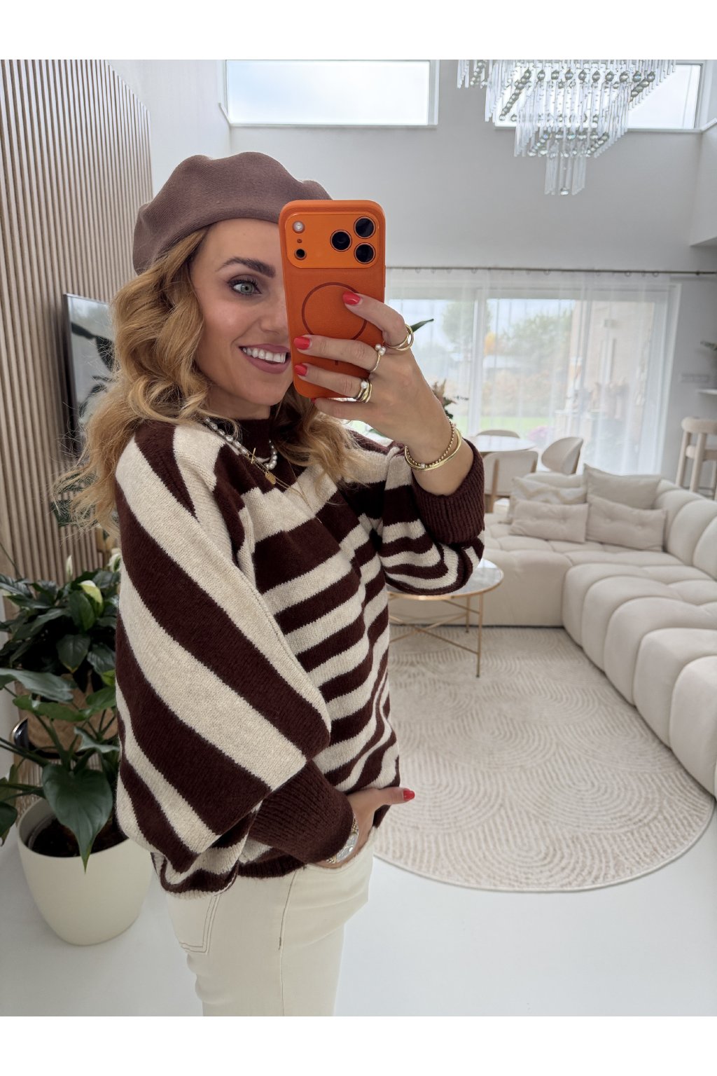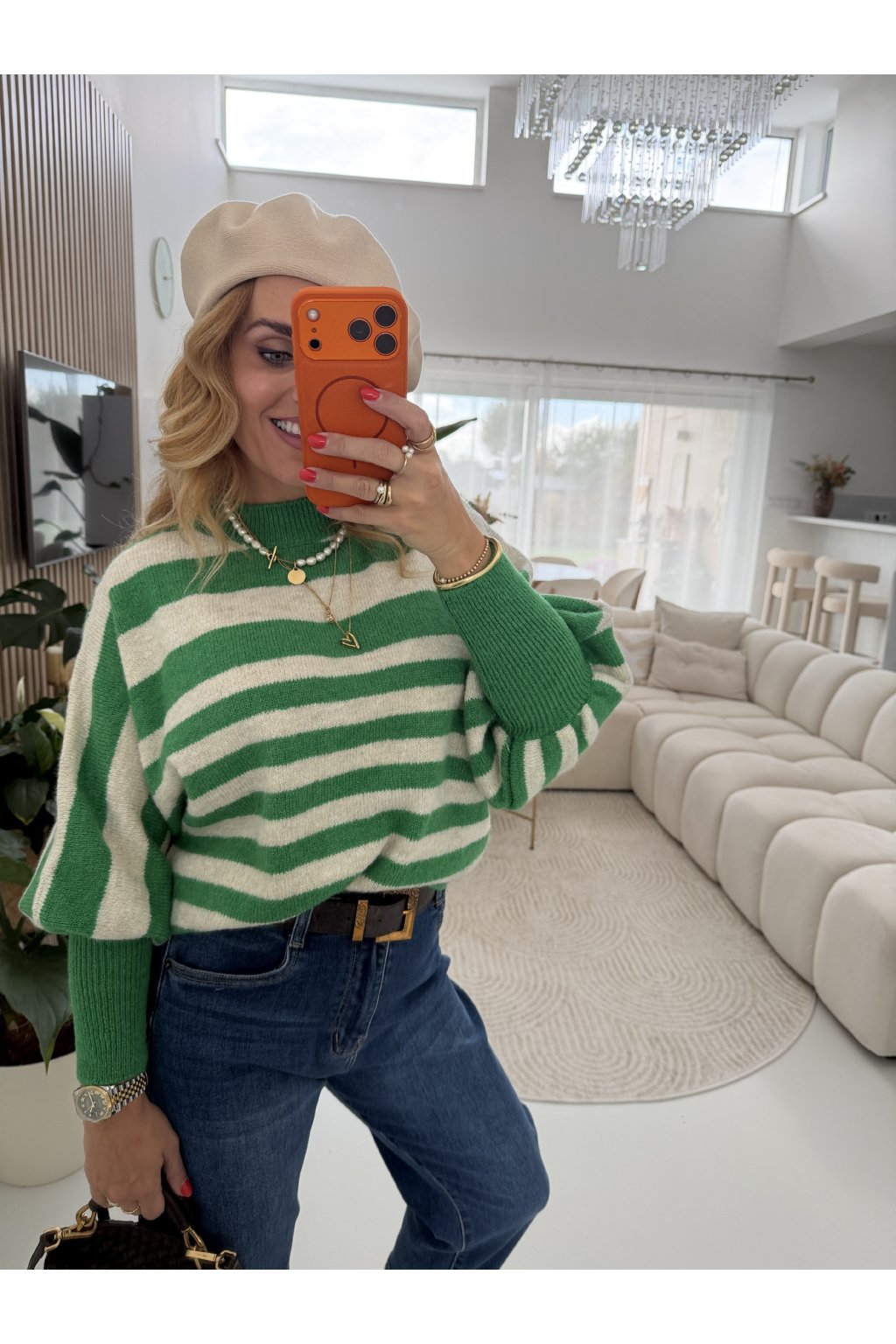Stylový pruhovaný svetr s netopýřími rukávy, které mu dodávají ležérní a elegantní vzhled. Díky zúženým manžetám skvěle drží tvar a působí žensky i pohodlně zároveň.