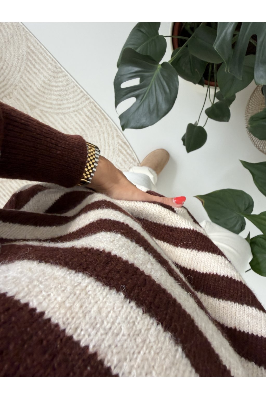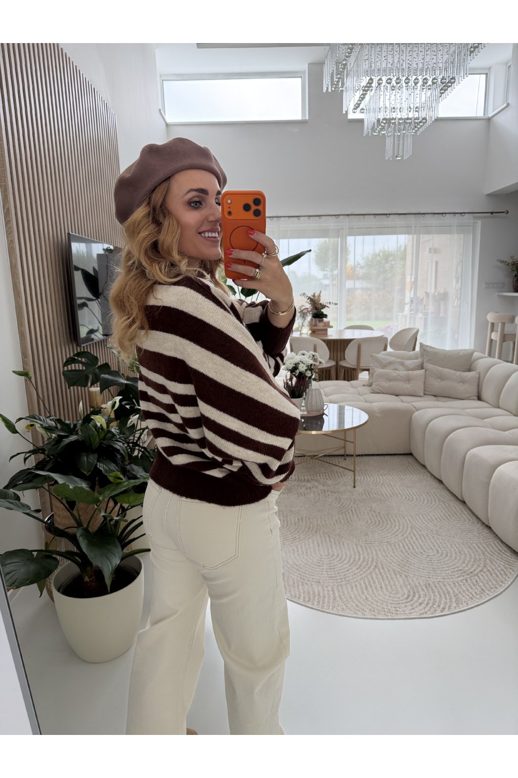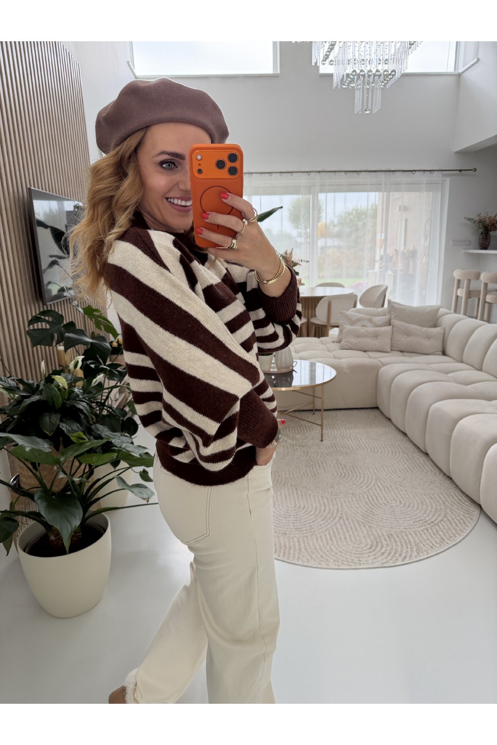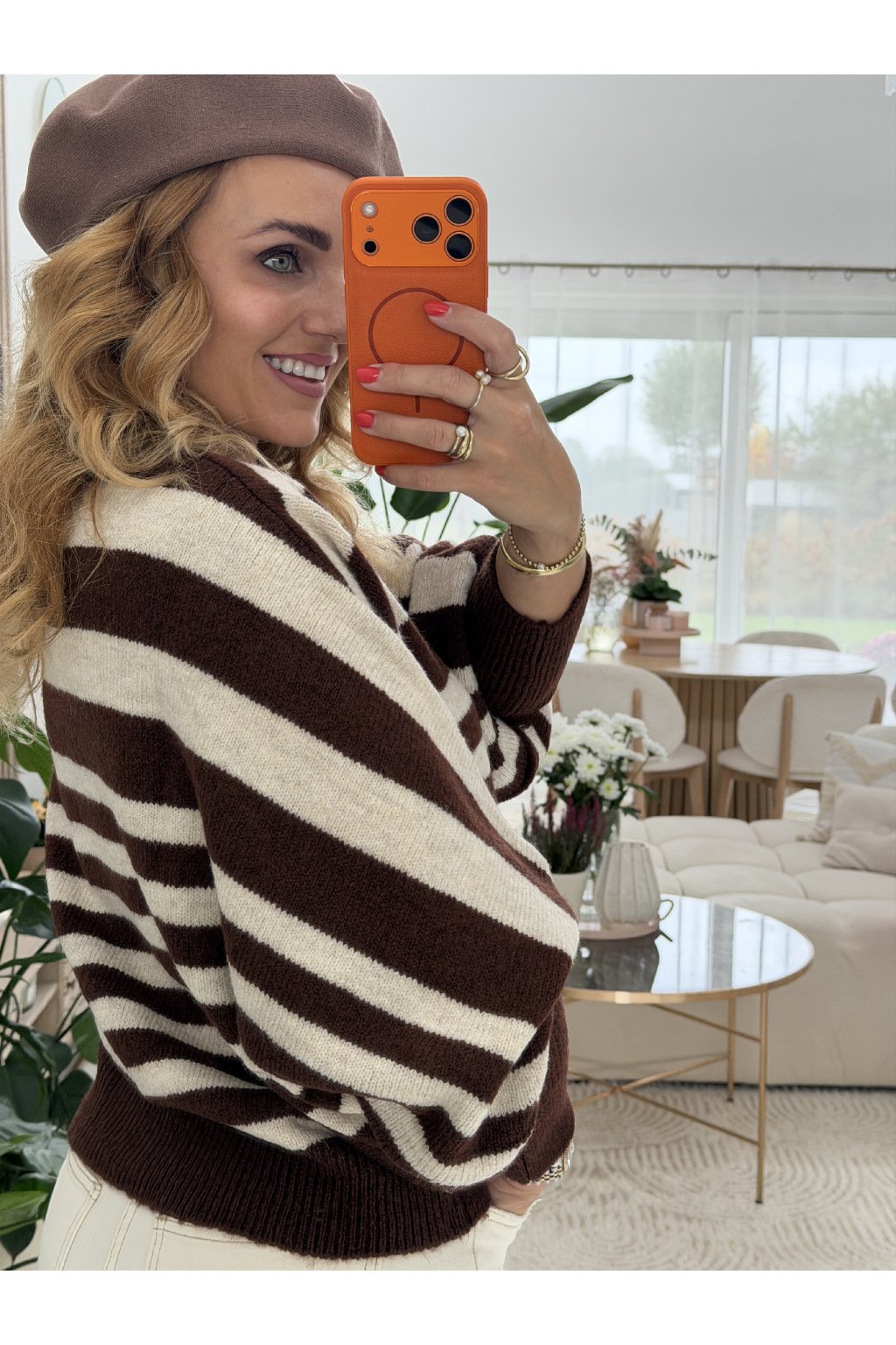 Stylový pruhovaný svetr s netopýřími rukávy, které mu dodávají ležérní a elegantní vzhled. Díky zúženým manžetám skvěle drží tvar a působí žensky i pohodlně zároveň.