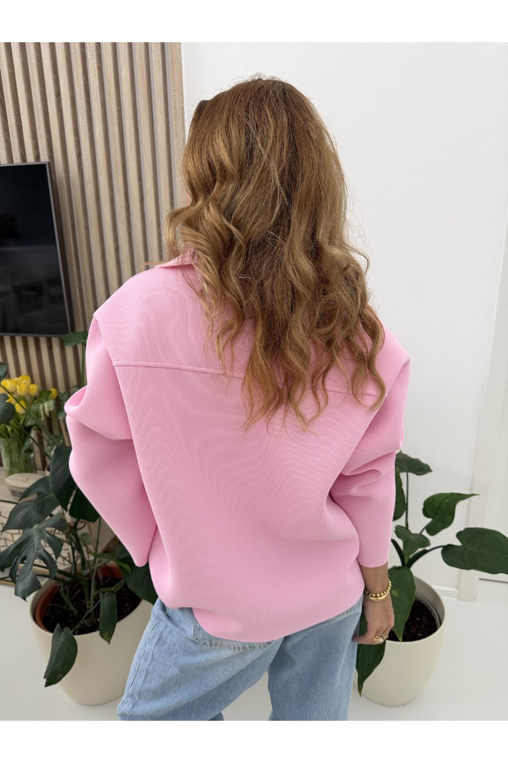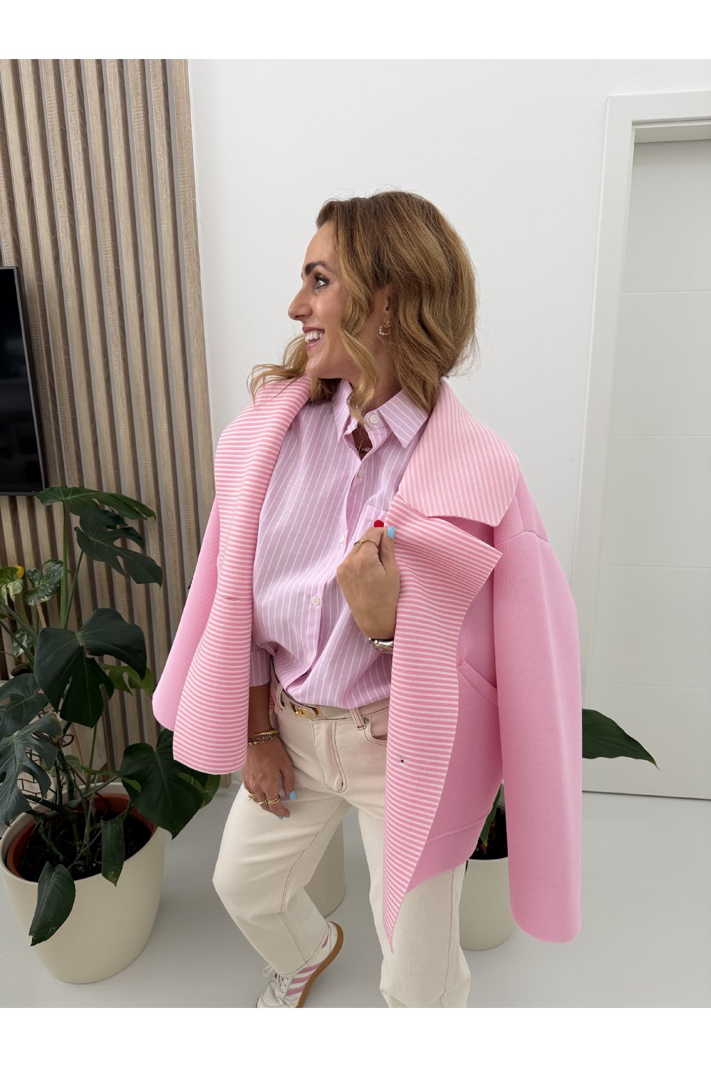 Stylový růžový kabátek LARA v moderním oversize střihu, který zaujme na první pohled. Má výrazný límec, dvojřadé zapínání na knoflíky a praktické přední kapsy. Příjemný, pevnější materiál krásně drží tvar a dodá outfitu šmrnc i eleganci. Skvěle se kombinuje s džínami i elegantními kalhotami ideální kousek pro vrstvení v přechodném období. Sedne od velikosti S až do velikosti L.