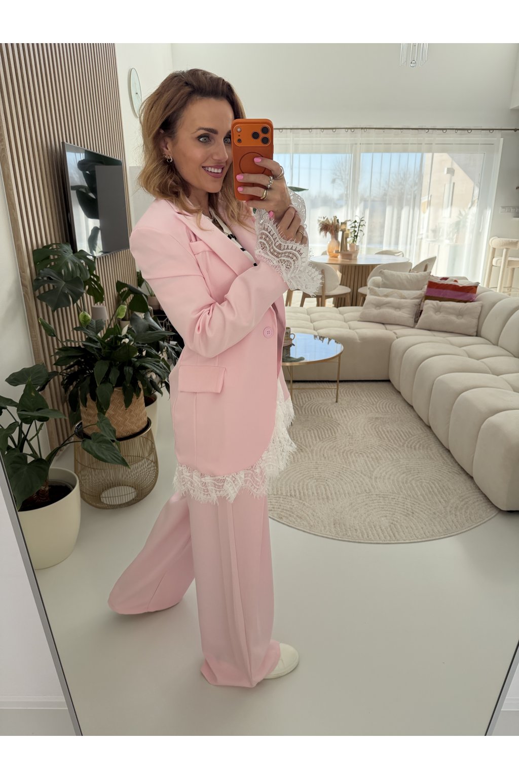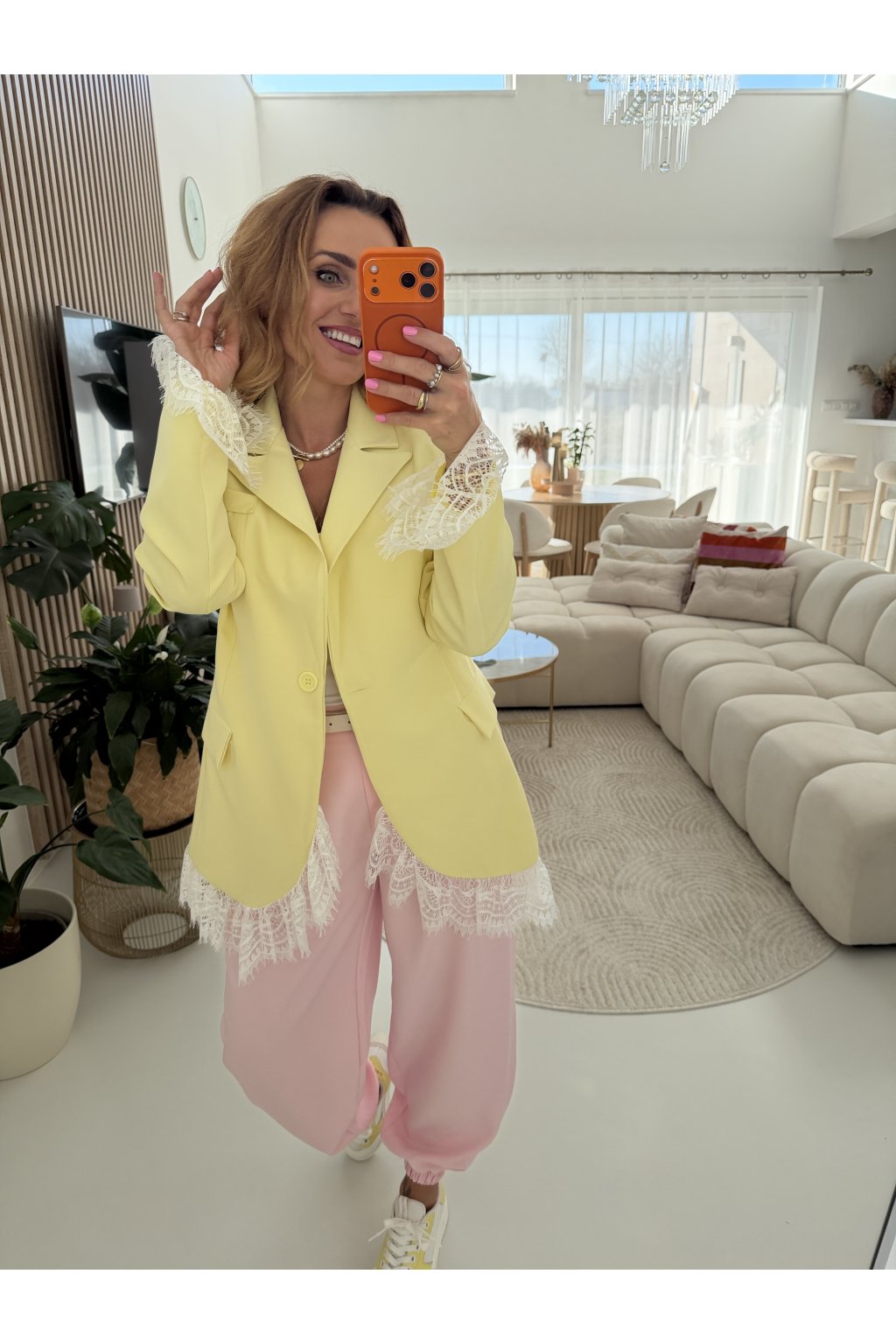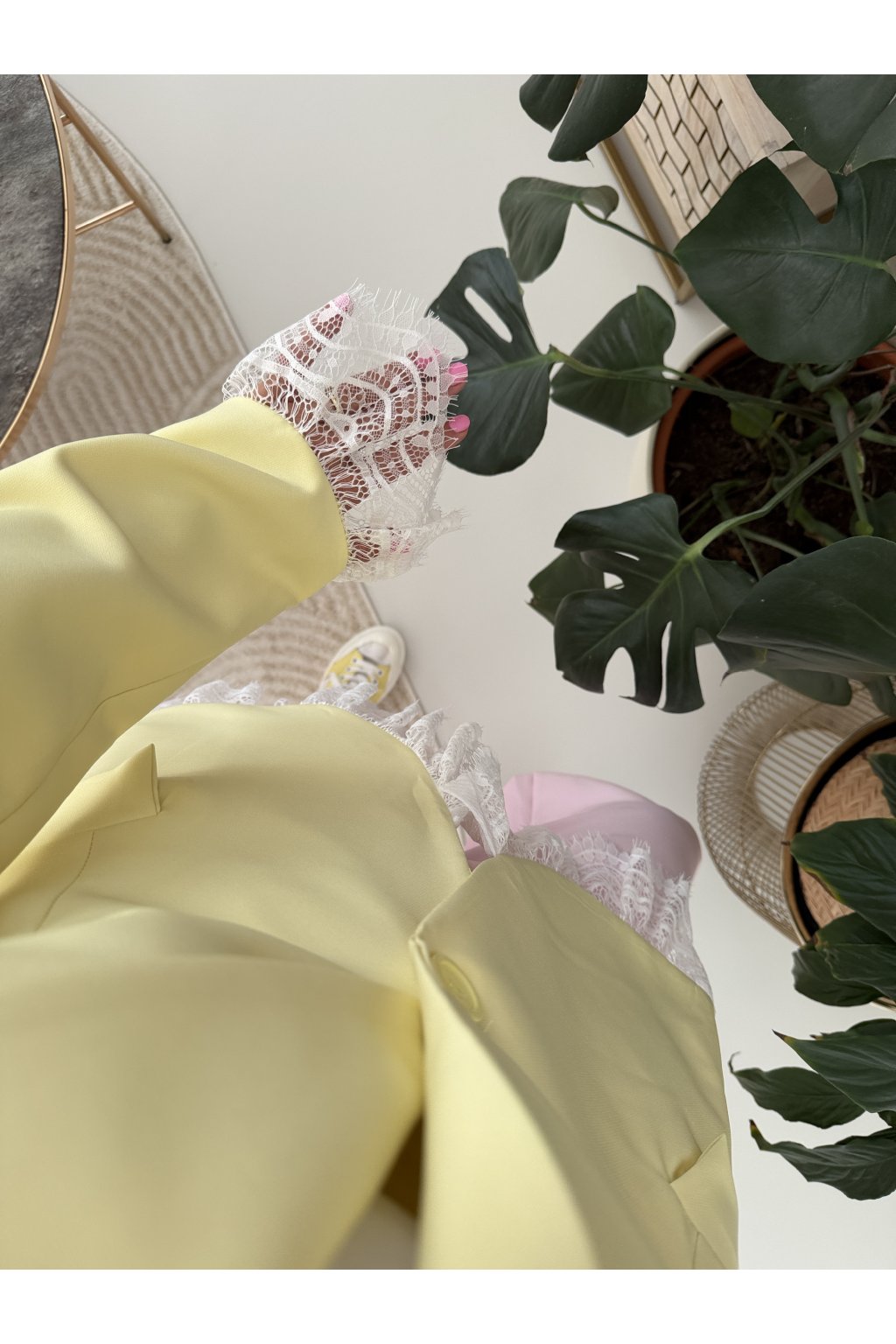 Elegantní sako MON AMOUR II. s jemnými krajkovými detaily, které dodávají celému kousku ženskost a originalitu. Klasický střih je ozvláštněn krajkou na rukávech a spodním lemu, díky čemuž sako působí výjimečně, ale stále velmi nositelně. Perfektní volba jak k elegantním kalhotám, tak i k ležérnějším outfitům.