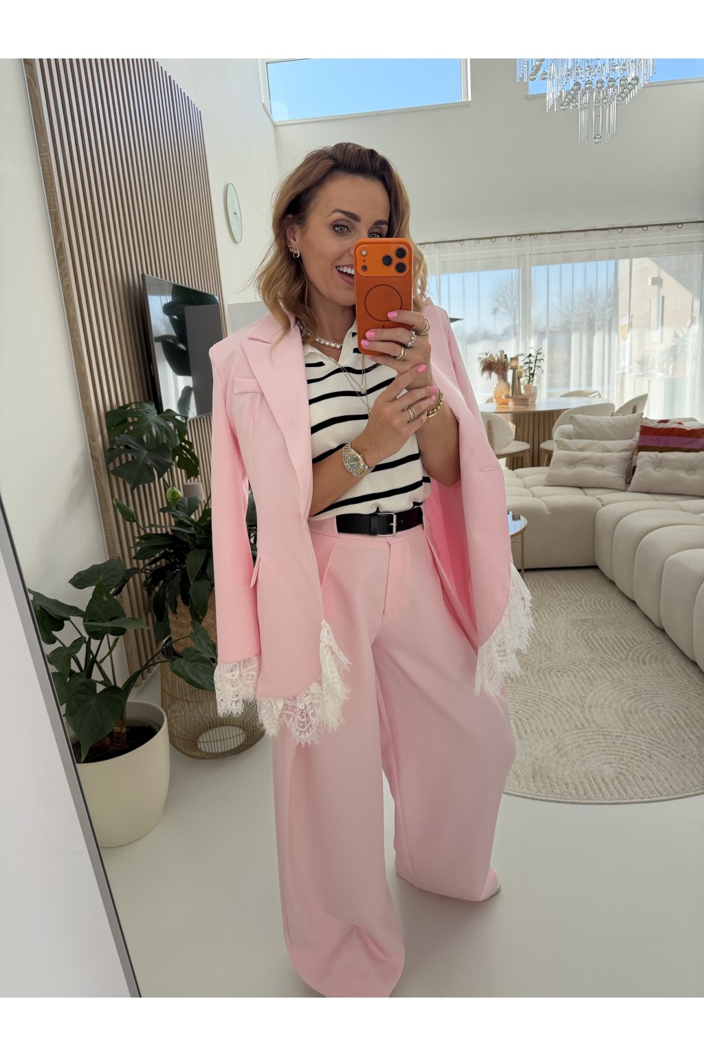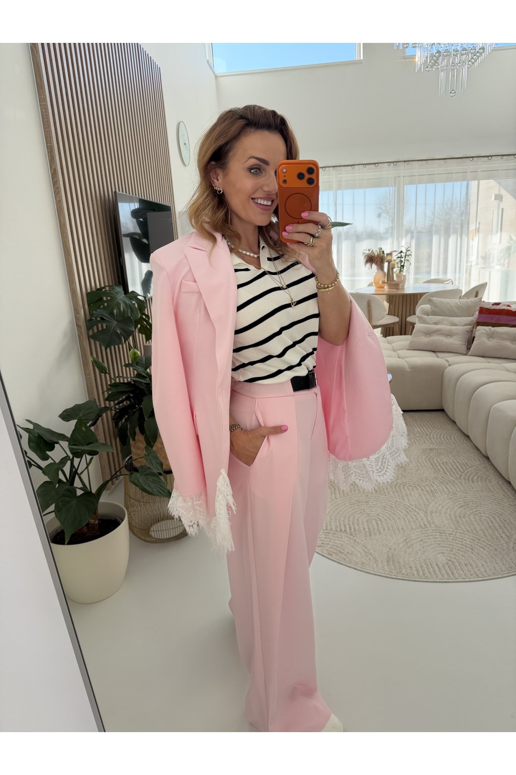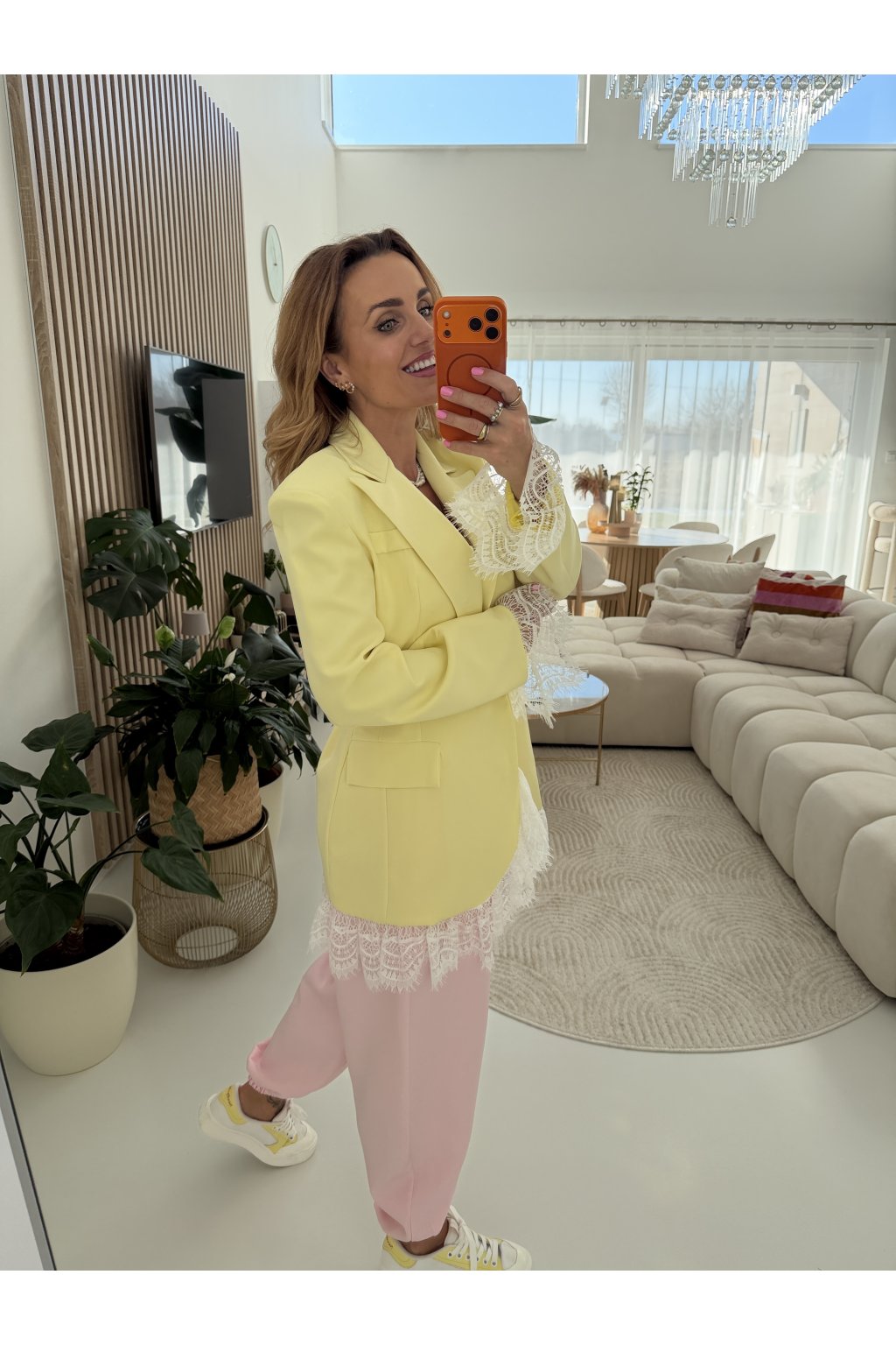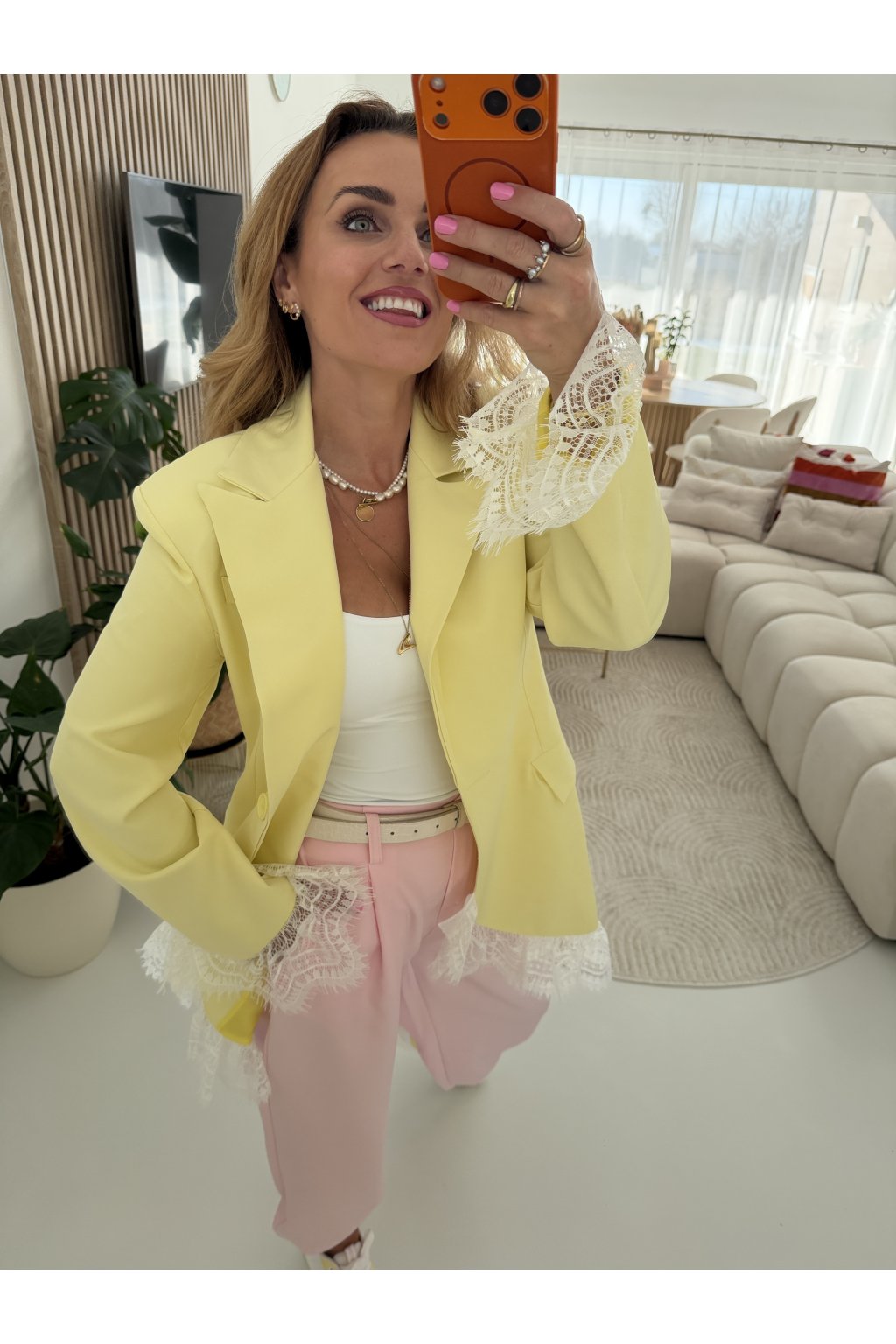 Elegantní sako MON AMOUR II. s jemnými krajkovými detaily, které dodávají celému kousku ženskost a originalitu. Klasický střih je ozvláštněn krajkou na rukávech a spodním lemu, díky čemuž sako působí výjimečně, ale stále velmi nositelně. Perfektní volba jak k elegantním kalhotám, tak i k ležérnějším outfitům.