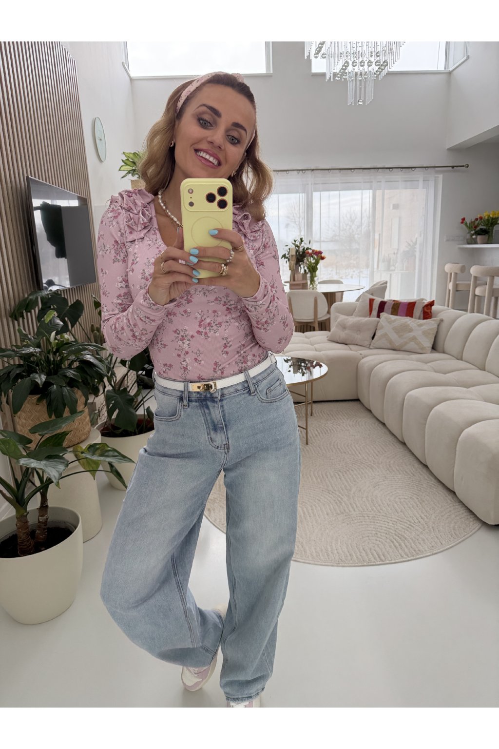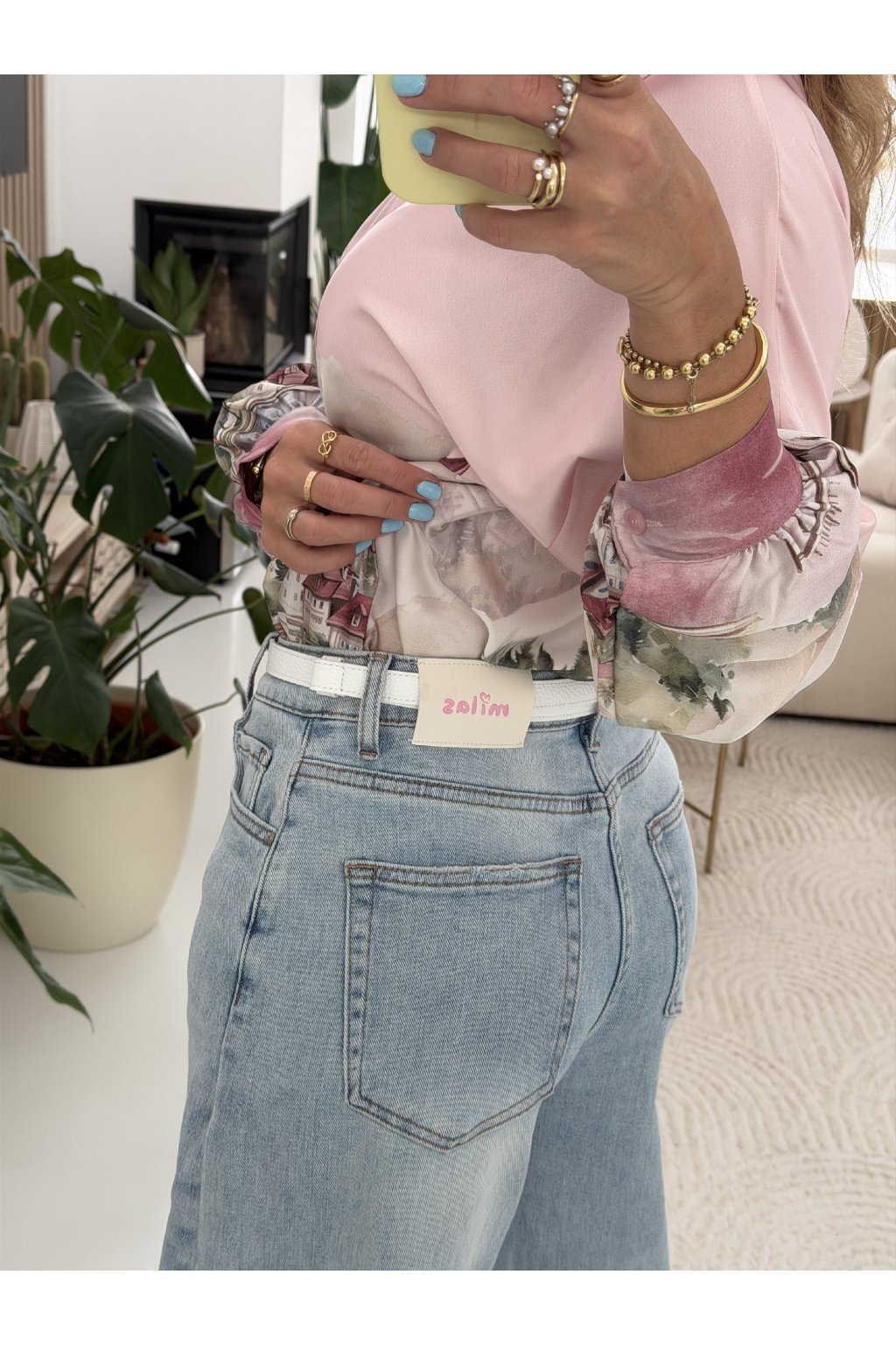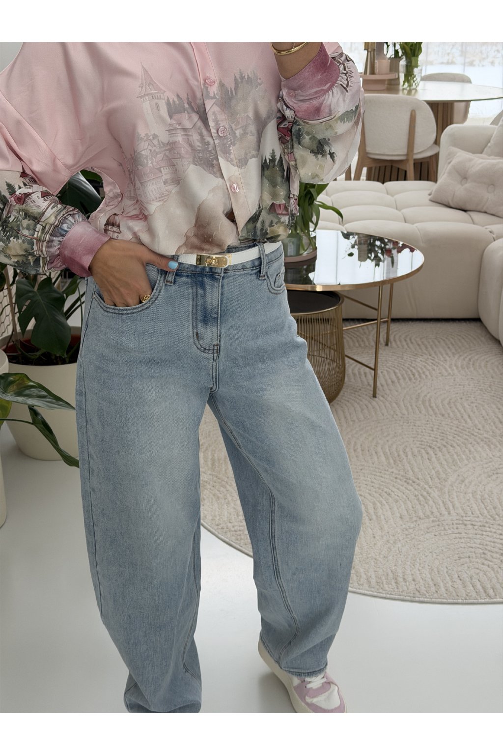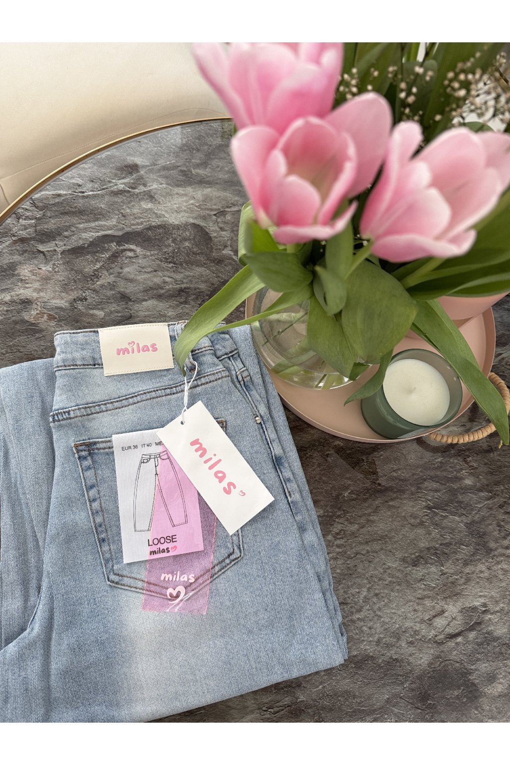 Světle modré džíny MILAS v jemném jarním odstínu denimu, který krásně rozsvítí každý outfit. Ležérní, rovnější střih s vyšším pasem lichotí postavě, opticky prodlouží nohy a zvýrazní pas. Skvěle sedí ženám s užším i výraznějším pasem, sluší štíhlé i ženským křivkám, protože přirozeně vyváží proporce. Na zadní části je doplňuje bílo růžová visačka, která jim dodává něžný a hravý detail. Ideální kousek na jaro k teniskám, balerínám i sandálům. Pro představu měřím 163cm a vážím 59kg. Na sobě mám velikost S.