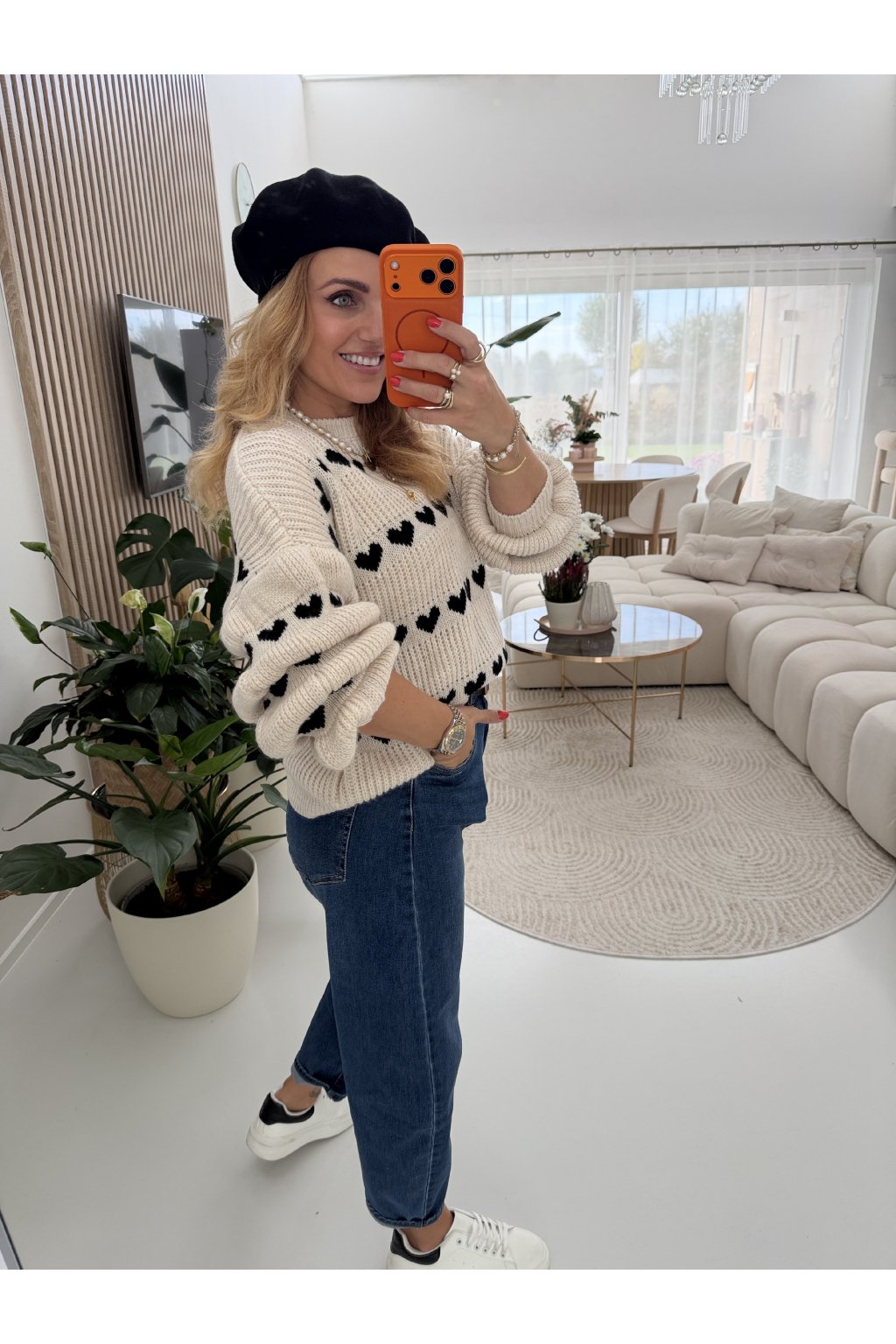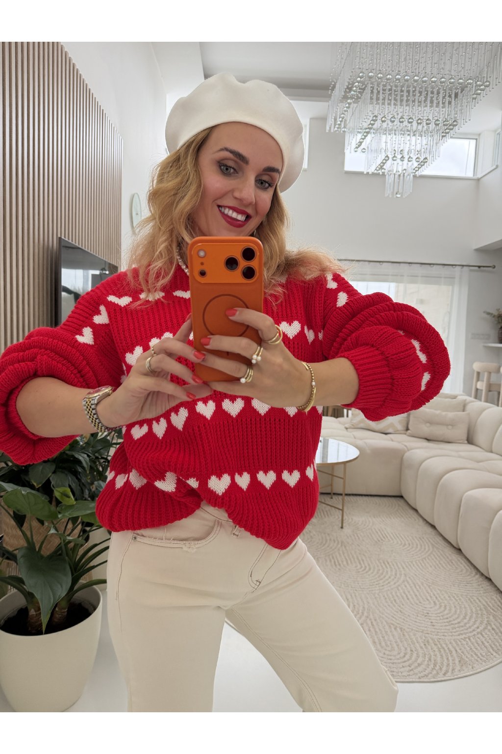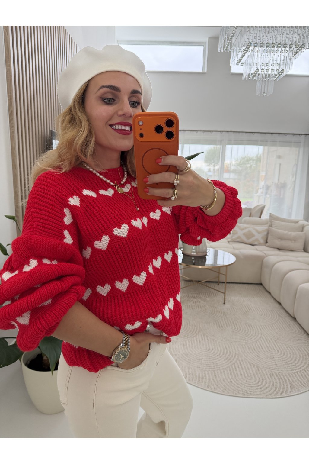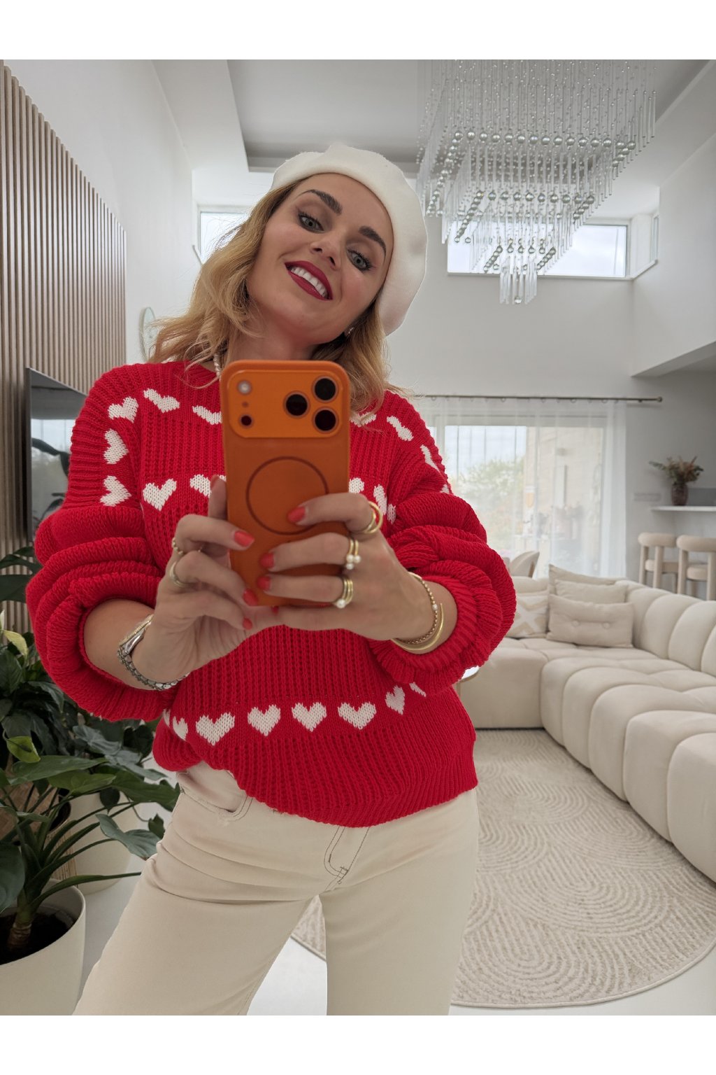 Roztomilý, hřejivý a maximálně stylový! Tento pletený svetr se vzorem srdíček si tě získá na první pohled. Má balónové rukávy s jemným žebrováním a volnější střih, který působí ležérně, ale stále žensky. Je vyroben z měkkého, příjemného materiálu, který nekouše a krásně drží tvar. Ideální k džínům, sukni nebo koženkovým kalhotám – zkrátka must-have kousek pro podzim a zimu.