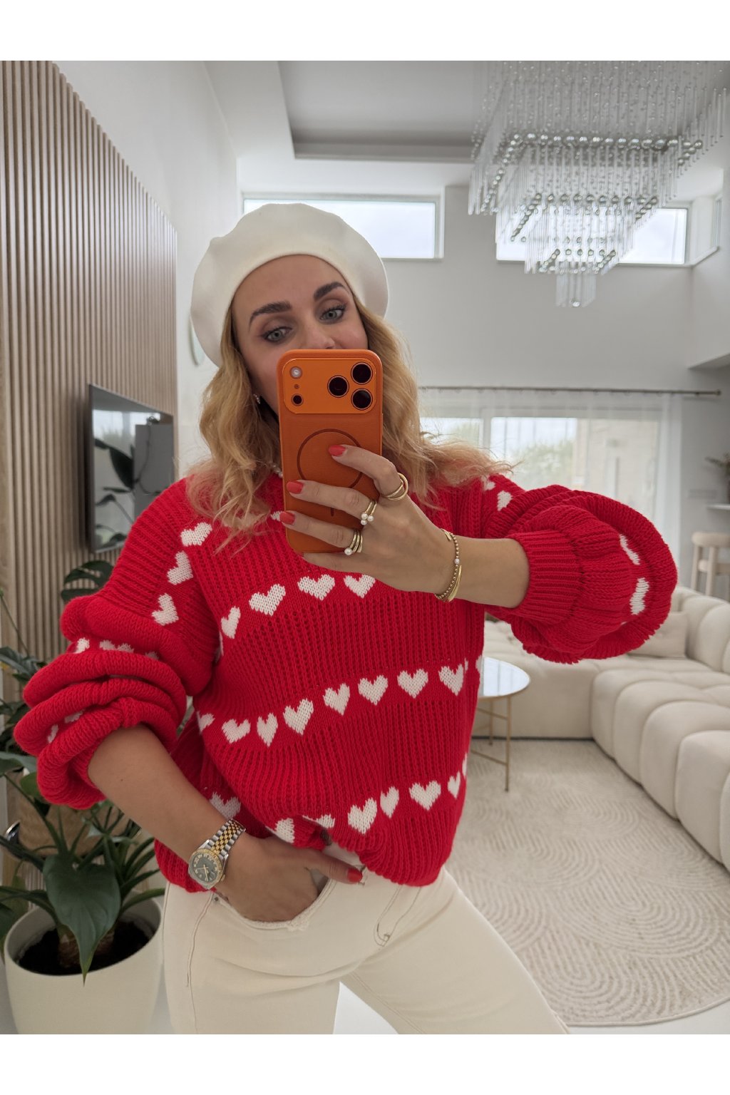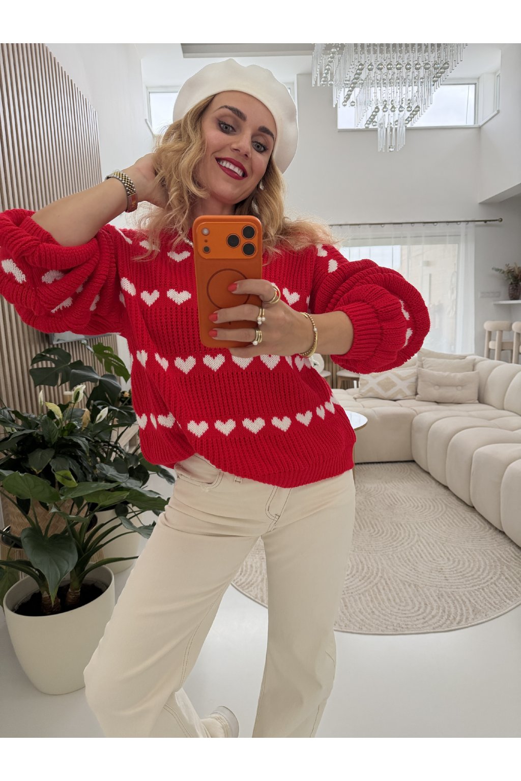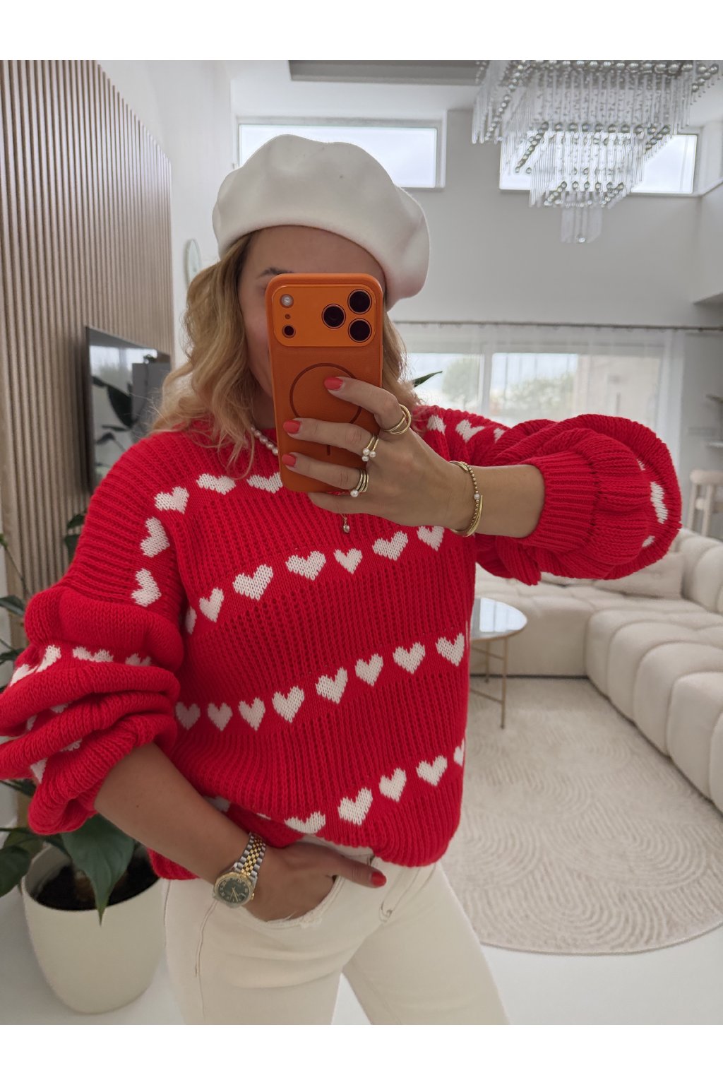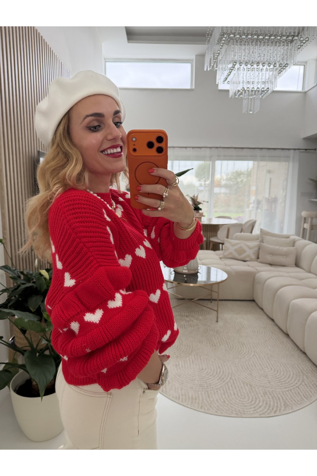Roztomilý, hřejivý a maximálně stylový! Tento pletený svetr se vzorem srdíček si tě získá na první pohled. Má balónové rukávy s jemným žebrováním a volnější střih, který působí ležérně, ale stále žensky. Je vyroben z měkkého, příjemného materiálu, který nekouše a krásně drží tvar. Ideální k džínům, sukni nebo koženkovým kalhotám – zkrátka must-have kousek pro podzim a zimu.