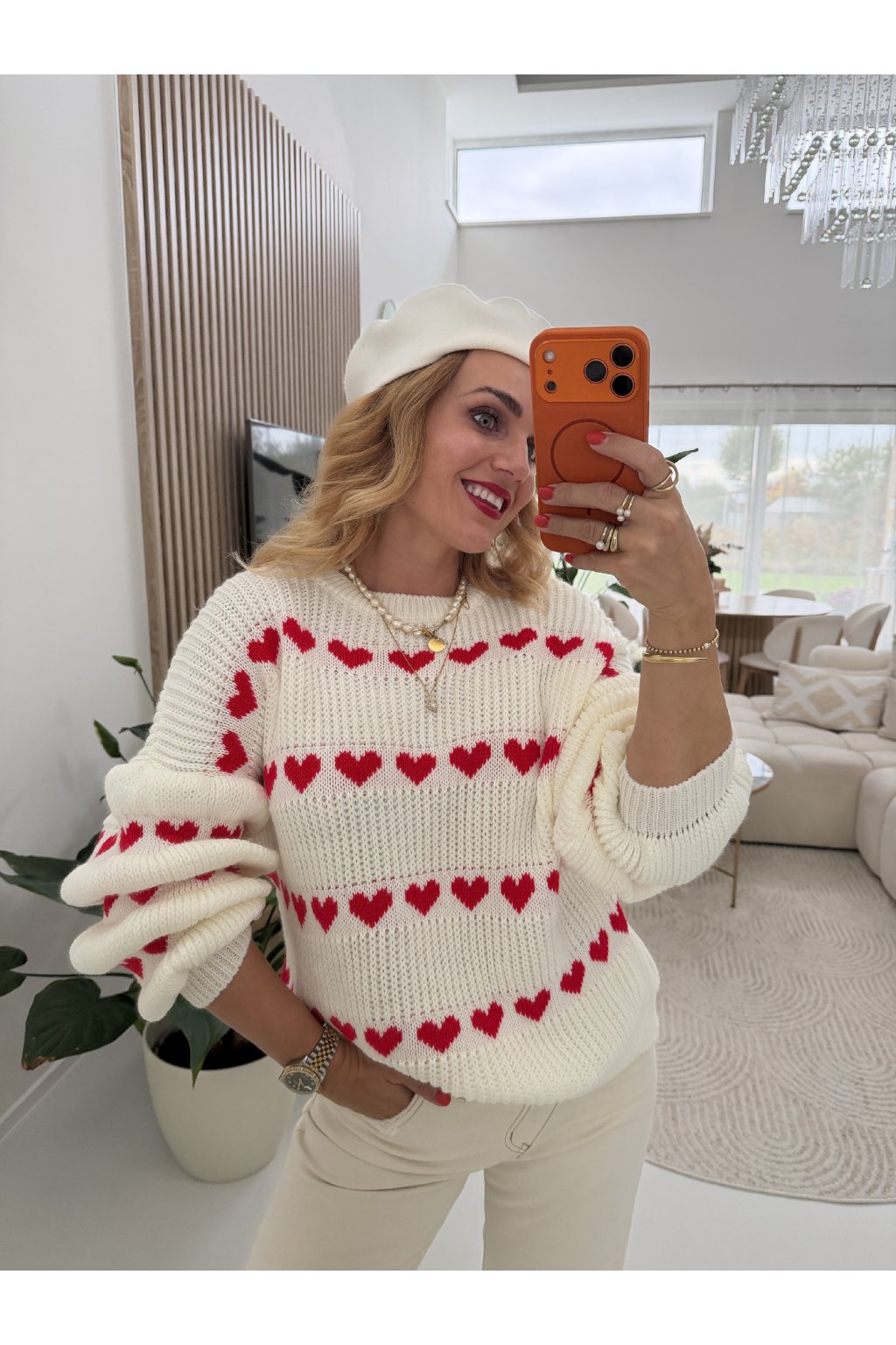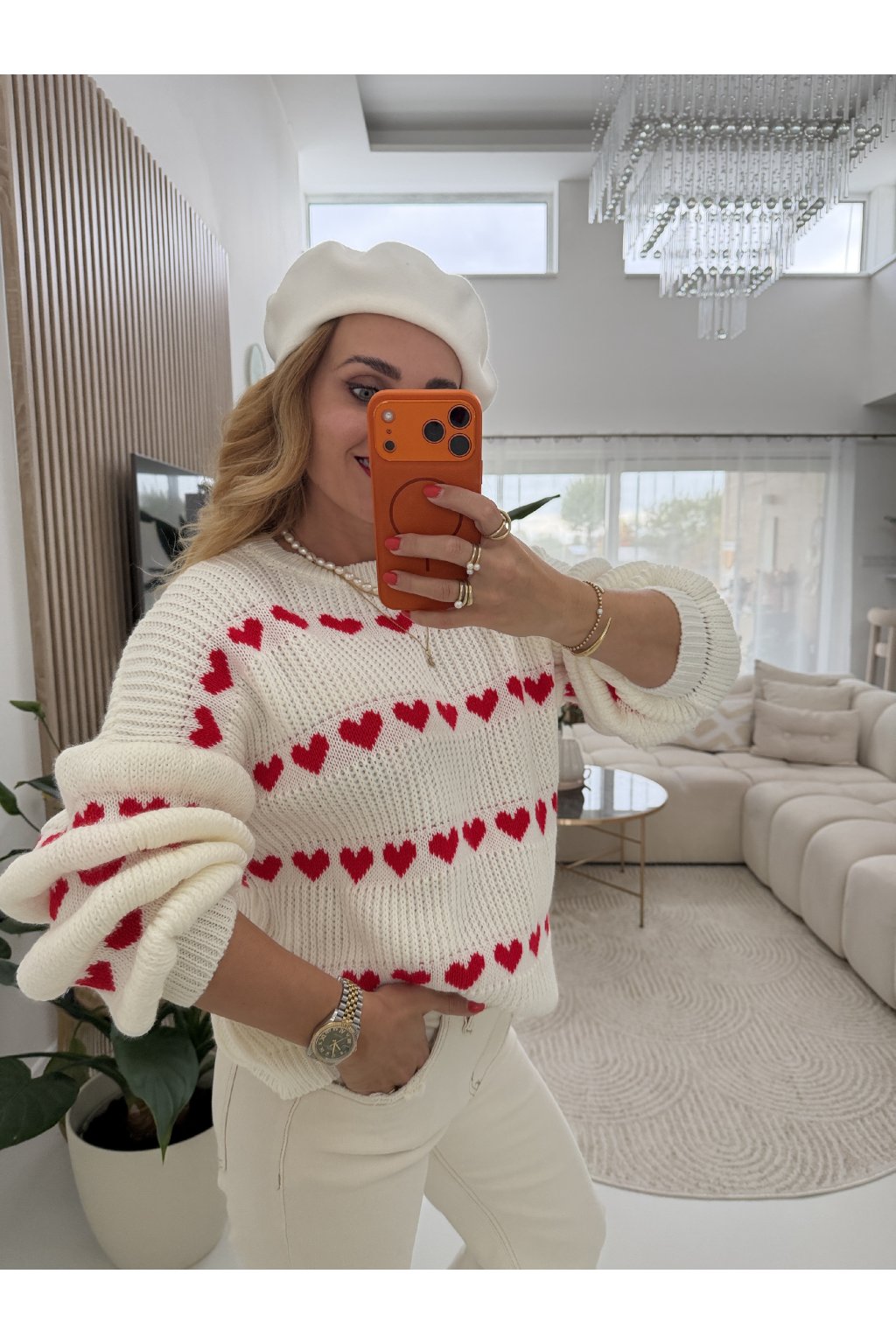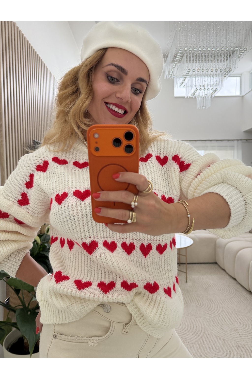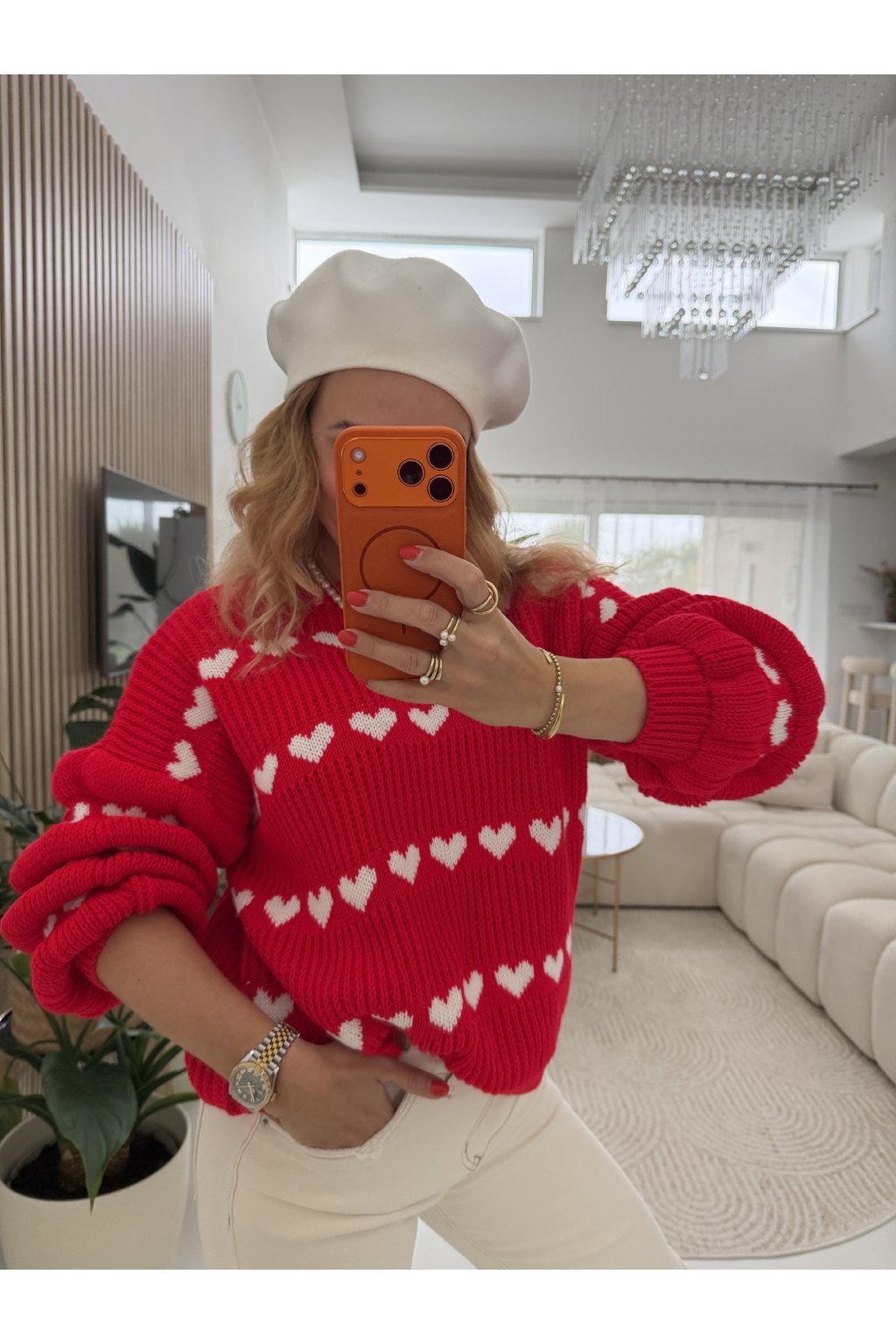 Roztomilý, hřejivý a maximálně stylový! Tento pletený svetr se vzorem srdíček si tě získá na první pohled. Má balónové rukávy s jemným žebrováním a volnější střih, který působí ležérně, ale stále žensky. Je vyroben z měkkého, příjemného materiálu, který nekouše a krásně drží tvar. Ideální k džínům, sukni nebo koženkovým kalhotám – zkrátka must-have kousek pro podzim a zimu.