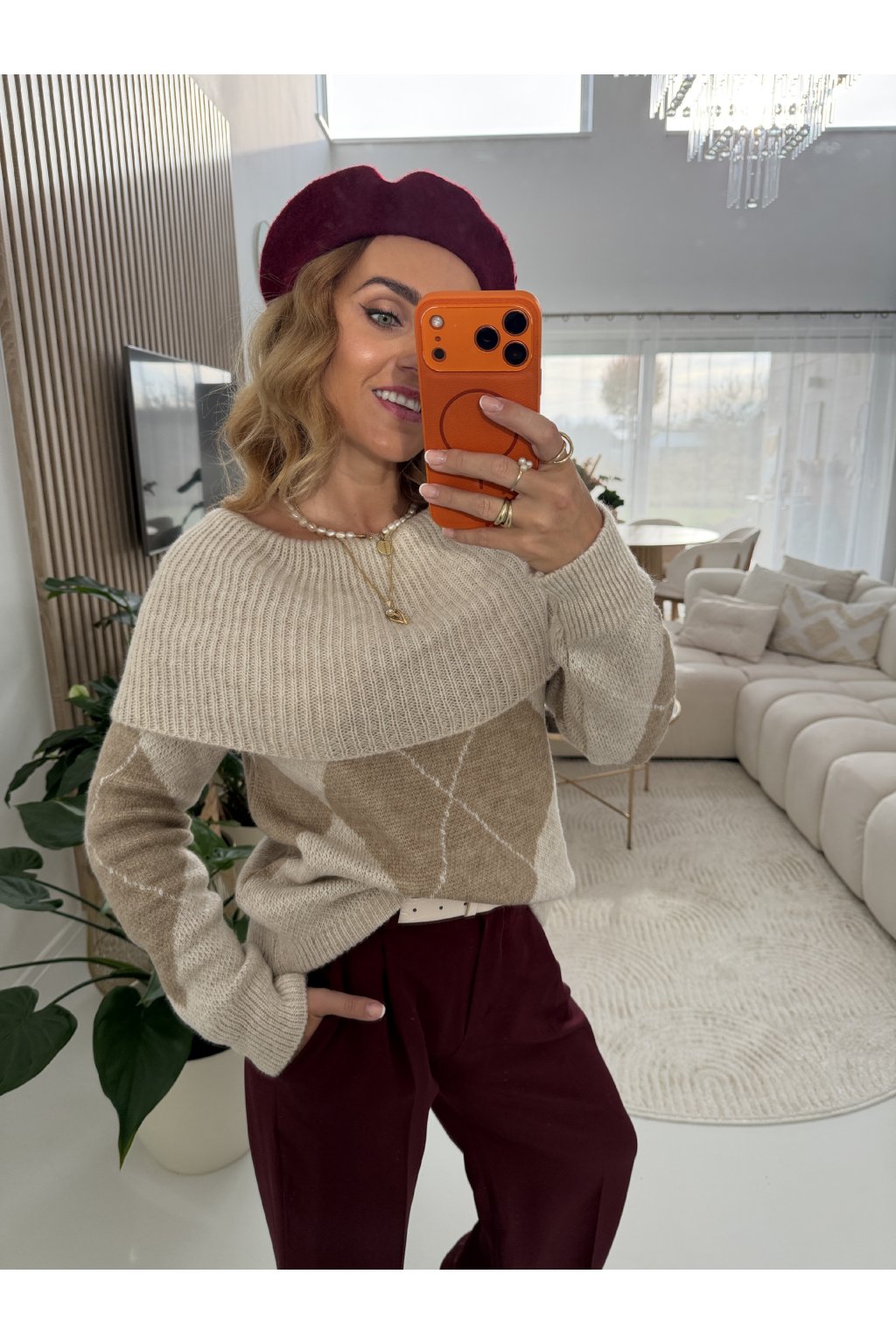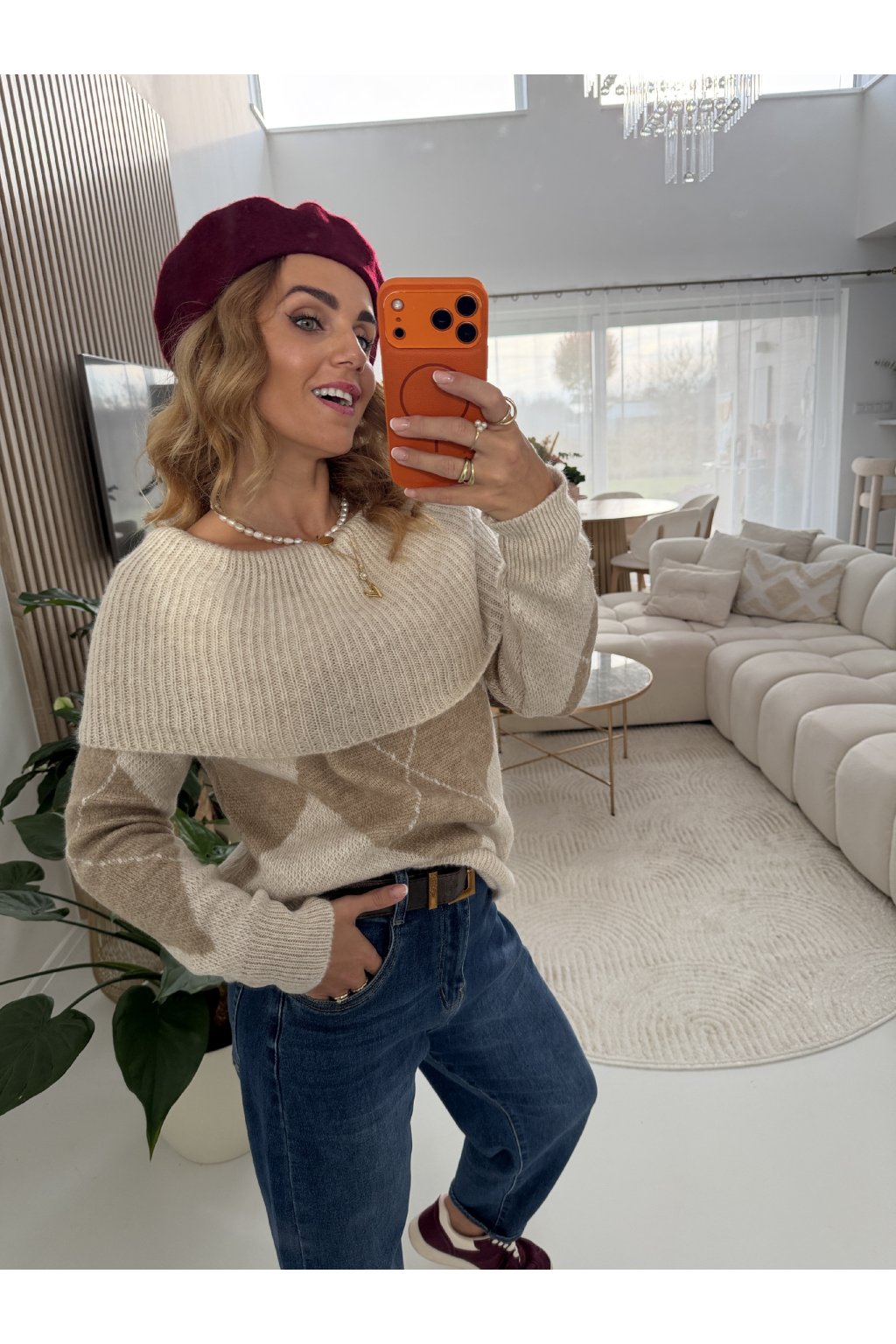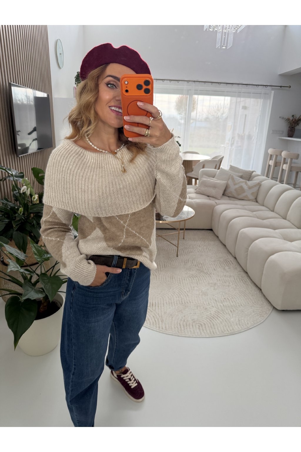 Má příjemný volný střih, jemný žebrovaný úplet a elegantní geometrický vzor v neutrálních tónech. Výstřih lze nosit klasicky nebo ležérně spadlý přes ramena – ideální pro ženský, chic vzhled. Sedne nejlépe na S a M. Pro představu měřím 163cm a vážím 60kg.