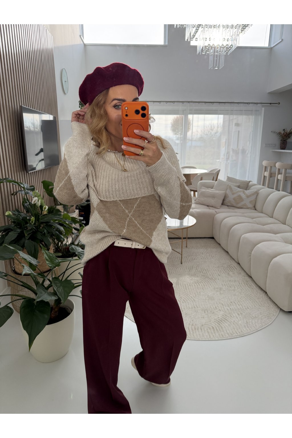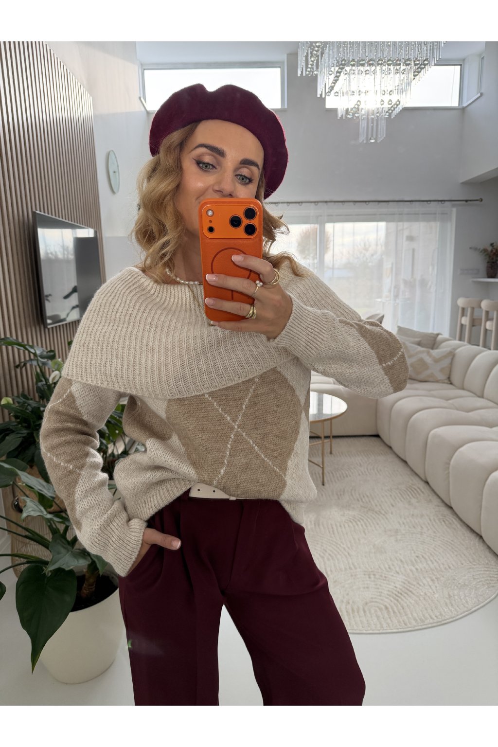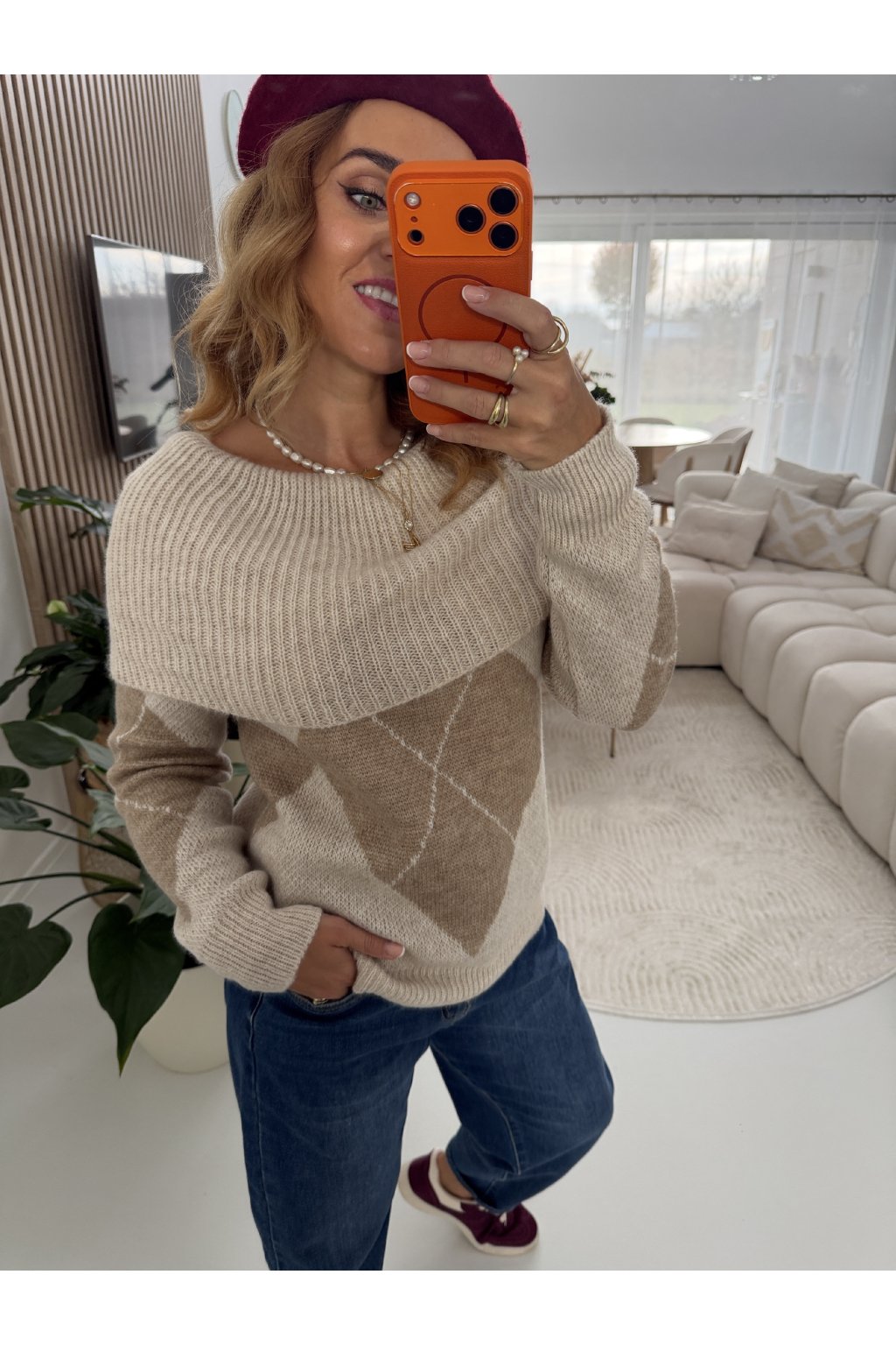 Má příjemný volný střih, jemný žebrovaný úplet a elegantní geometrický vzor v neutrálních tónech. Výstřih lze nosit klasicky nebo ležérně spadlý přes ramena – ideální pro ženský, chic vzhled. Sedne nejlépe na S a M. Pro představu měřím 163cm a vážím 60kg.