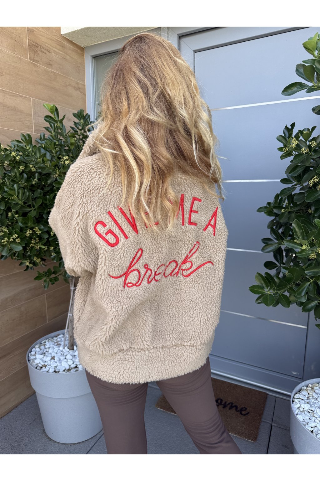 • Detaily: dvě velké přední kapsy, zapínání na zip, výšivka „GIVE ME A BREAK“ na zádech a drobný nápis vpředu.