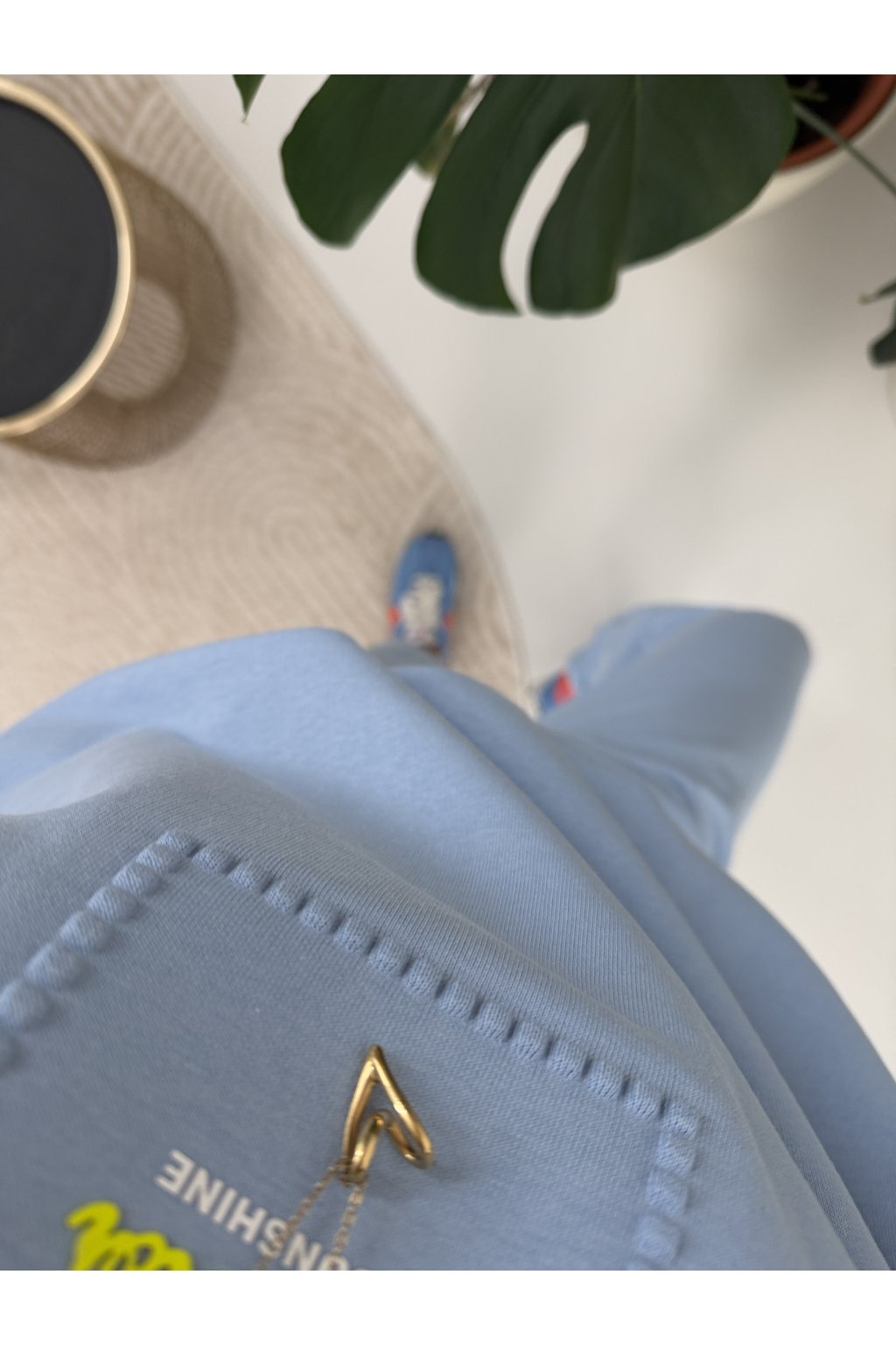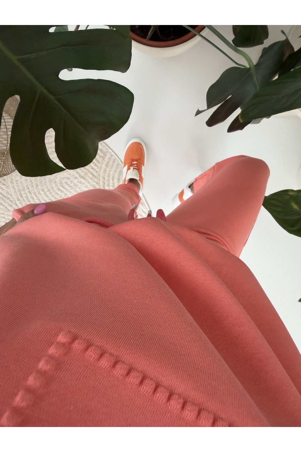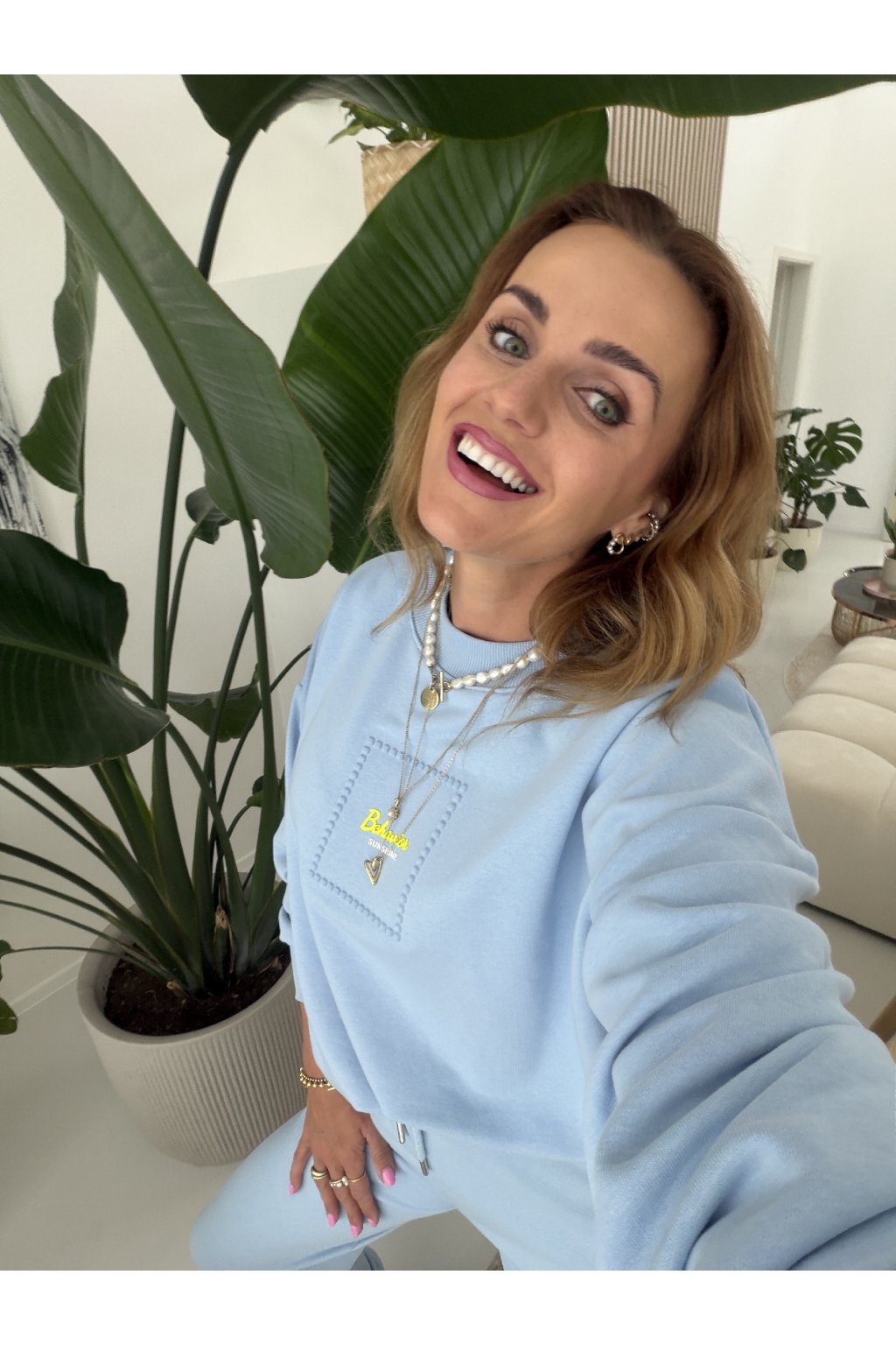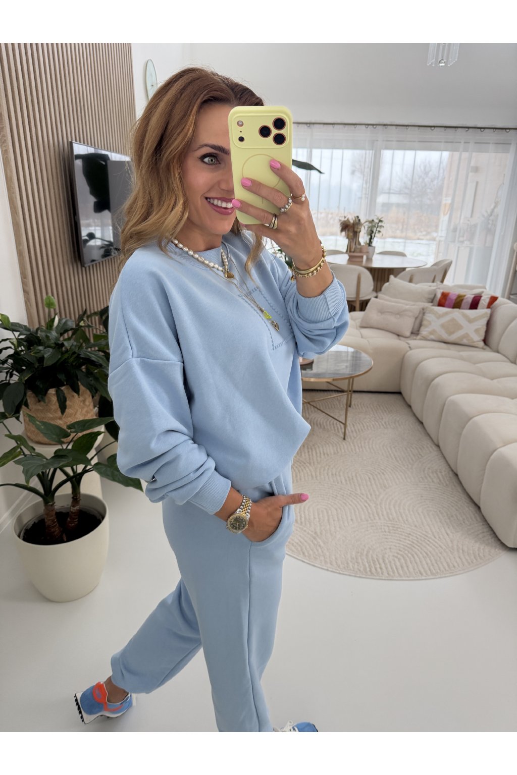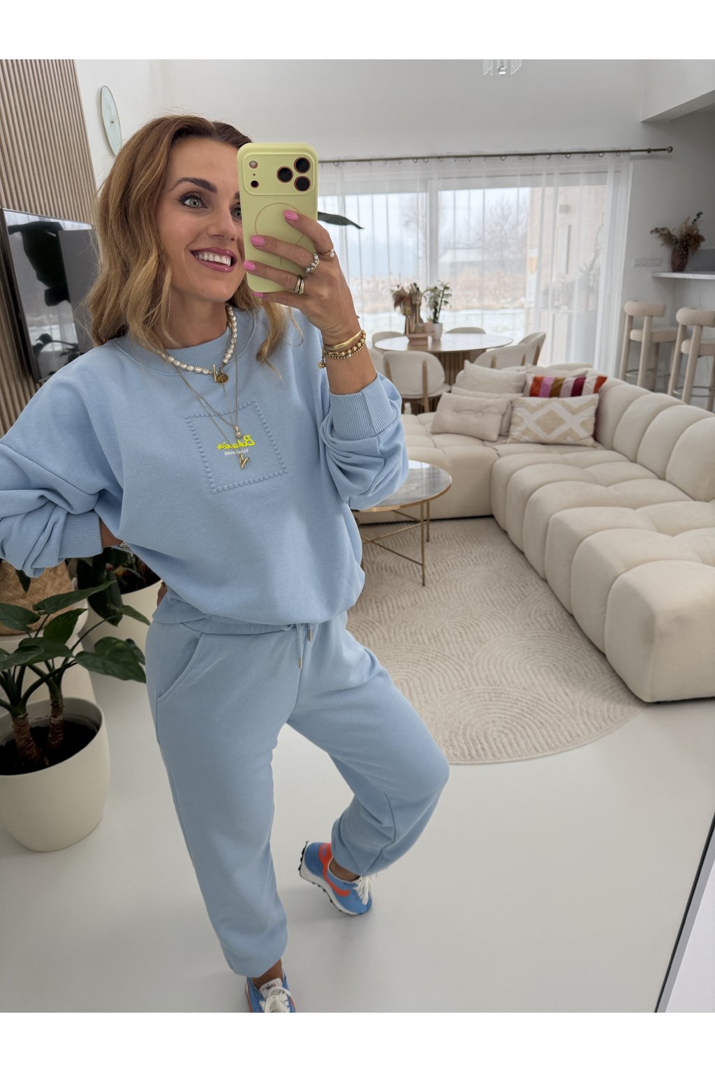 Mikina má komfortní střih bez zapínání, zakončený pružnými lemy, díky kterým krásně sedí a působí upraveně. Minimalistický detail na hrudi dodává soupravě jemný, ženský akcent a nadčasový vzhled.