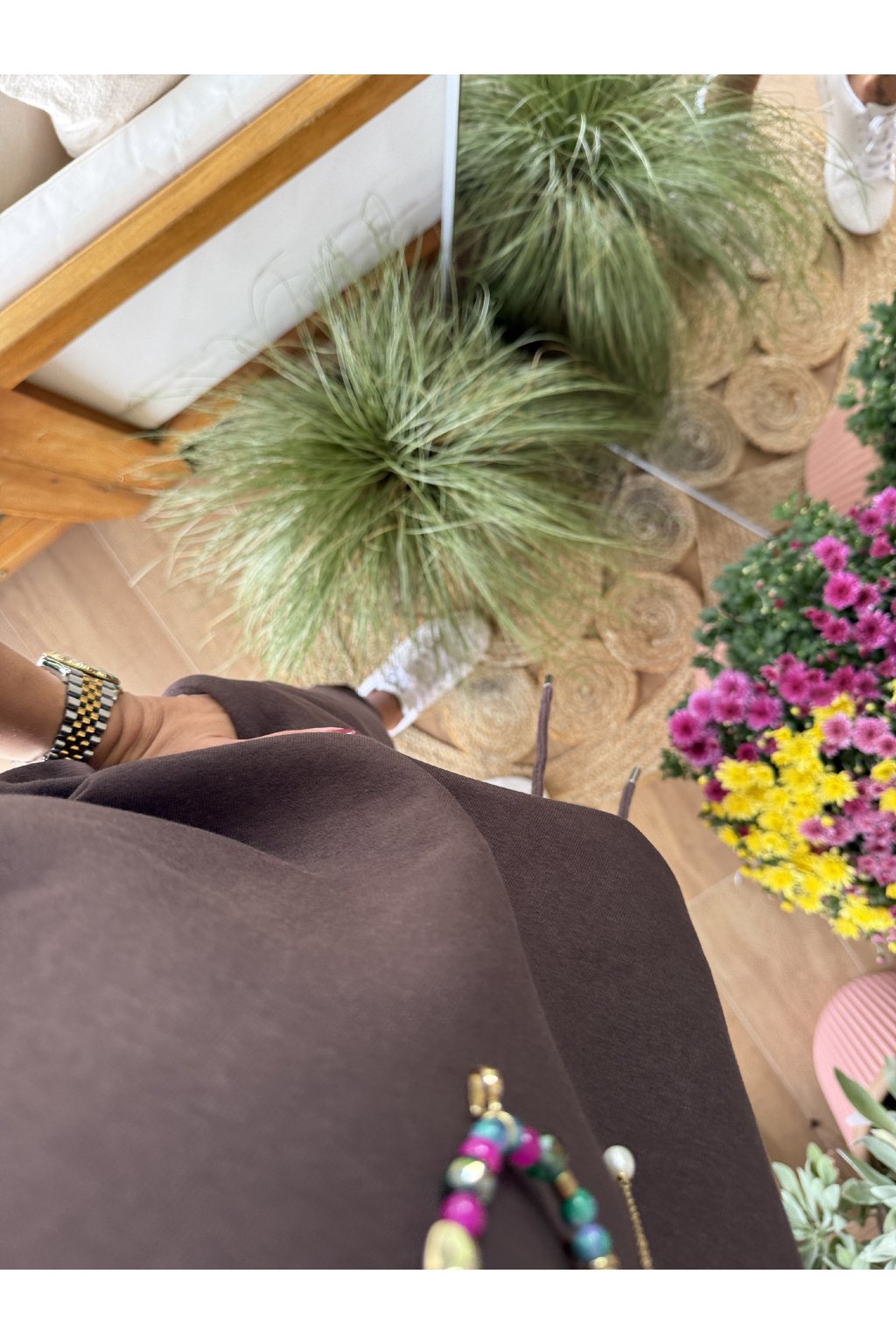 Tato jedinečná tepláková souprava spojuje pohodlí volného střihu s originálním designem. Dominantním prvkem jsou stylové třásně na rukávech, které dodají outfitu hravost, lehkost a šmrnc. Díky oversize mikině a gumě v pase sedne od velikosti S až do velikosti L. Pro představu měřím 163cm a vážím 60kg.