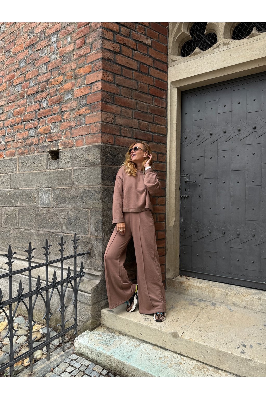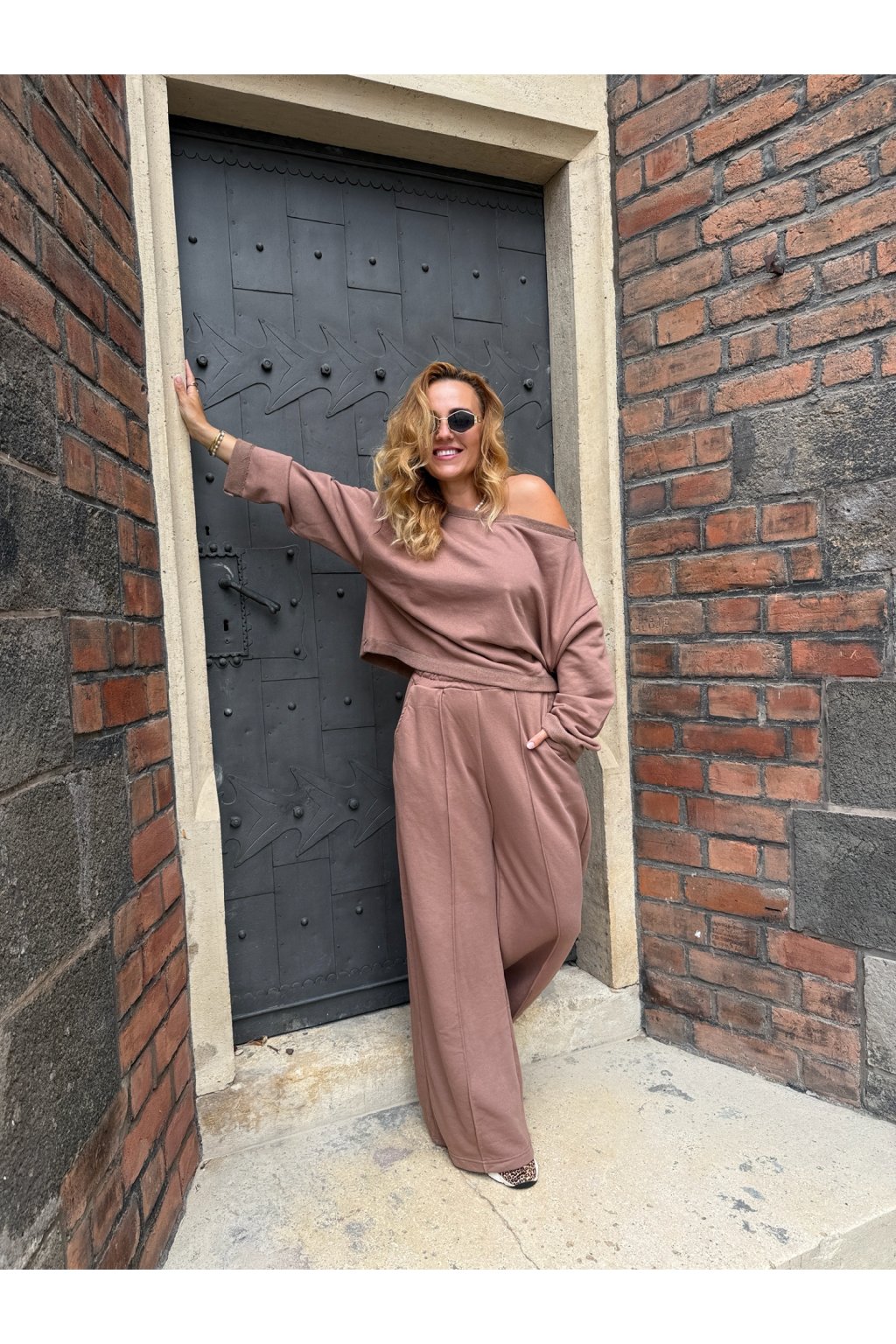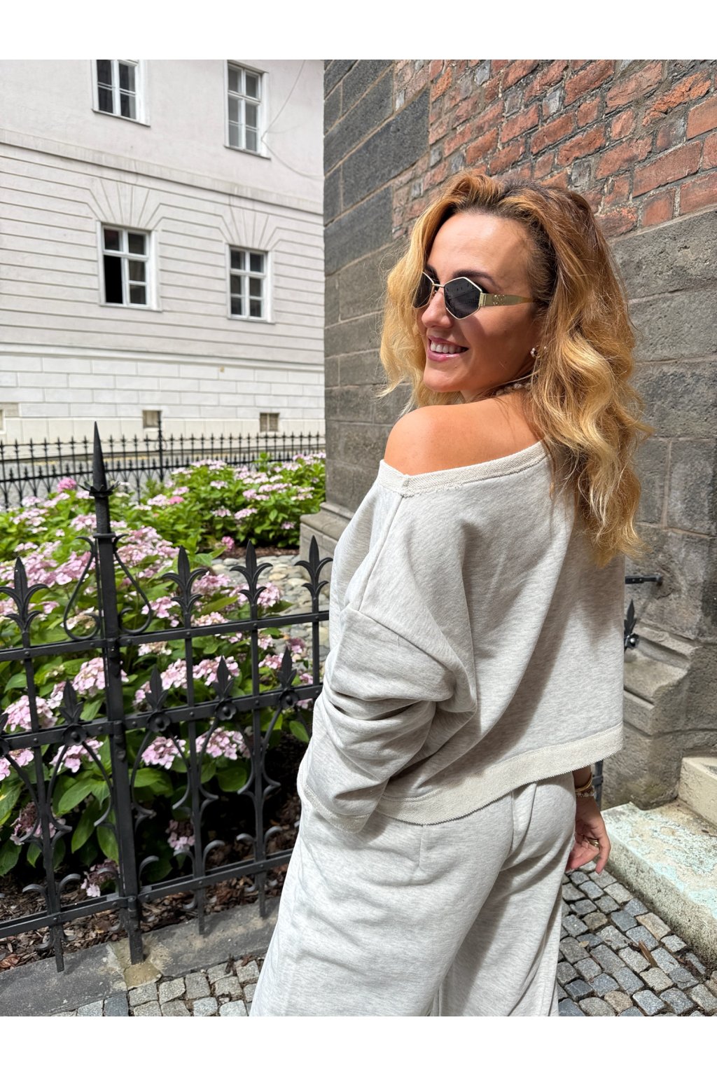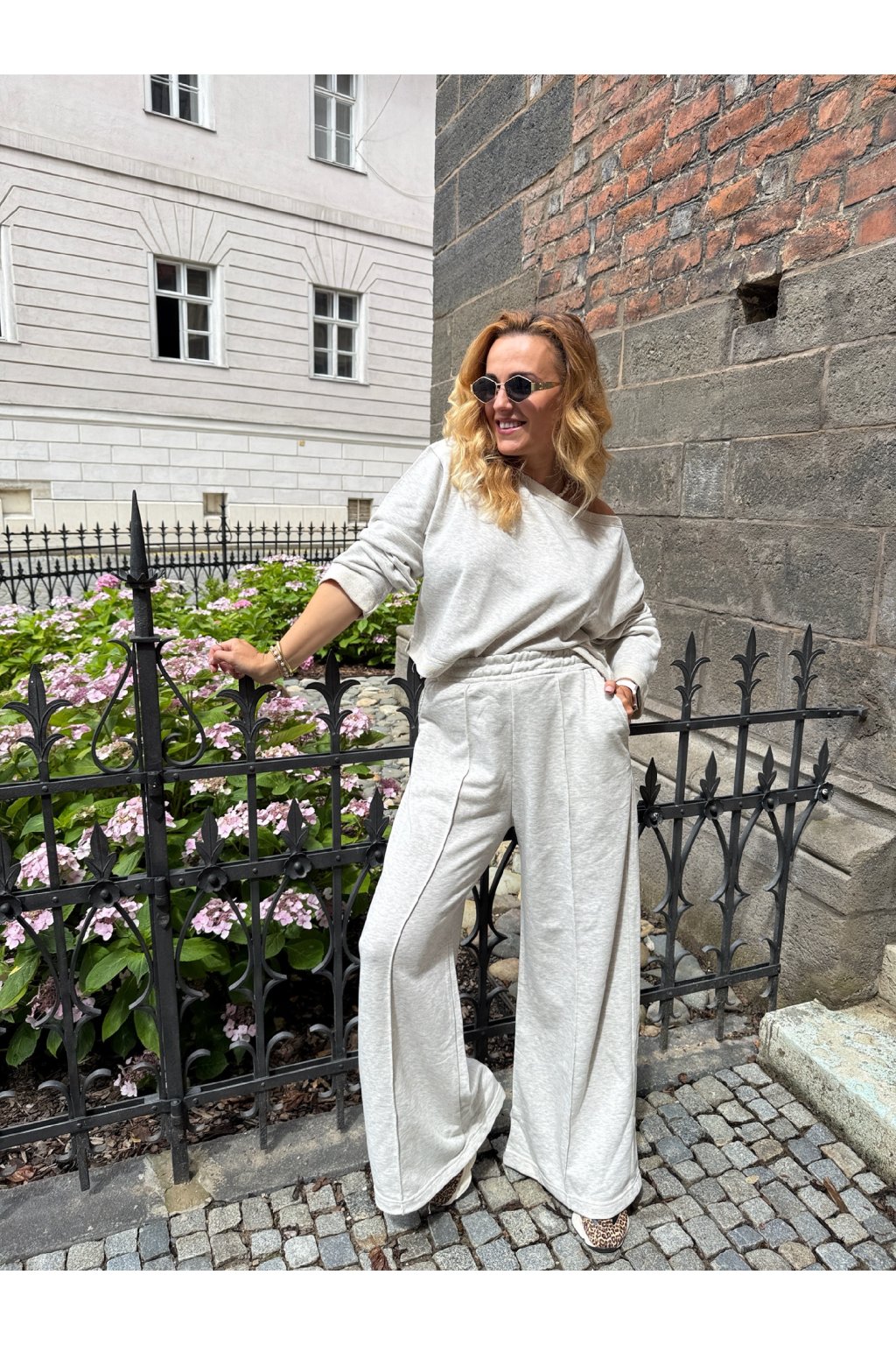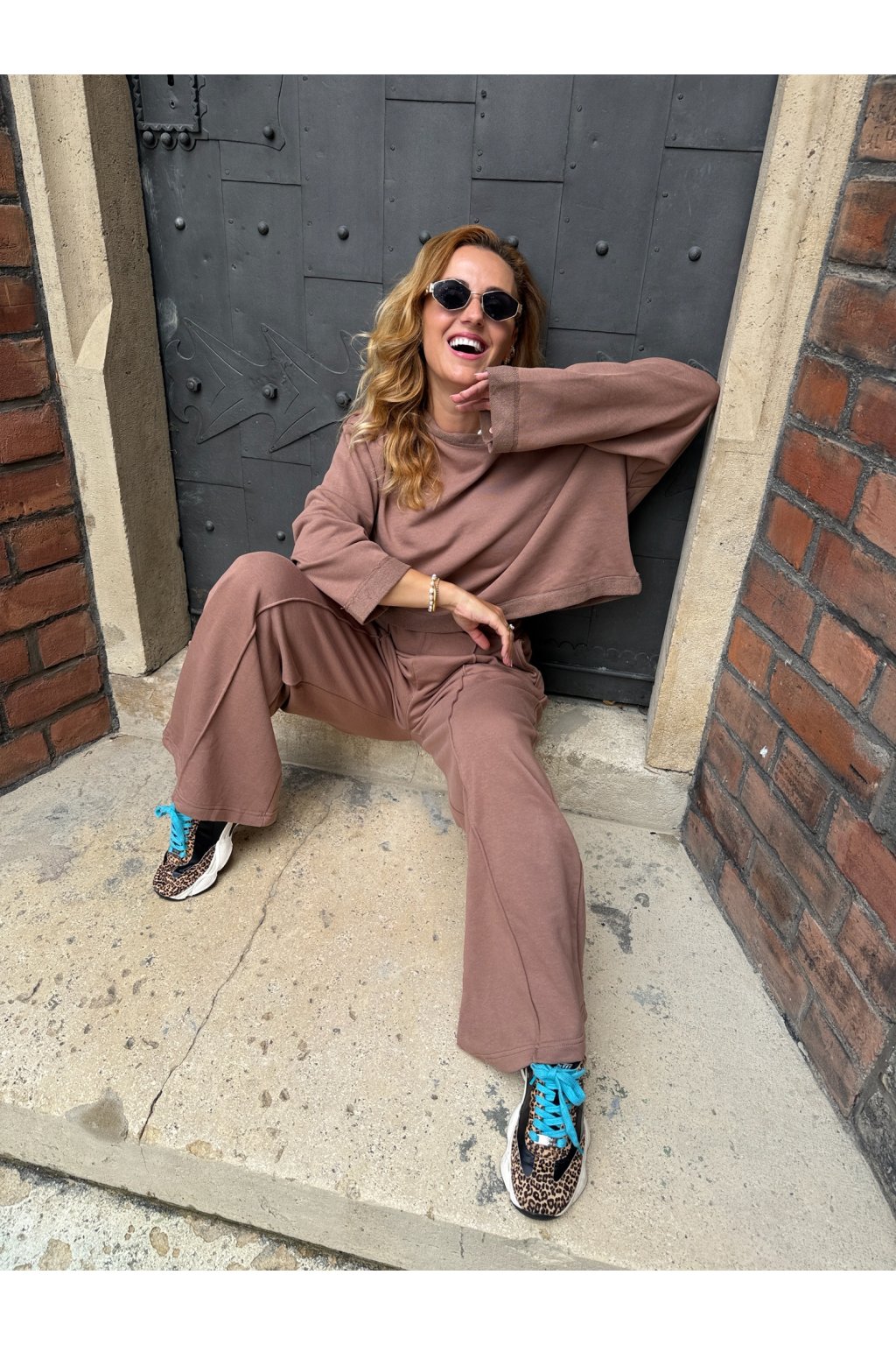 Teplákovka SIMPLE DAY. Je z vysokogramážní bavlny. Kalhoty mají na přední straně puky, střih je rovný a široký. V pase je pružná guma, po bocích jsou kapsy. Top je dost oversize a vypadá dobře i s jedním spadlým ramenem. Sedne nejlépe na S a M, ale vleze se do ní i menší velikost L. Pro představu měřím 163cm a vážím 62kg.