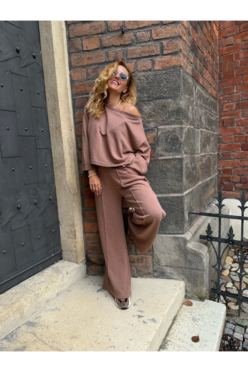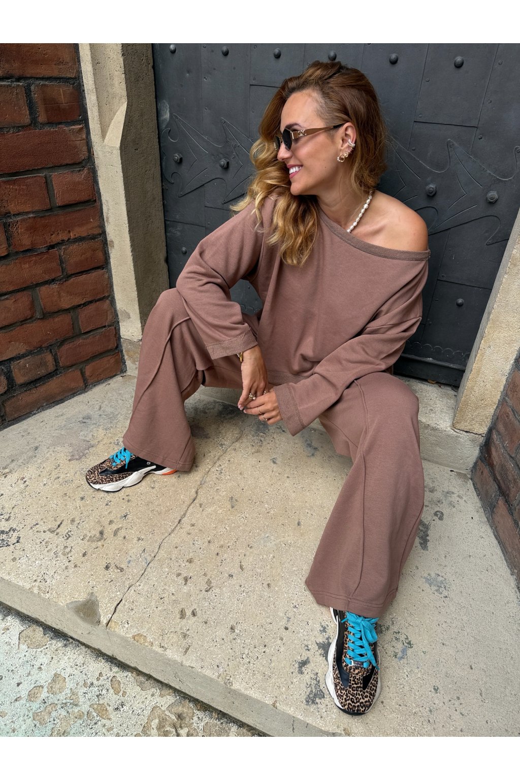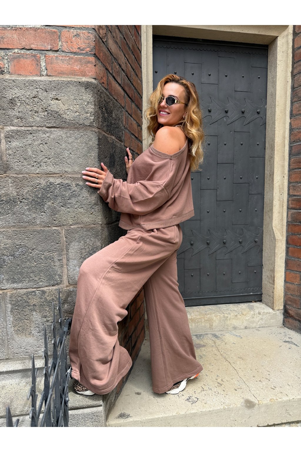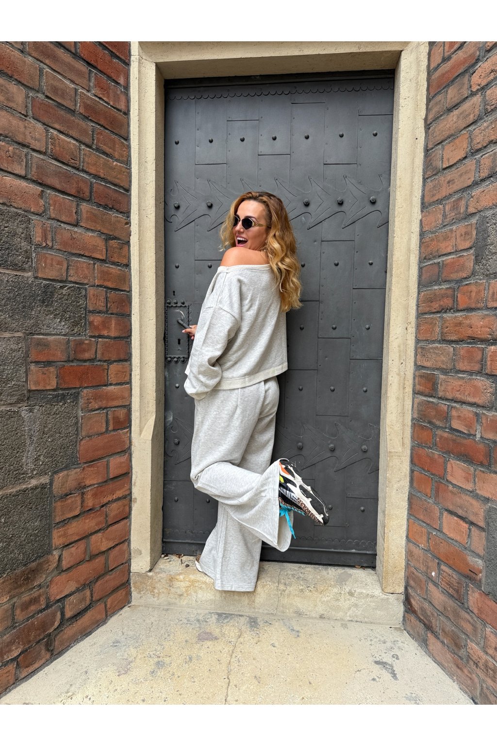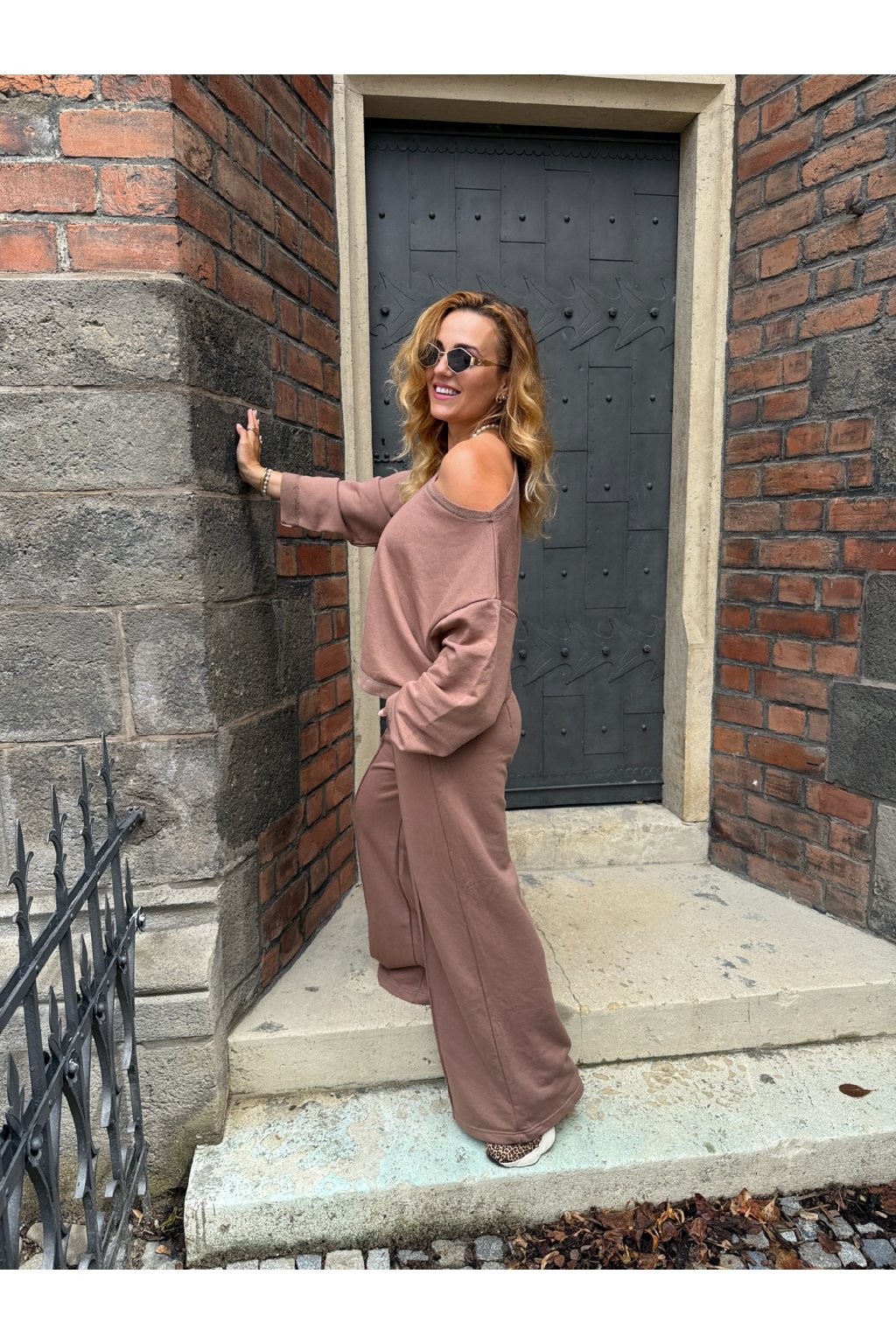 Teplákovka SIMPLE DAY. Je z vysokogramážní bavlny. Kalhoty mají na přední straně puky, střih je rovný a široký. V pase je pružná guma, po bocích jsou kapsy. Top je dost oversize a vypadá dobře i s jedním spadlým ramenem. Sedne nejlépe na S a M, ale vleze se do ní i menší velikost L. Pro představu měřím 163cm a vážím 62kg.