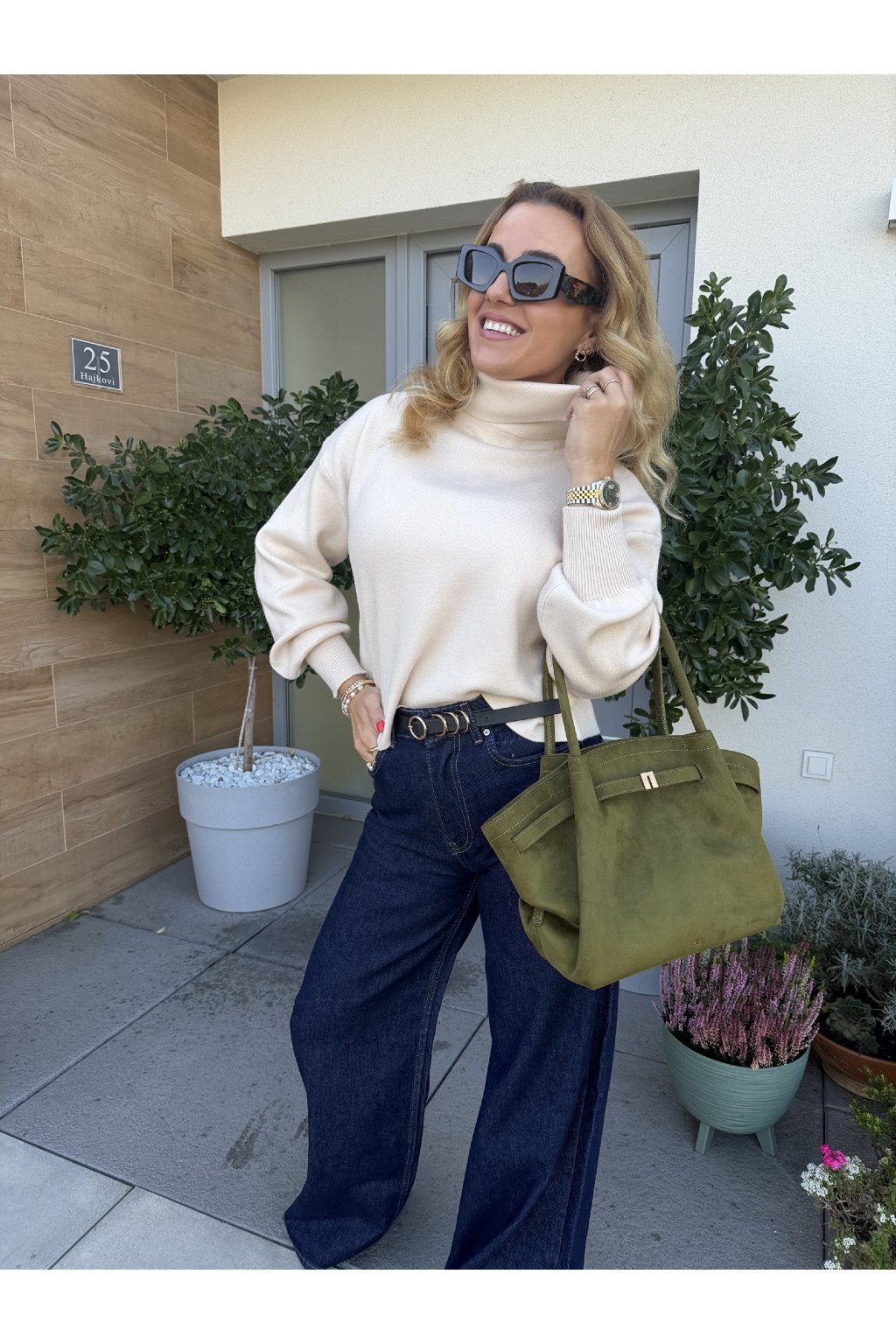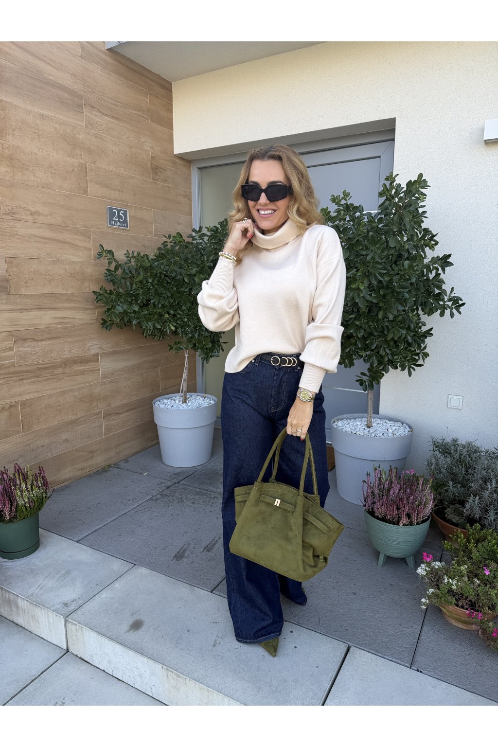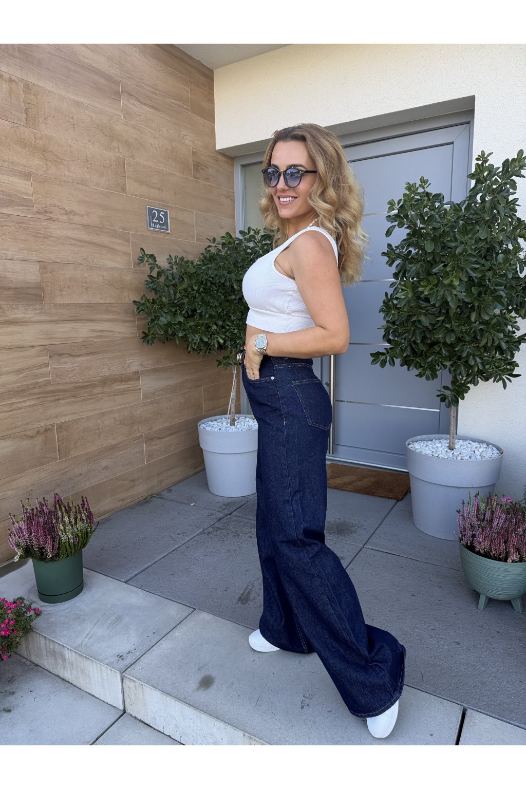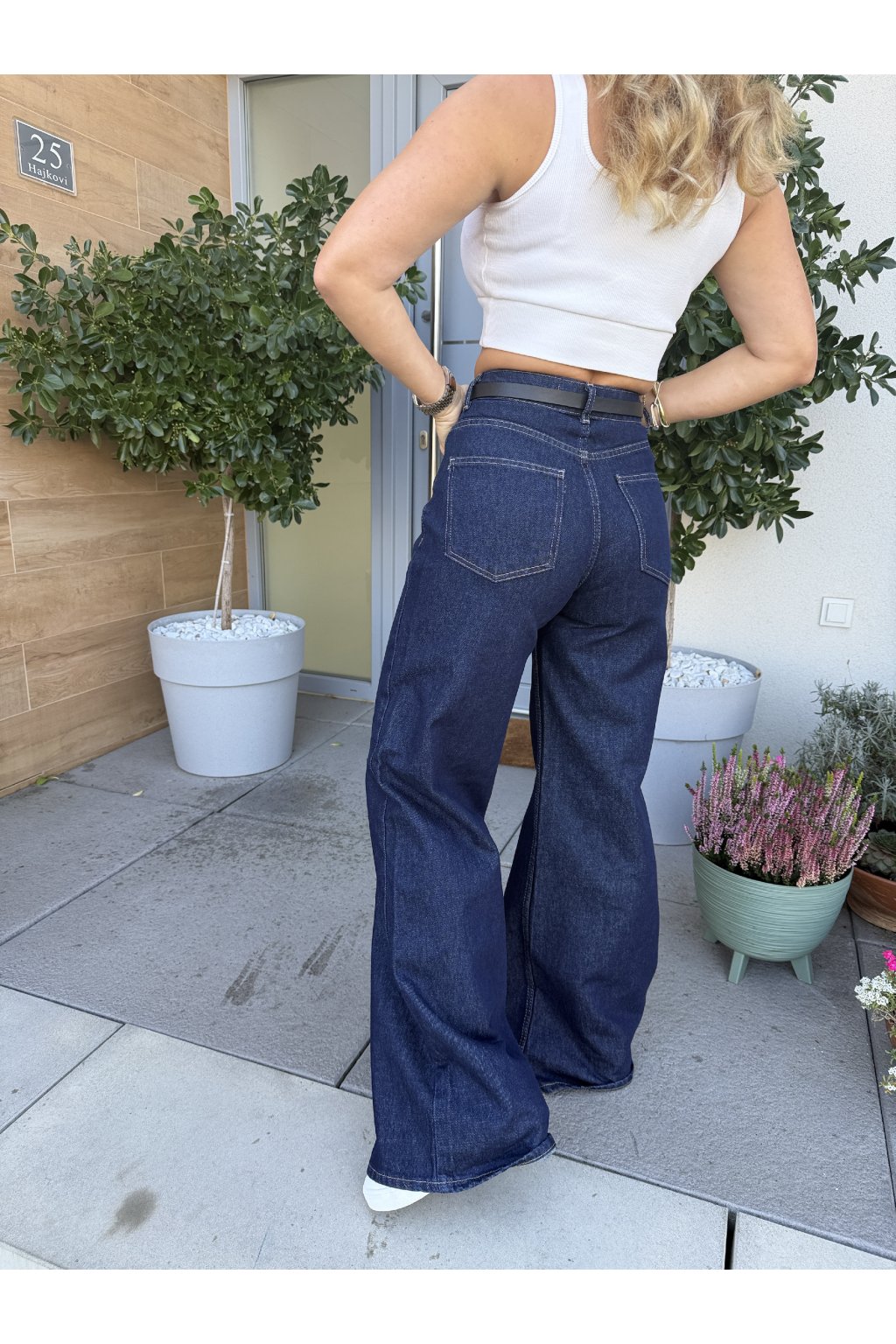 Elegantní široké džíny z prémiové džínoviny v tmavě modrém odstínu. Perfektní střih pro vyšší postavu – prodlužují nohy a krásně formují siluetu. Mají vysoký pas, vhodné na výšku 175cm. Na sobě mám velikost M. Pro představu měřím 163cm a vážím 60kg.