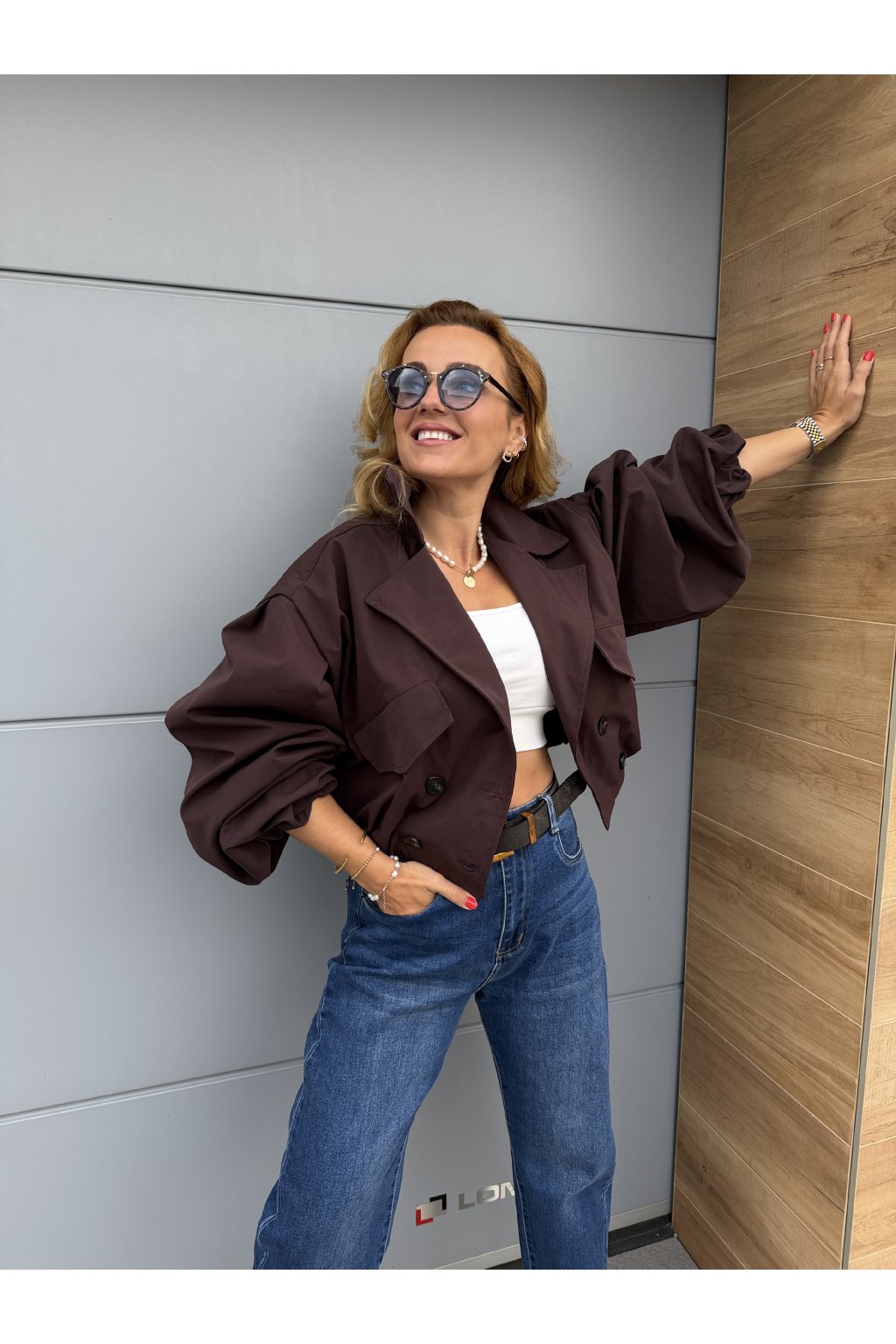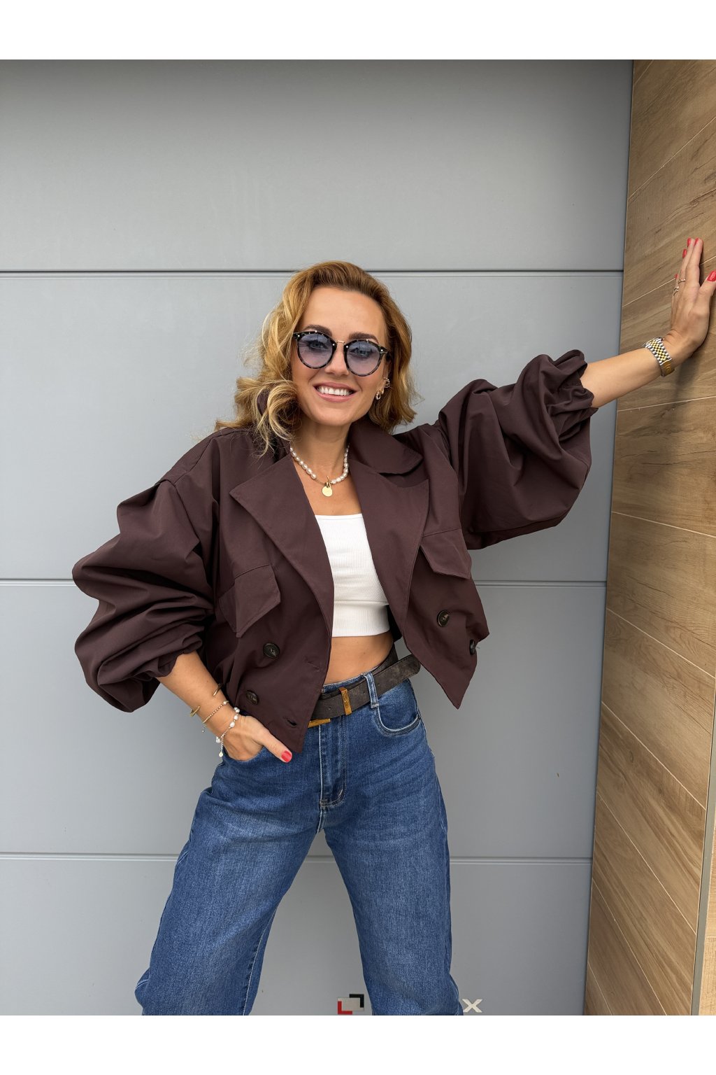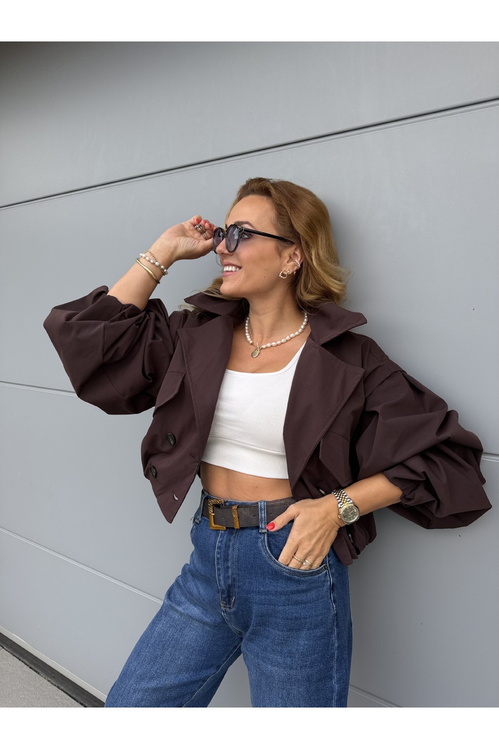 Krátký trenčkot PARIS. Zapíná se na knoflíky. Má balónové rukávy. Kolem zápěstí je pevná manžeta, ta se opakuje i kolem pasu, neprofoukne. Velikost je Onesize. Sedne od S až do menší velikosti XL. Vypadá dobře k riflím i k elegantním kalhotám.