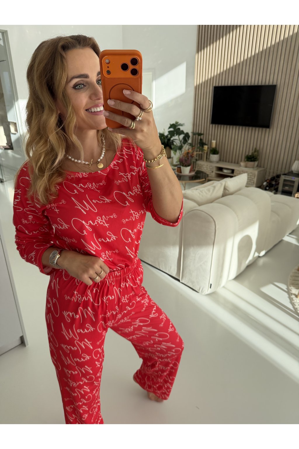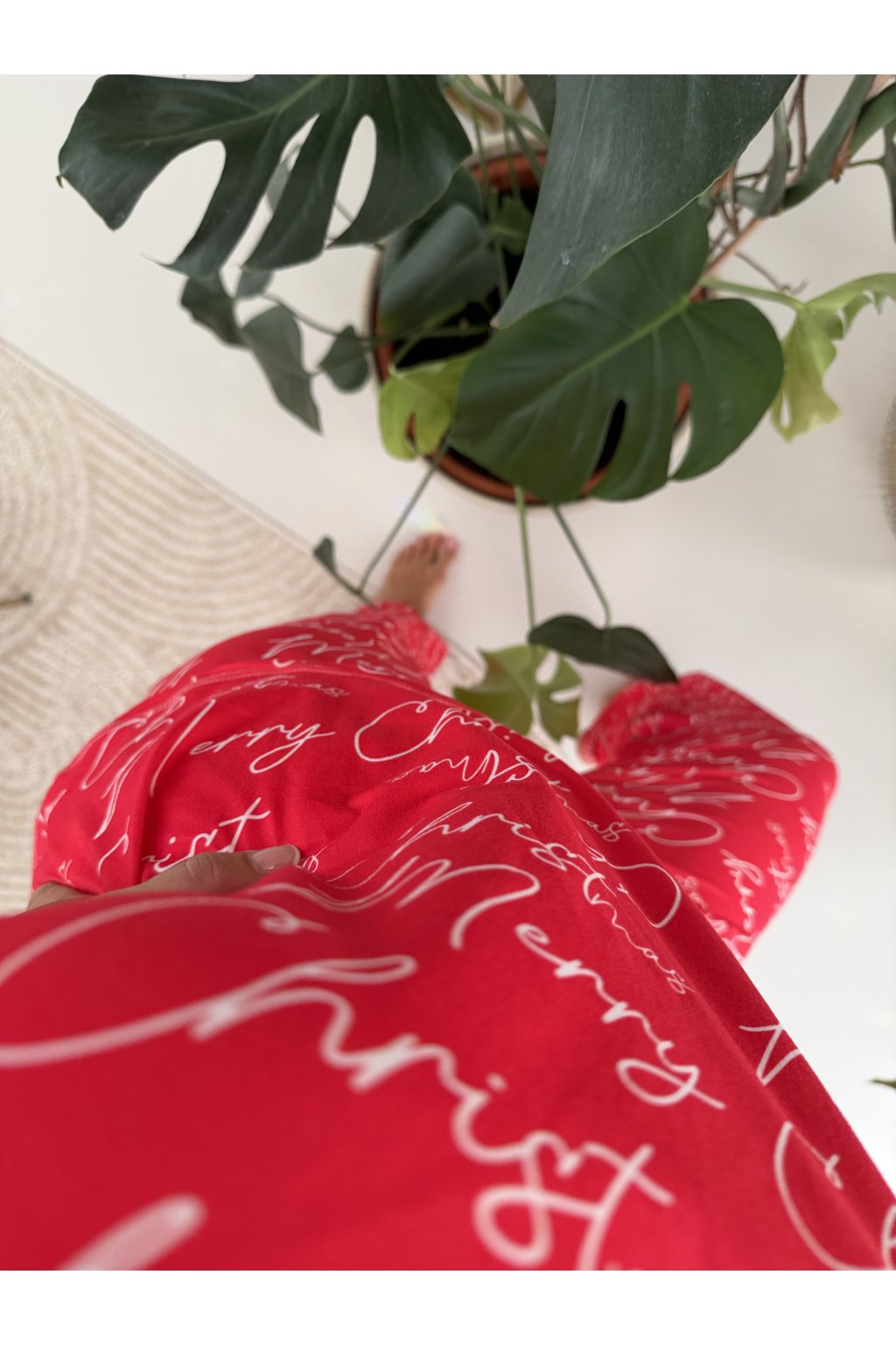 Nápis „Merry Christmas“ v elegantním písmu dodává pyžamu hravý a stylový vzhled.