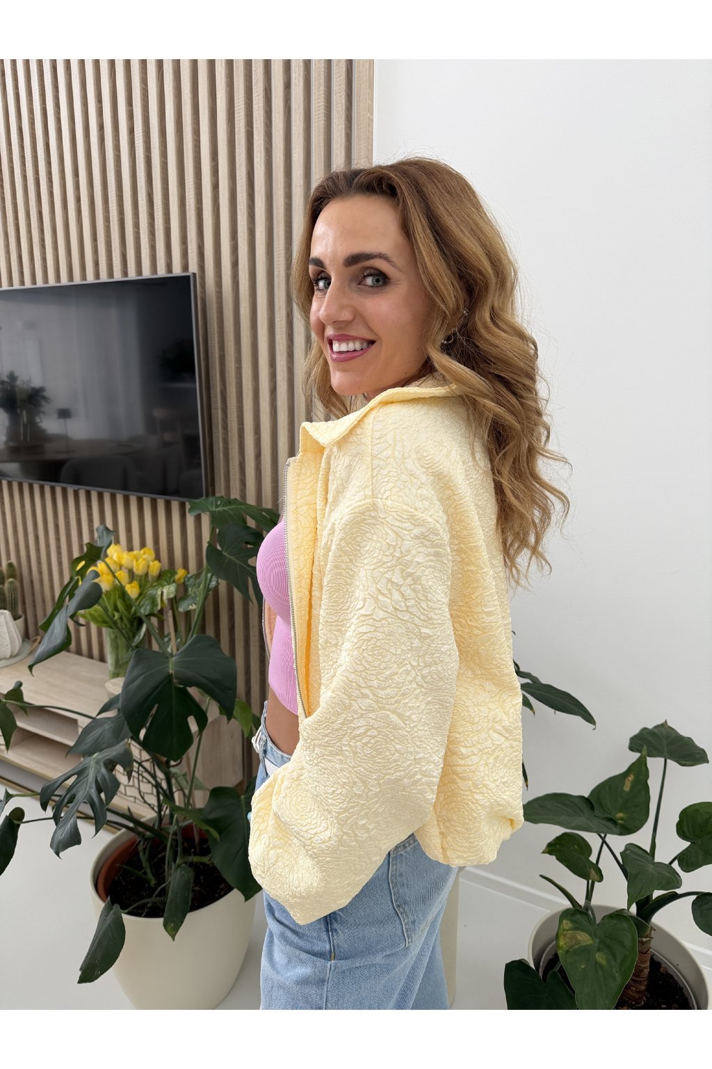 Stylový bomber LEMON BLOOM v nádherném jemně žlutém odstínu, který rozzáří každý outfit. Zaujme originální strukturovanou látkou s plastickým vzorem, která působí luxusně a zároveň je příjemná na nošení. Lehký, pohodlný a snadno kombinovatelný k džínám i sukni, ideální kousek pro svěží a moderní look. Velikost sedne nejlépe na velikost S a M.